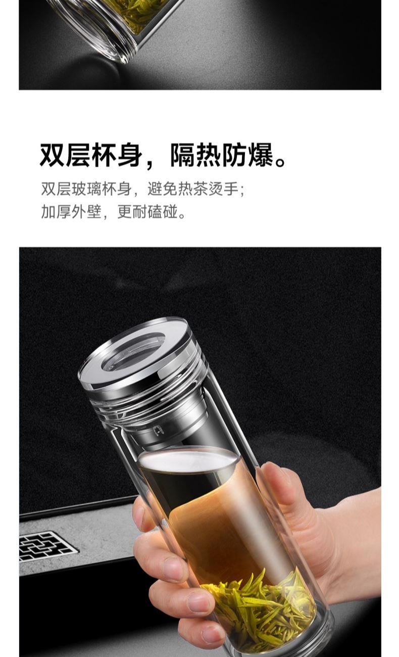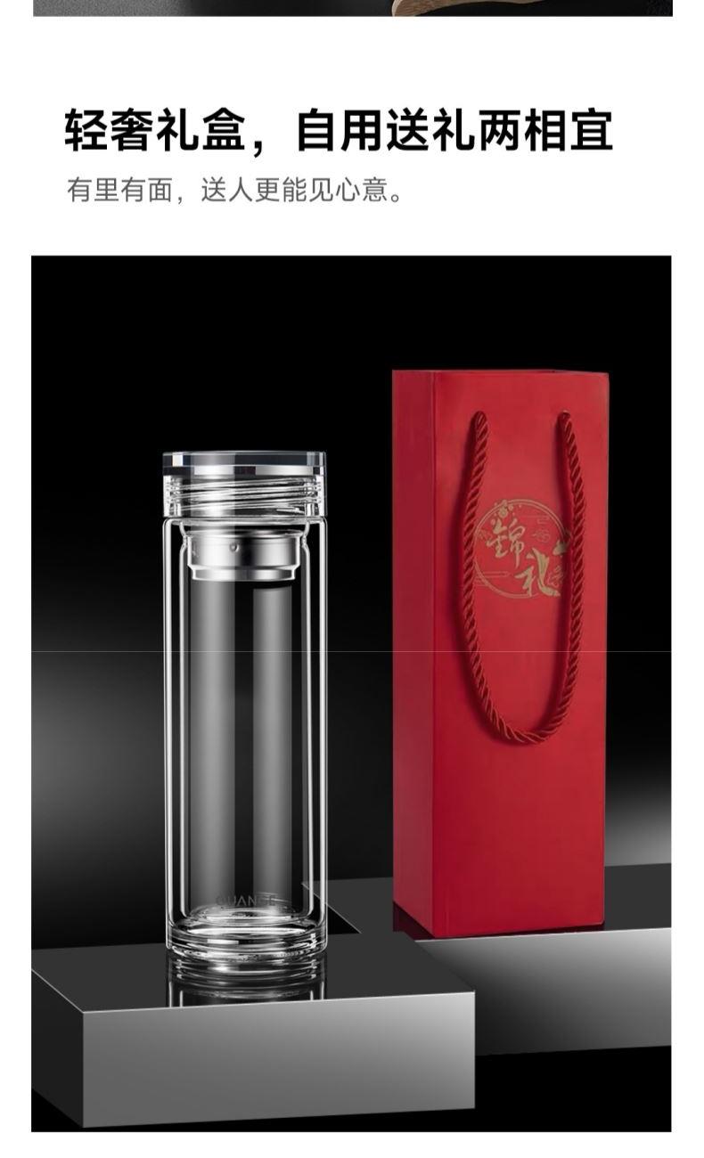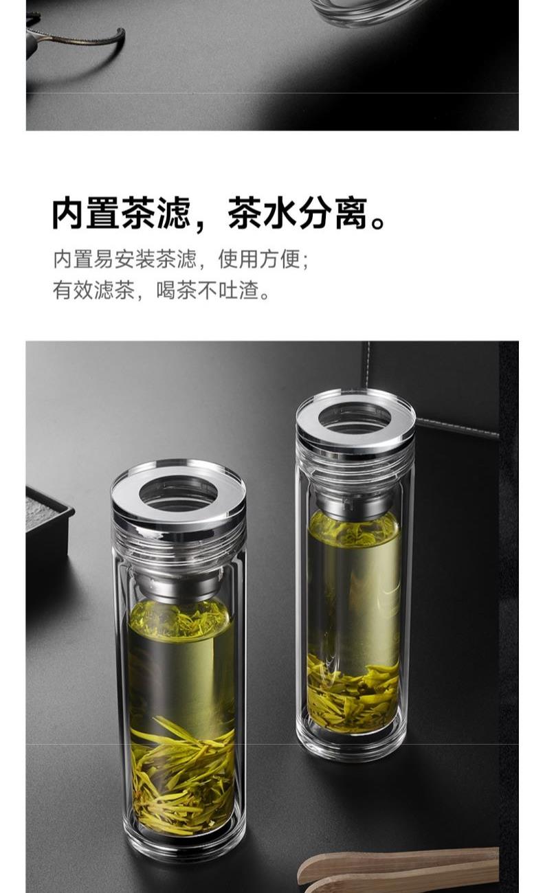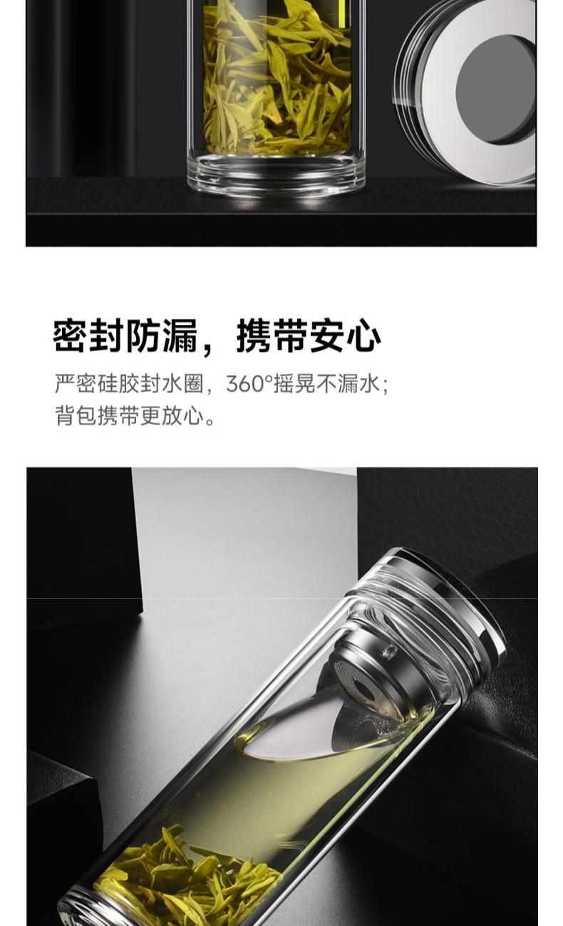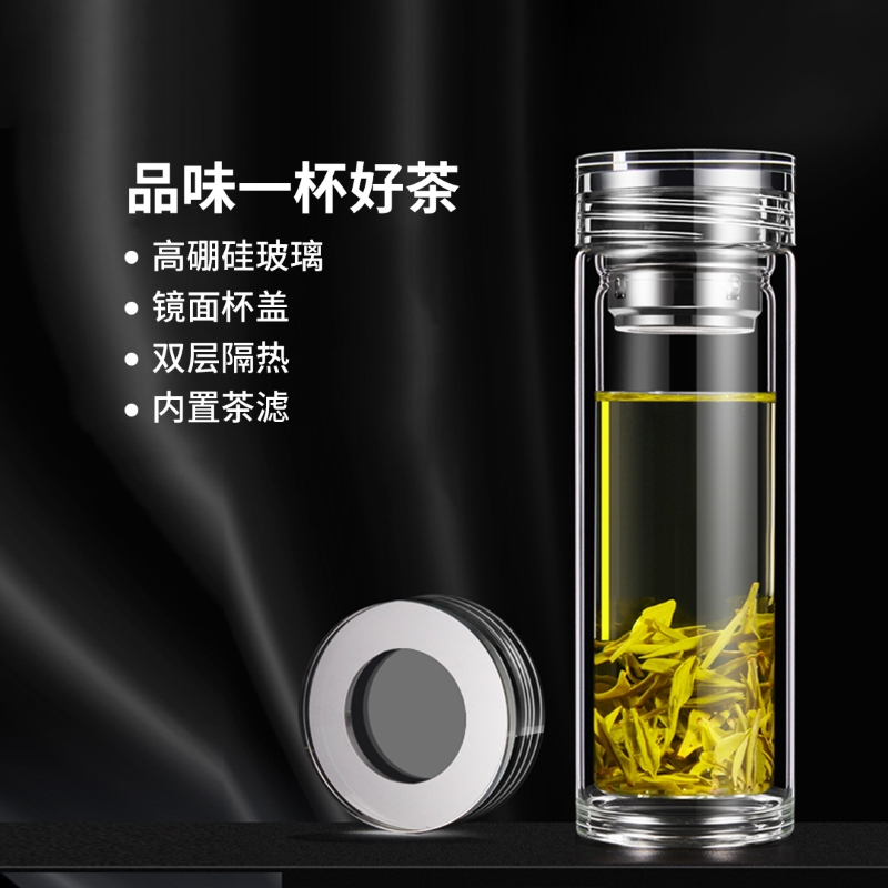 颜色:透明色 容量:350mL 材质:杯体:高硼硅玻璃茶滤:SUS304,塑料件:食品级PP、硅胶、 产品尺寸:φ6.6*21cm 礼盒尺寸:8.5*7.5*26cm 1.350ml,双层高硼硅玻璃, 2.内置茶滤,茶水分离 3.密封防漏,携带安心