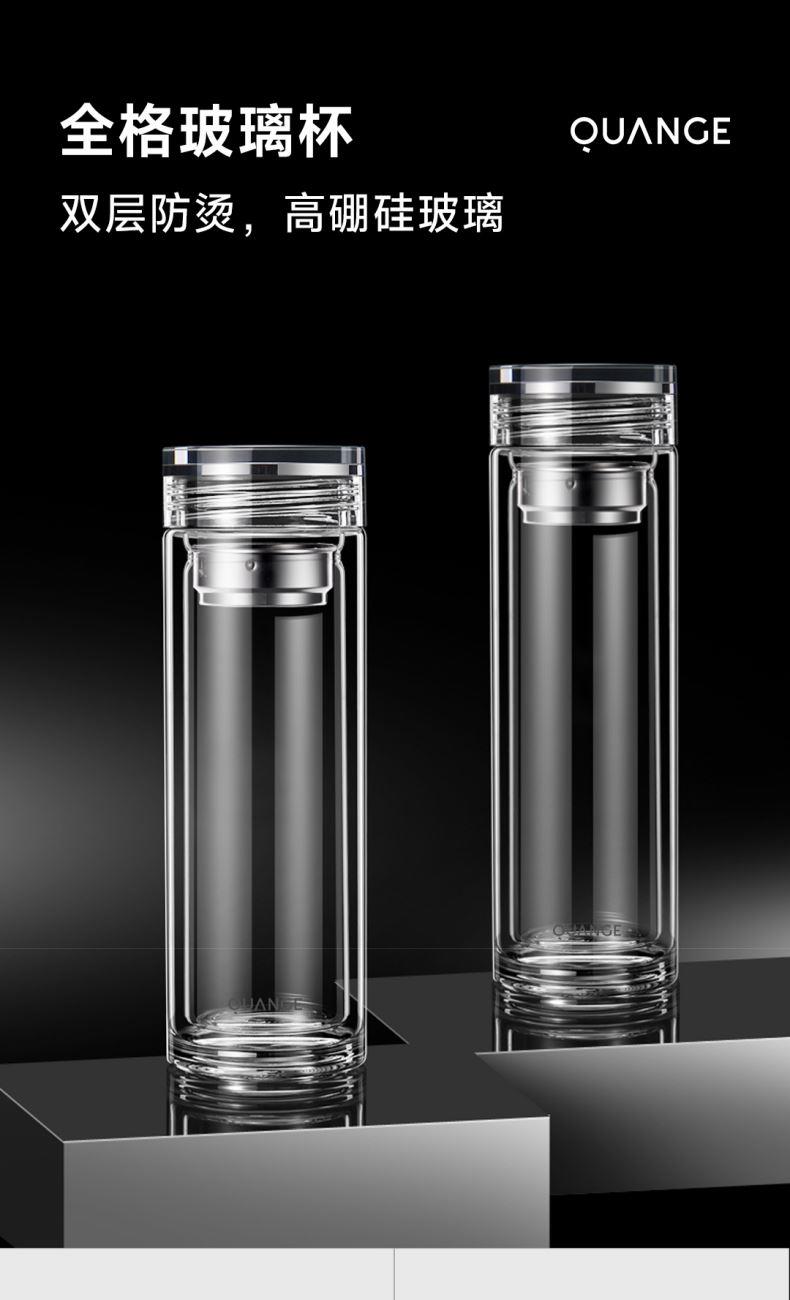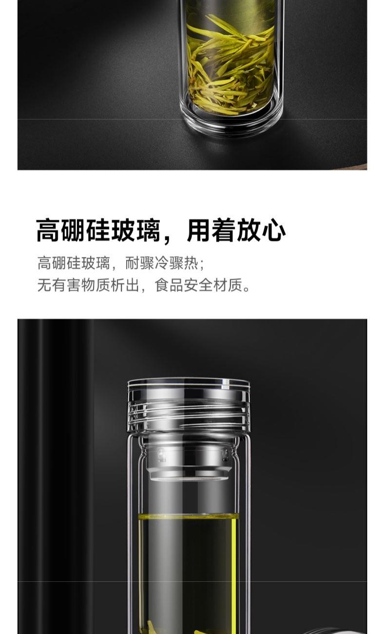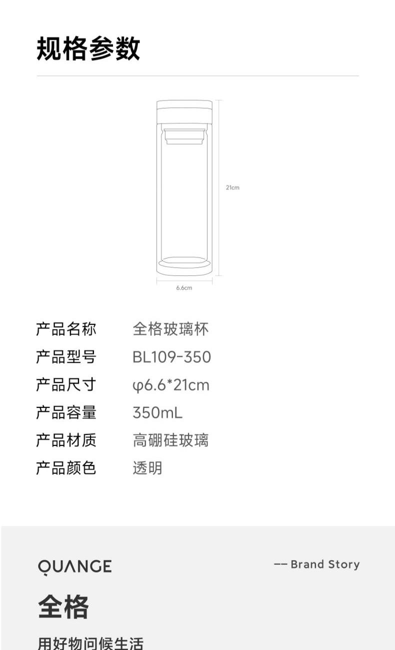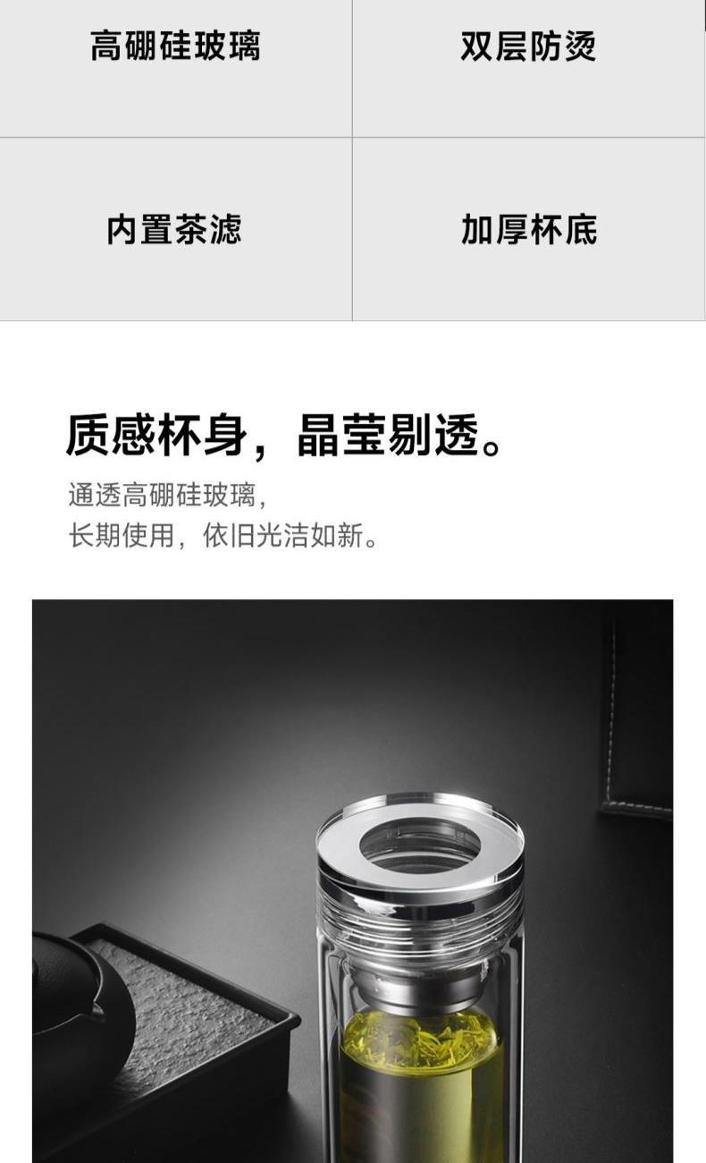 颜色:透明色 容量:350mL 材质:杯体:高硼硅玻璃茶滤:SUS304,塑料件:食品级PP、硅胶、 产品尺寸:φ6.6*21cm 礼盒尺寸:8.5*7.5*26cm 1.350ml,双层高硼硅玻璃, 2.内置茶滤,茶水分离 3.密封防漏,携带安心