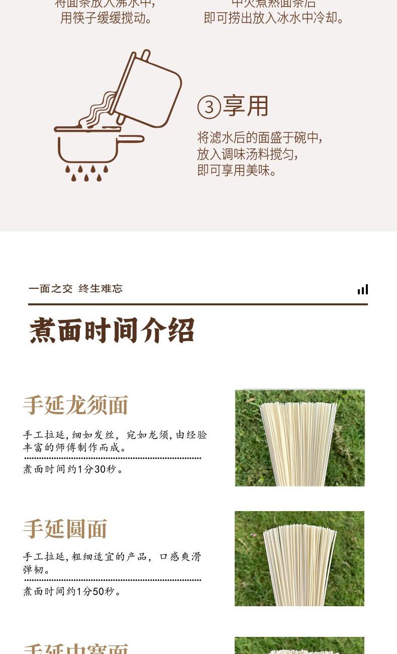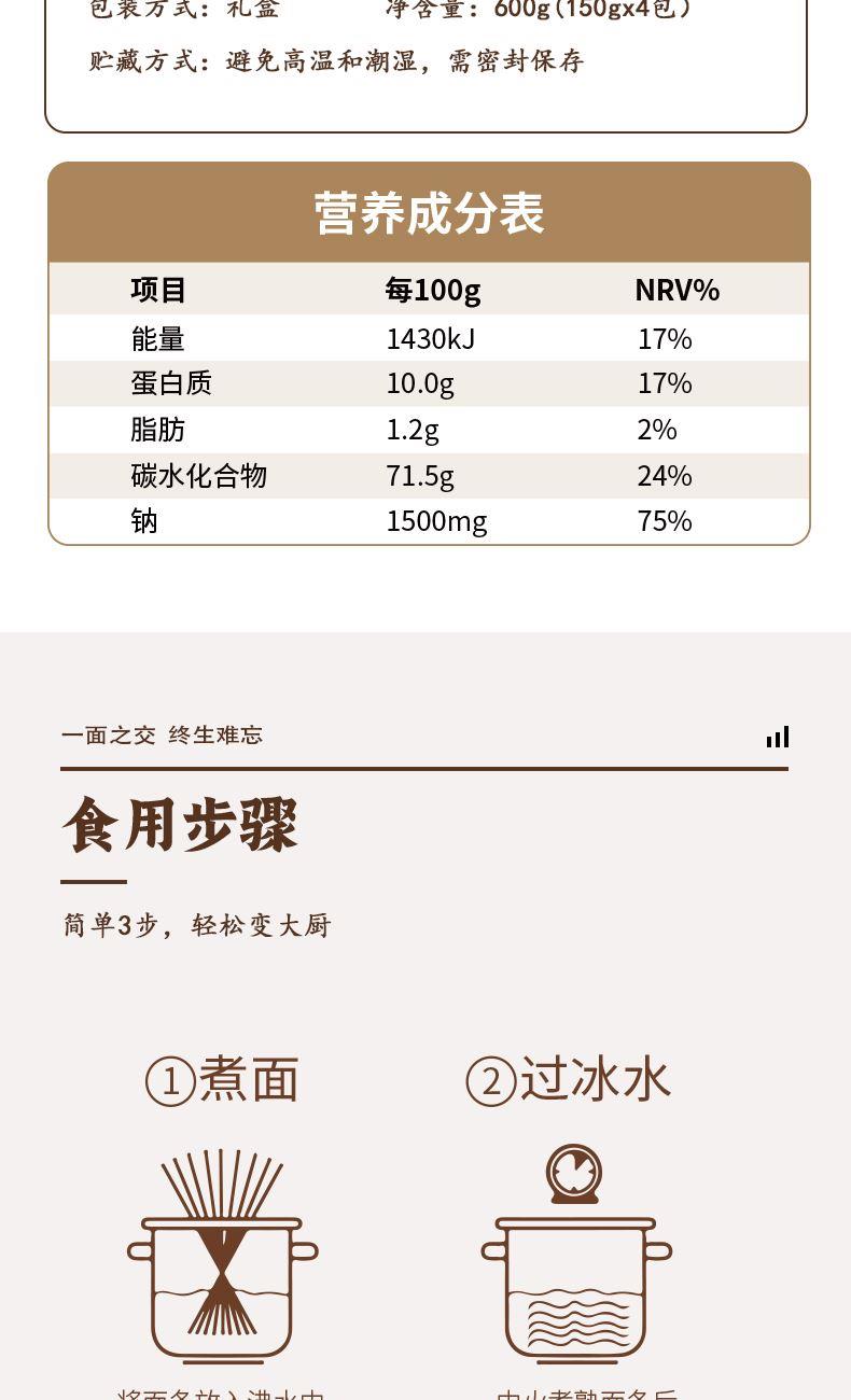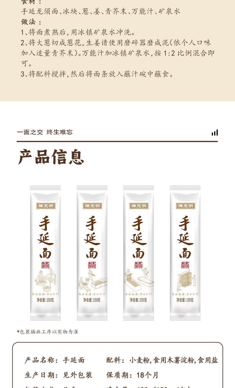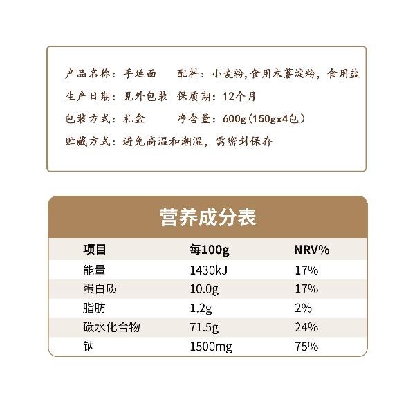 产品规格: 龙须1mm 150g*4包 共600g 1、二十道古法,六醒六抻更弹韧; 2、多熟成慢发酵,入味易熟好吸收 3、甄选进口澳麦麦源,口感弹韧,丝滑如稠 4、科学加持传统工艺,严格质控,美味安心享用