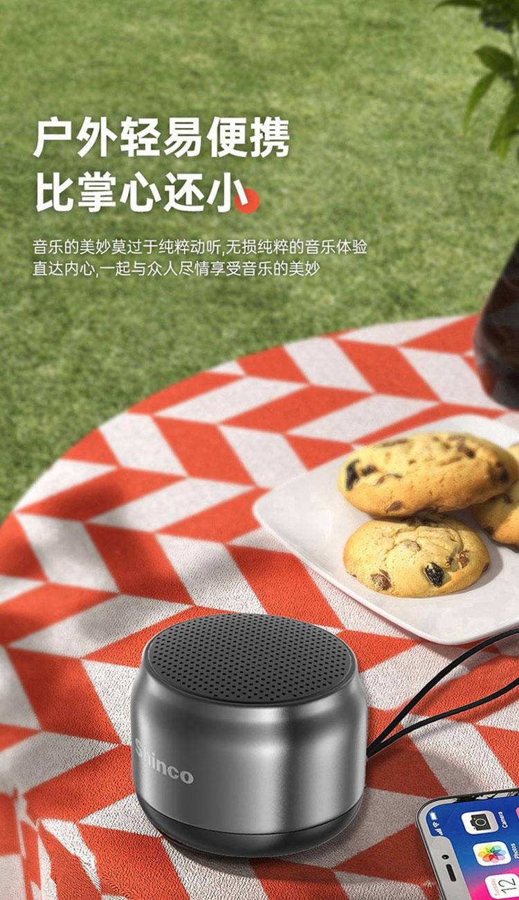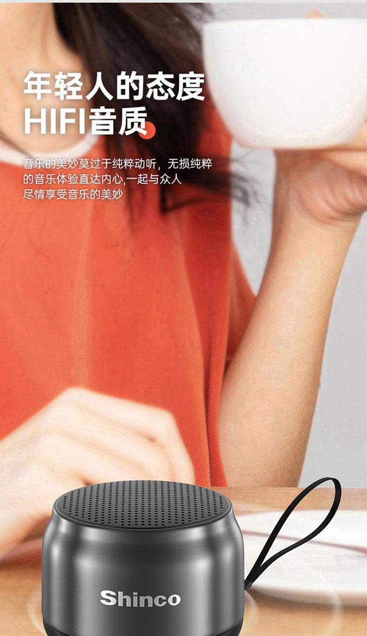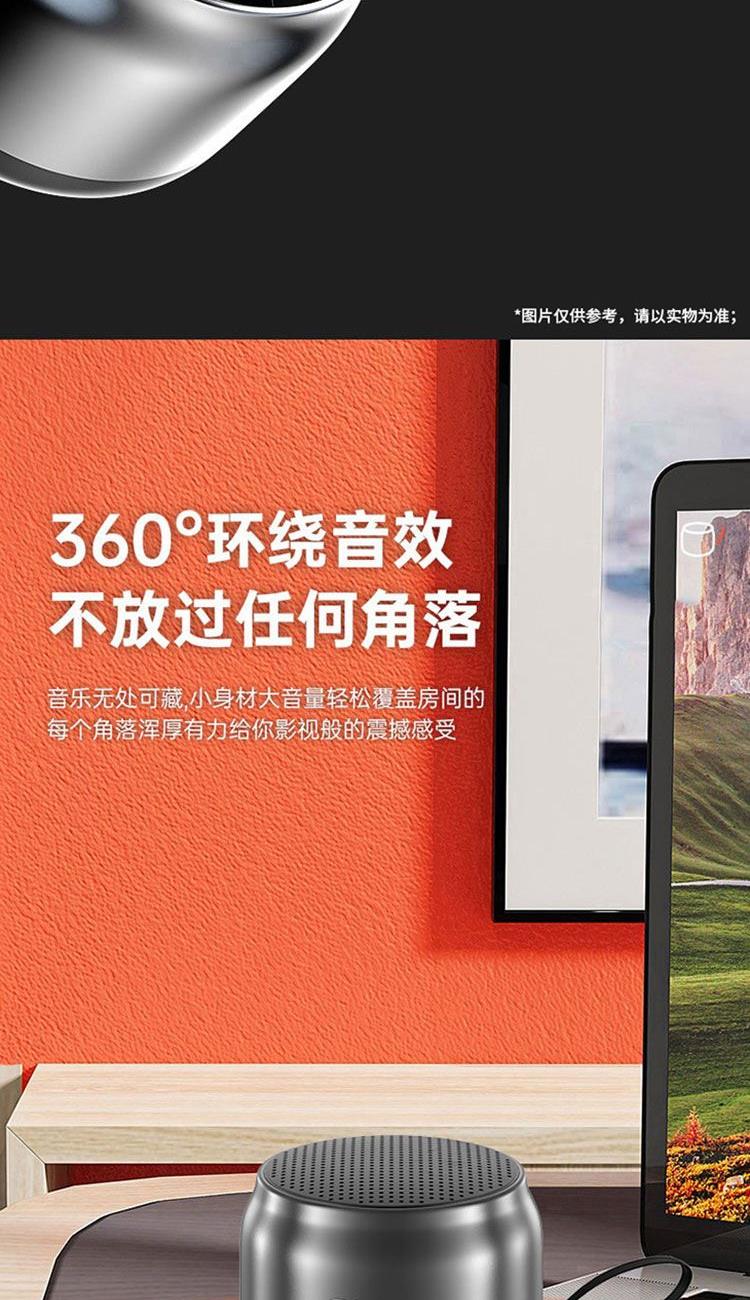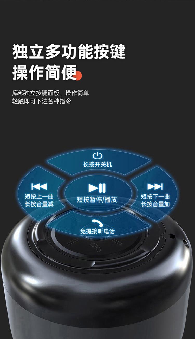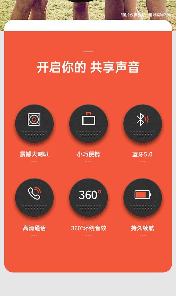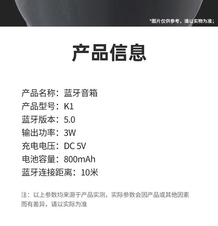 充电电压:DC 5V 输出功率:3W 蓝牙连接距离:10米 蓝牙版本:5.0 电池容量:800mAh 1:年轻人的态度,HIFI音质,尽情享受音乐的美妙 2:好音质的“核心”源自振膜尺寸,加大低音振膜口径,小体积爆发气势惊人 3:岂止强重低音,更有美妙人声,高频是声音的细节反映,重磅升级喇叭,带来丰富的声音细节 4:360°环绕音效,小身材大音量,轻松覆盖房间的每个角落