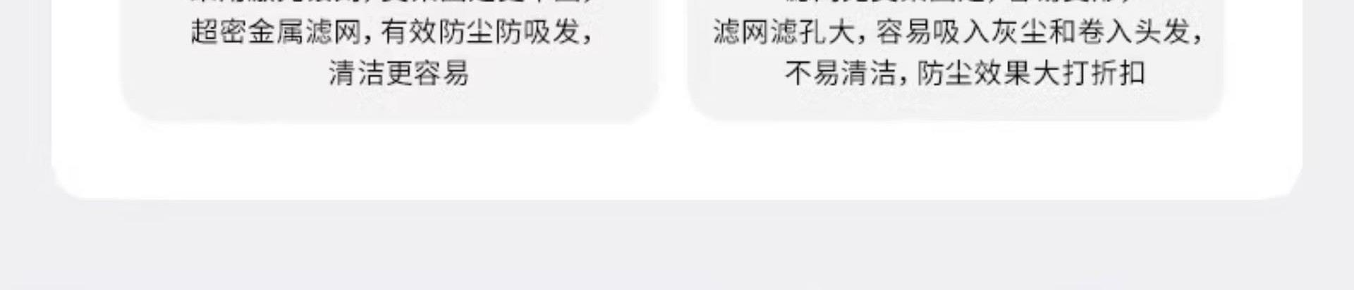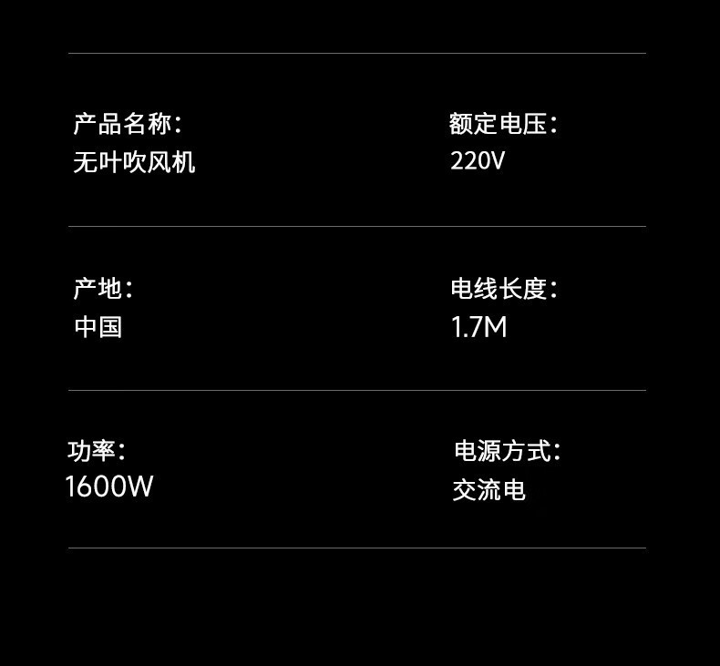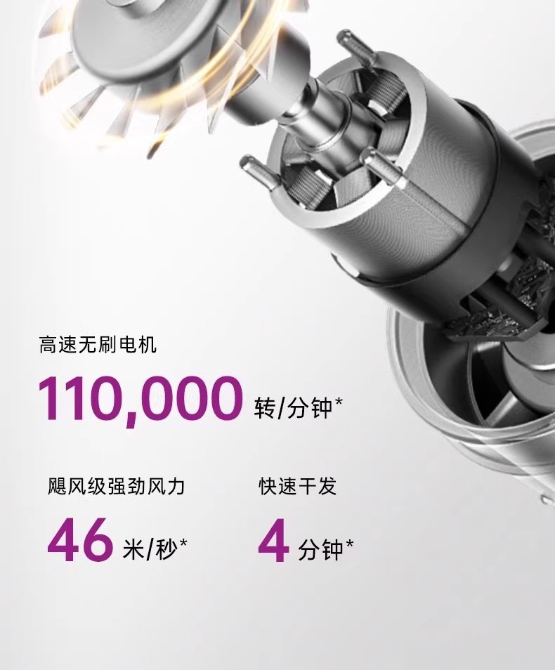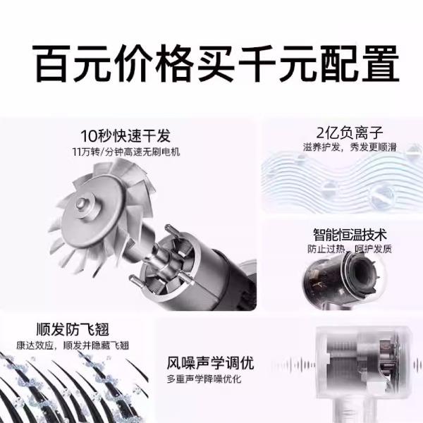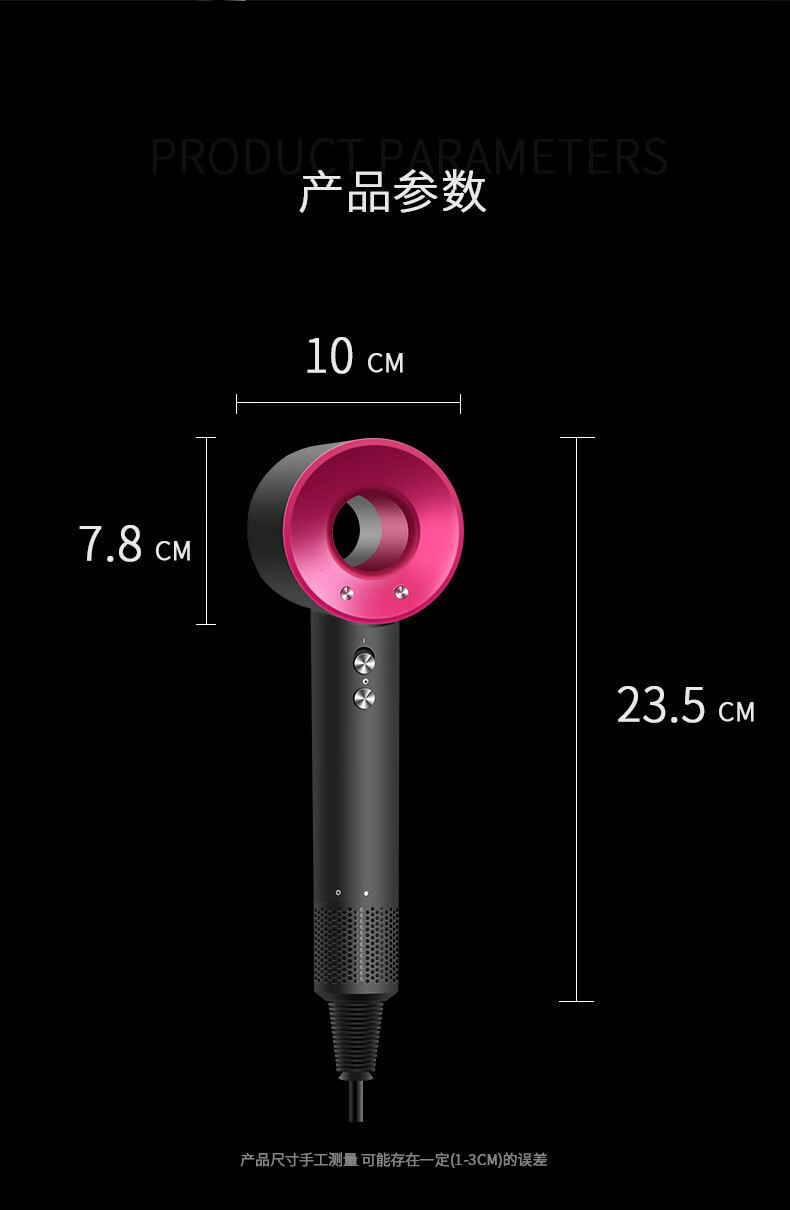 条码:6974230749562 转速:110000r/min 功率:160W 额定电压:220V 电源方式:交流电 尺寸:10*7.8*23.5CM 包装尺寸:35.4*12.5*7.8CM 电线长度:1.7M 净重:403g 毛重:610g 风速:3档 温度设置:4档
