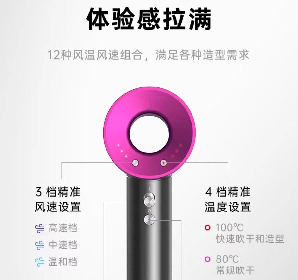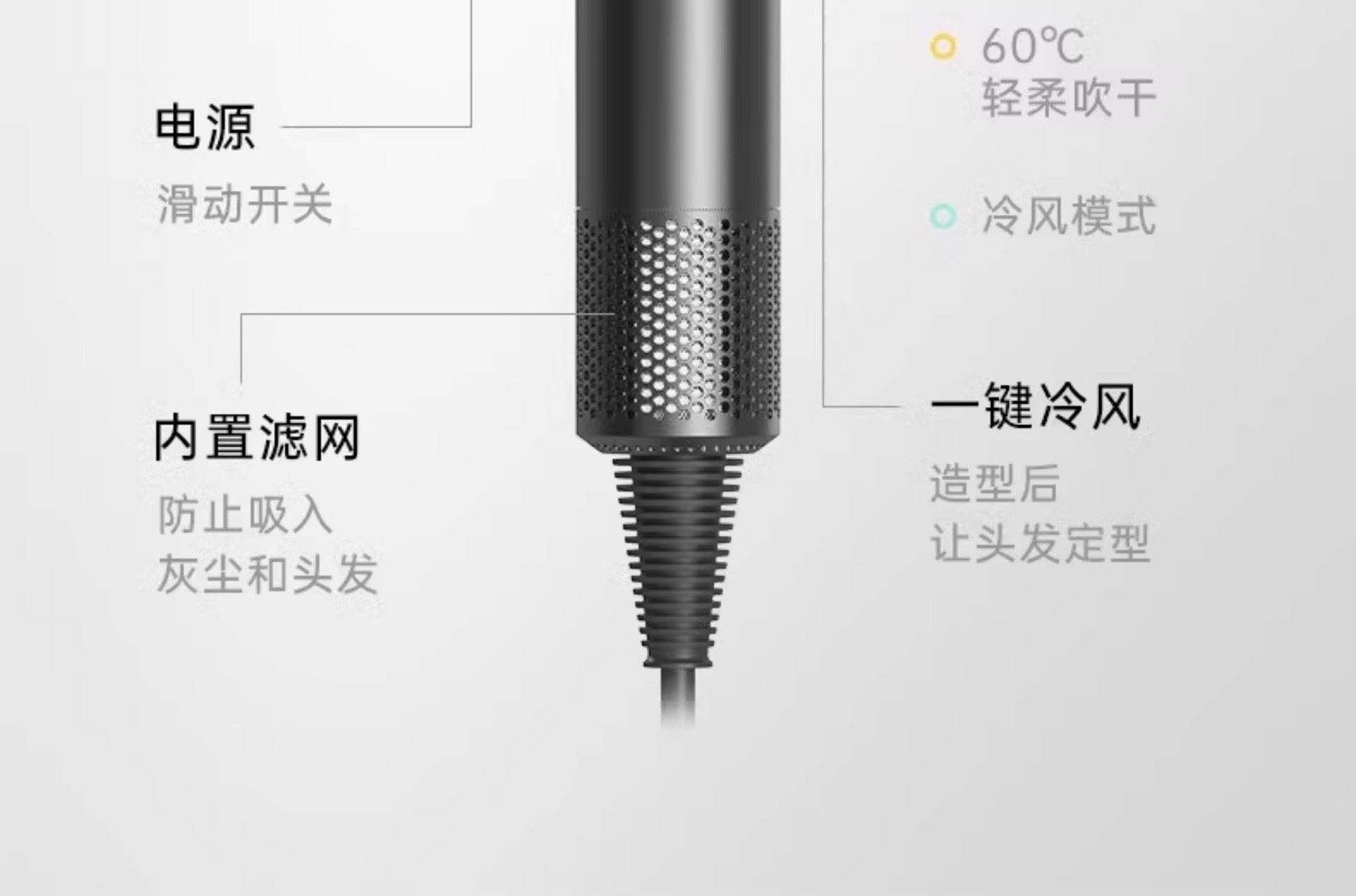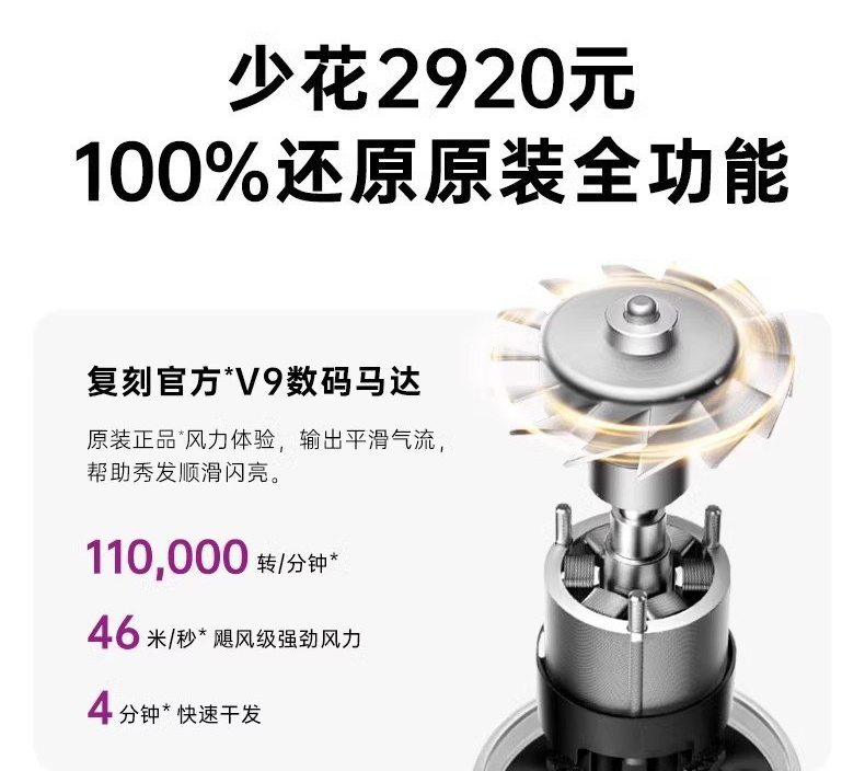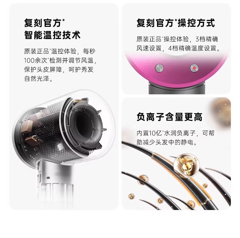 条码:6974230749562 转速:110000r/min 功率:160W 额定电压:220V 电源方式:交流电 尺寸:10*7.8*23.5CM 包装尺寸:35.4*12.5*7.8CM 电线长度:1.7M 净重:403g 毛重:610g 风速:3档 温度设置:4档