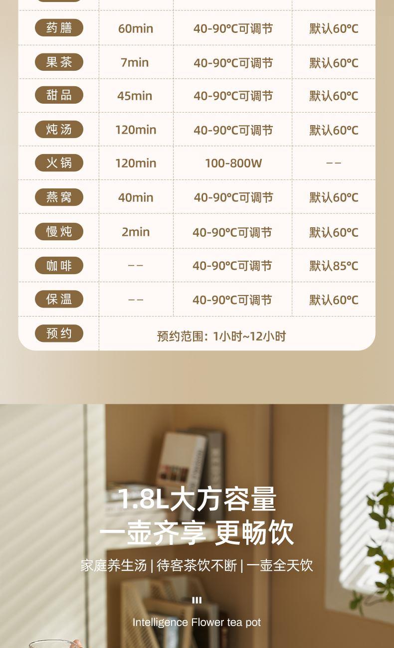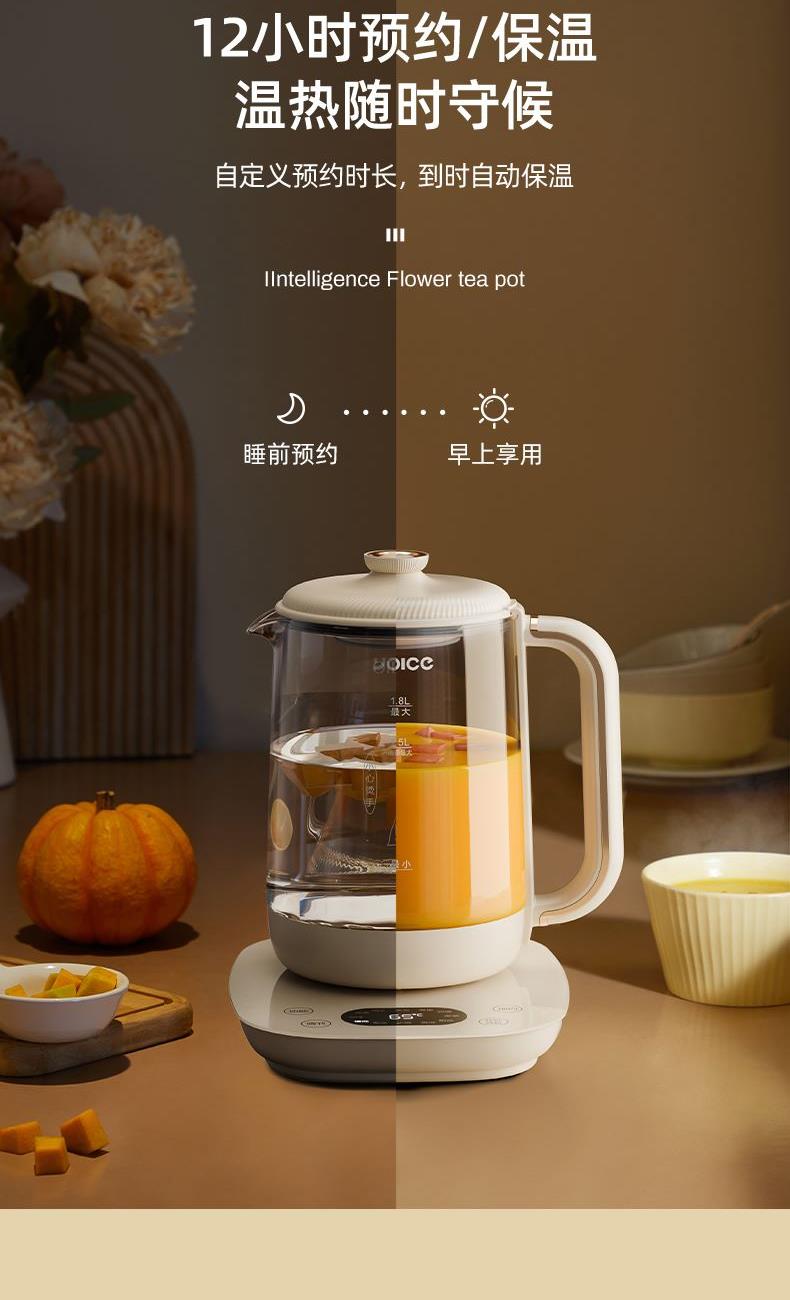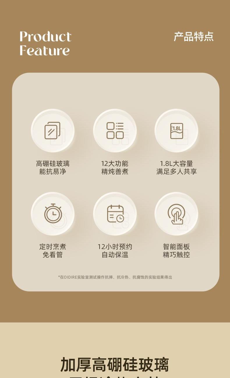 主要材质:高硼硅玻璃+PP+304不锈钢发热盘 电压:220V 功率:800W 容量:1.8L 产品尺寸:255*230*270mm 内箱:255*208*280mm 外箱:525*430*580mm 单台净重:1.3kg 单台毛重:1.56kg 整箱净重:16.72kg 整箱毛重:18.2kg 规格:8台/箱 包装方式:3层彩盒+3层邮购箱+3层牛卡大箱 1、高硼硅玻璃壶身,健康有保障 2、1.8L大容量;可满足家庭需求 3、智能温控器,安全防溢防干烧 4、12种多功能选择,满足您的需求 5、304不锈钢发热盘,材质安全放心