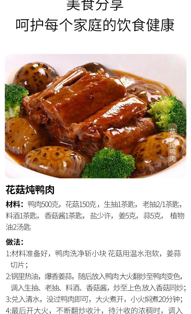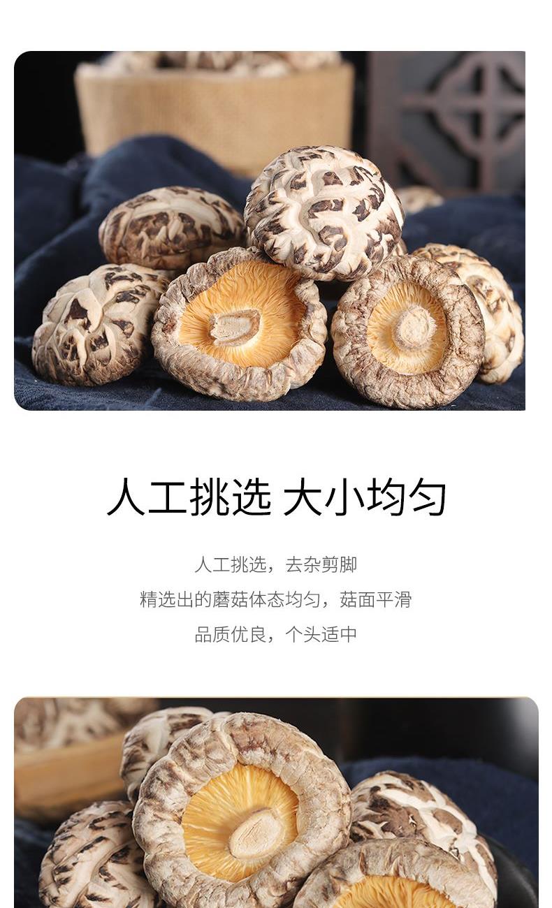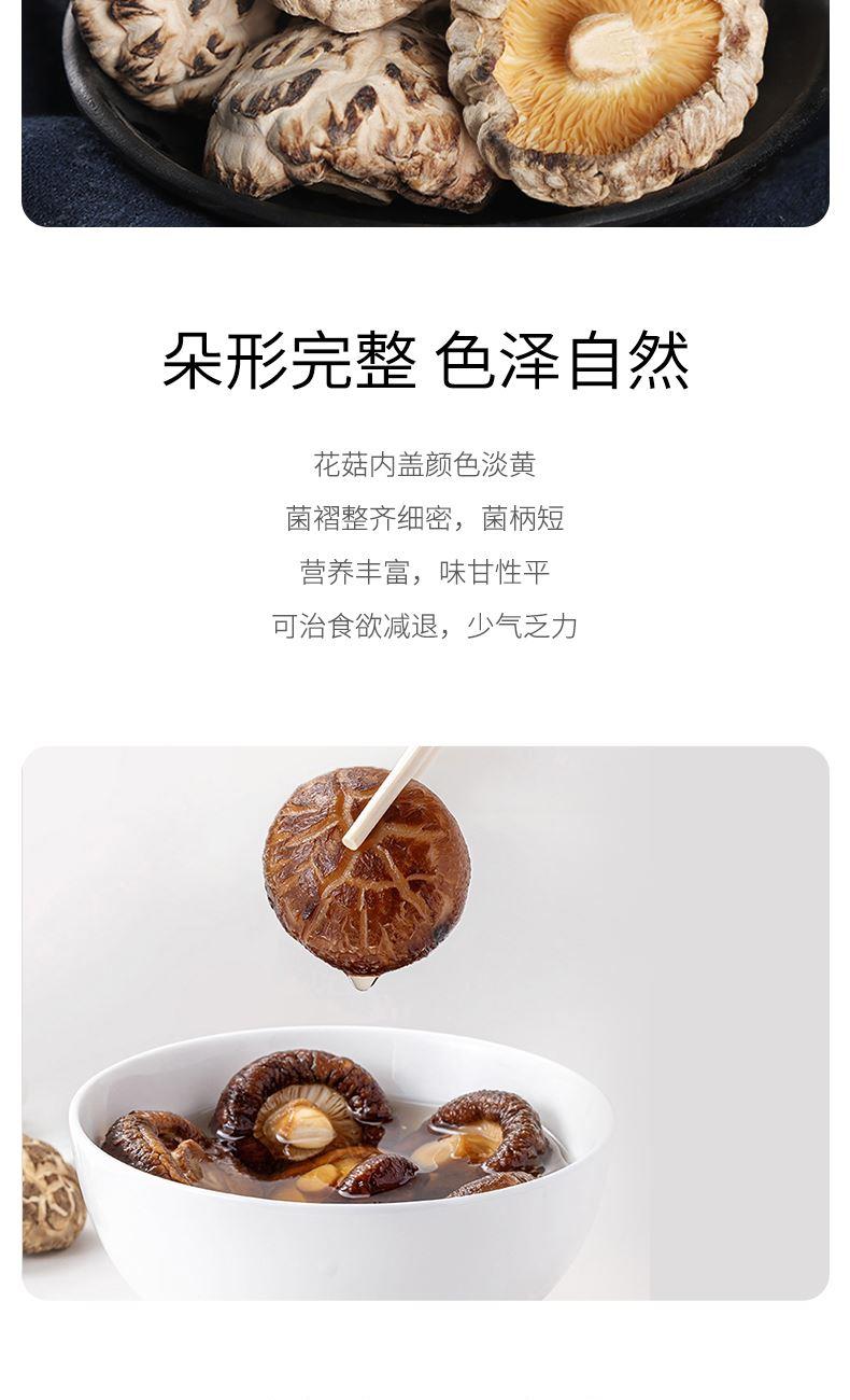 配料:花菇 原料产地:福建省宁德市 净含量:128克 保质期:12个月 生产日期:见包装物打印处 食用方法:用清水浸软洗净后,可煮,炖,炒,烩等。 花菇因花菇顶有花纹而得名,是香菇中的上品,以菇厚,含水量低而享誉海内外,因其外形美观松脆可口而成为席上佳珍。