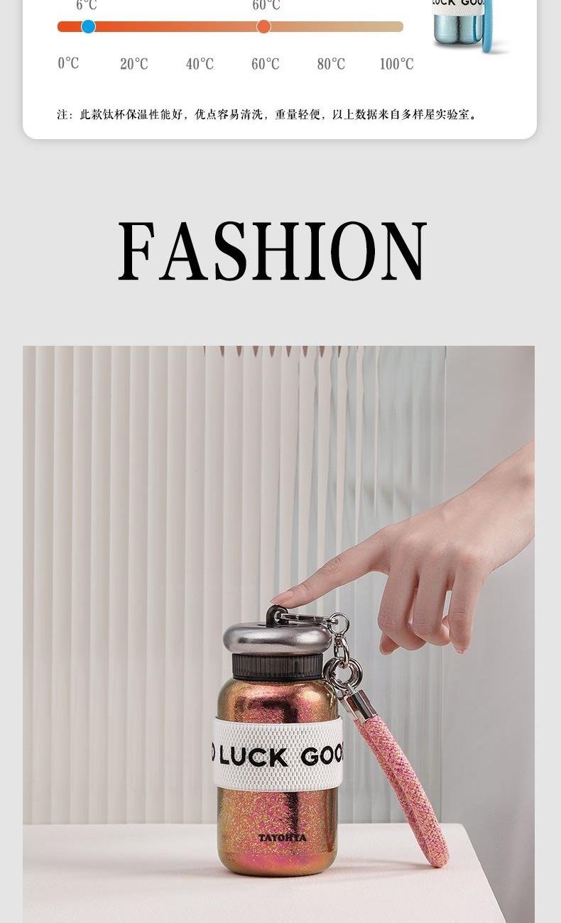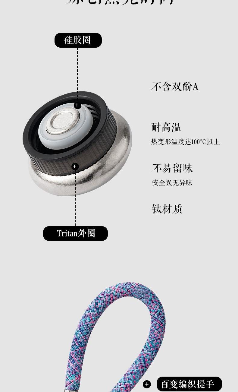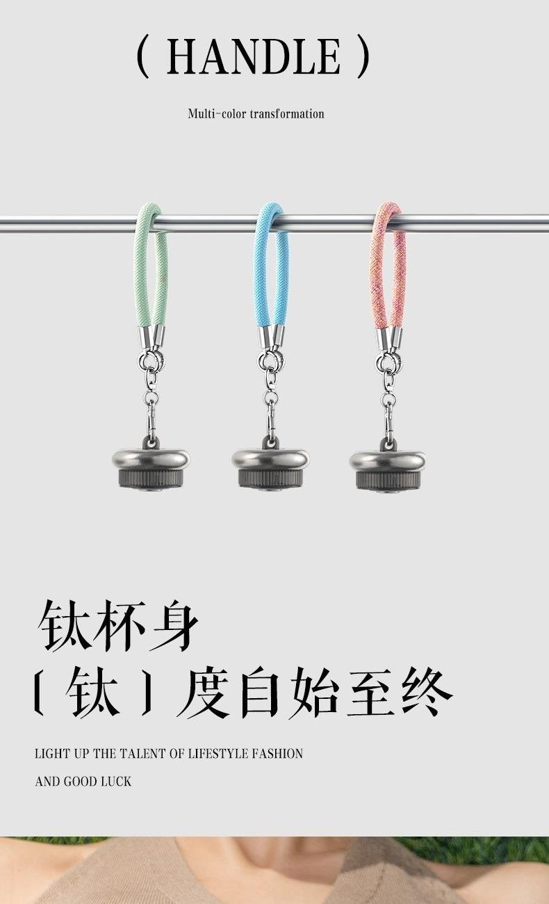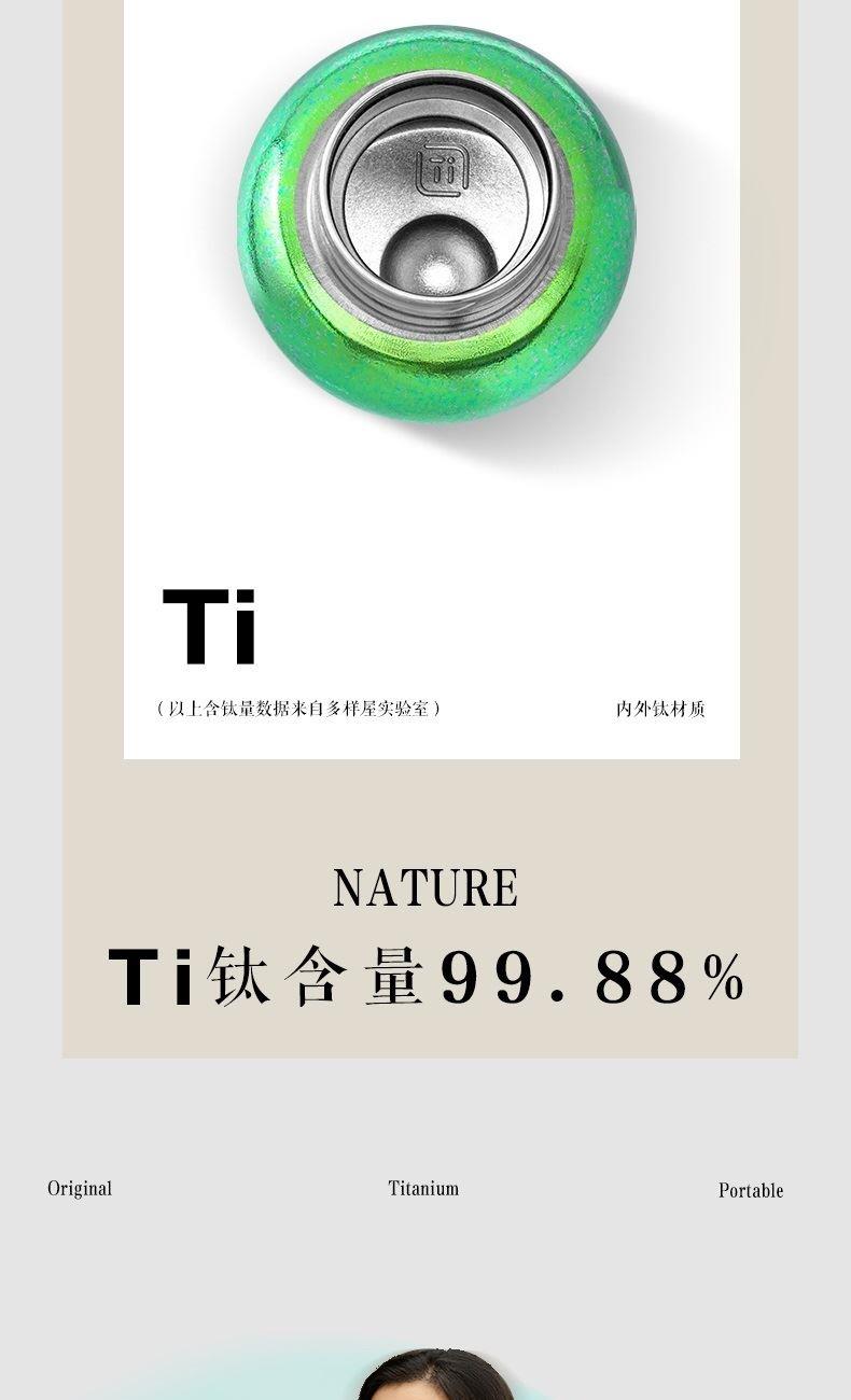 容 量: 300ml 颜色分类:绿、炫银红、紫 产品尺寸:φ7.0X15.5cm 金属材质:99%纯钛(Ti) 包装方式:礼盒包装 1. 钛含量99.88%,纯度高,更保鲜,同时钛具有良好的yijun效果。 2. 钛的耐腐蚀性极强,可盛装各种冷热酸碱饮品。 3. 保温保冷,密封防漏。 4. 此器型设计独特,三色出挑,唤醒多巴胺。 5. 配有挂绳,一拎即走,享受出游松弛感。 6. 礼盒精装,送礼体面。