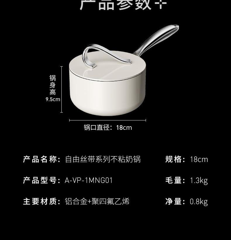 【型号】A-VP-1MNG01 【SKU】VP-3MNG01-4A18白 【材质】铝合金 【尺寸】18cm 【净重】0.8kg 【毛重】1.3kg 【包装尺寸】邮购盒 【外箱尺寸】245*138*430mm 【颜色】白色 【条码】6972547370196 丝带设计把手顶珠,造型美观; 内外防粘陶瓷釉层,不含PFAS,更安全; 凸点悬浮,立体防粘; 加长手柄,从容烹饪; 不挑炉灶,一锅搞定; 即冲即净,方便快捷。
