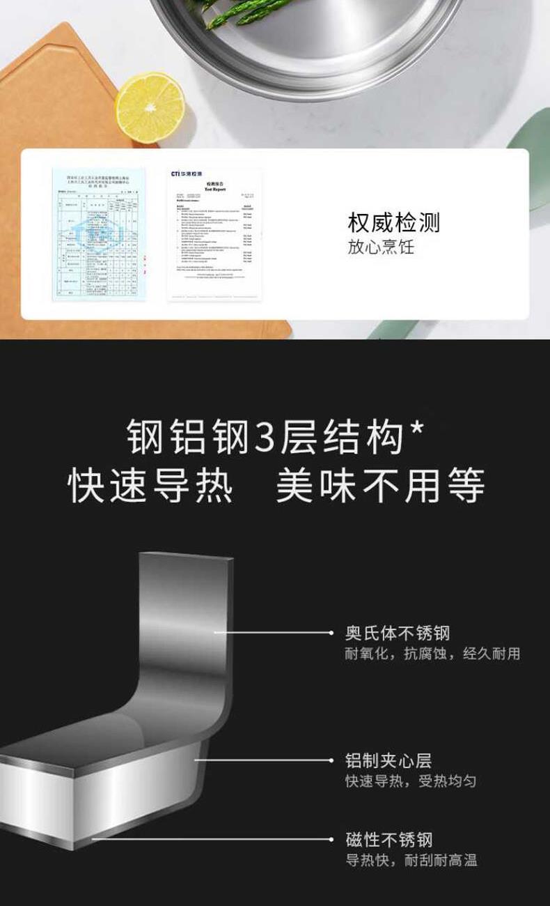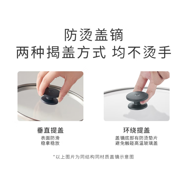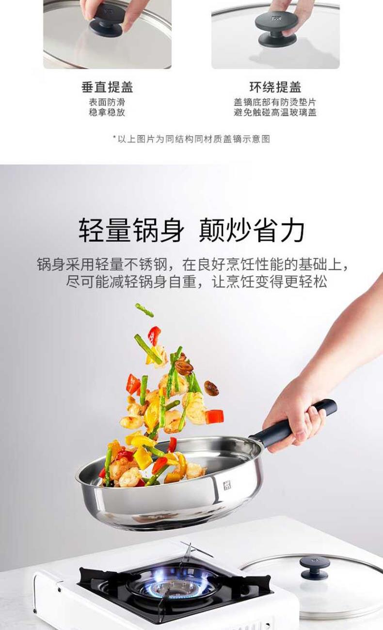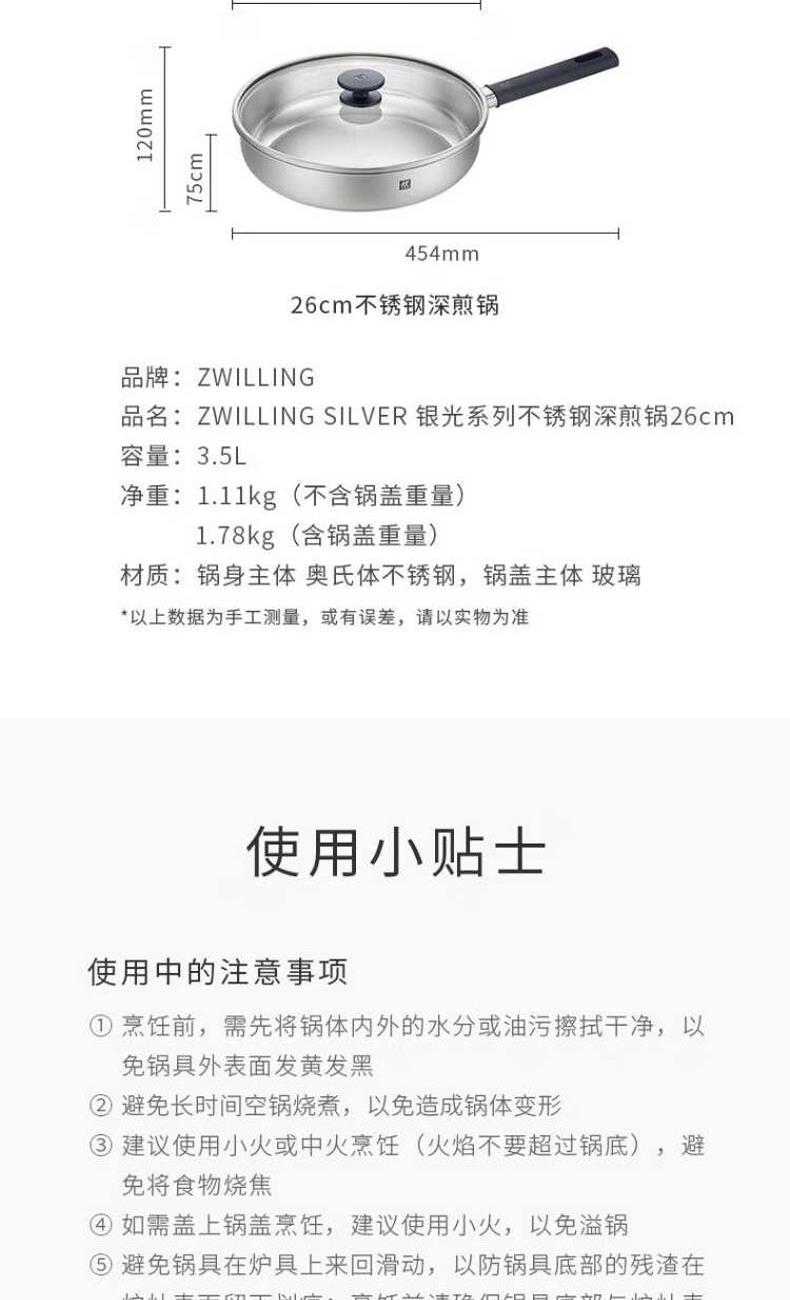 货号:1029219 容量:约3.5L 净重:不含锅盖1.11kg 含锅盖1.78kg 材质:锅身主体 奥氏体不锈钢,锅盖主体 玻璃 产品组成及介绍: 深煎锅:优选食品级304不锈钢材质“无涂层”深煎锅,健康煎炒,持久好用,26cm尺寸适中,匹配常规家庭日常所需 采用双立人sigma classic钢铝,钢三层包裹式锅底,中部铝制夹心层,具有良好导热性,加热快速均匀,节省烹饪时间 手柄和盖鏑:采用优质隔热材质,长期烹饪,不烫手。 锅身采用优选不锈钢材质,在保障烹饪性能的基础上,尽可能减轻锅身自重,使操作锅具变得更轻松自在。 外壁:采用双立人DURASILVER银光抗黄技术,减少氧气与不锈钢的氧化反应,有效保护锅具外壁;常规家庭正常使用下外壁可保持约1-2年*不易发黄变黑。