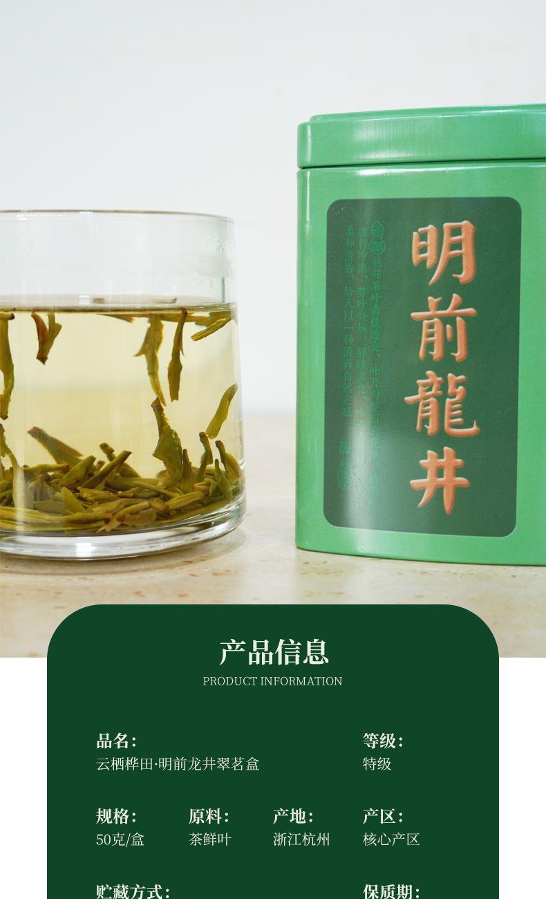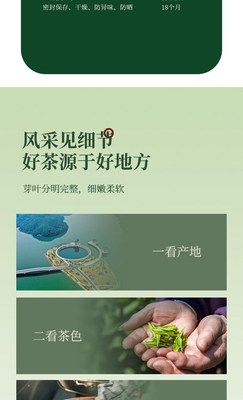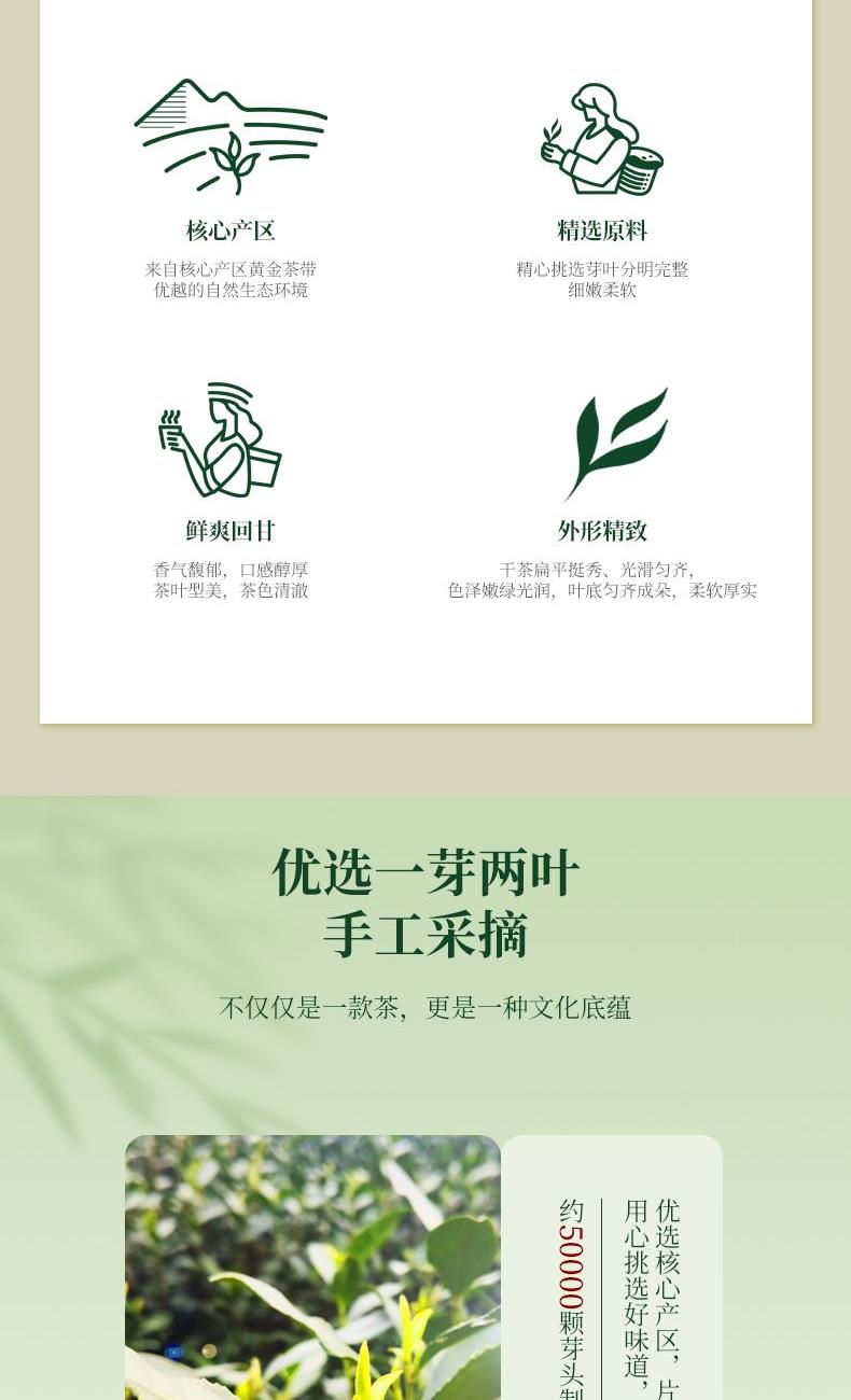 规格:50克/盒 明前龙井50克/罐 原料产地:杭州钱塘核心产区 保质期:18个月 甄选核心产区,自然转化风味正,简约铁盒包装 1. 核心产区茶韵浓厚 2. 传统工艺:纯手工炒制,滋味清甜 3. 简约铁盒包装:自饮臻享,赠礼有品