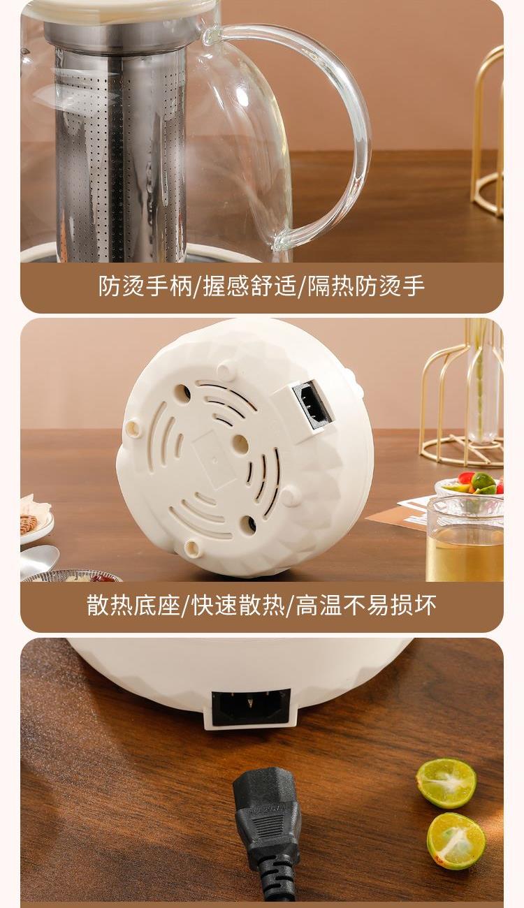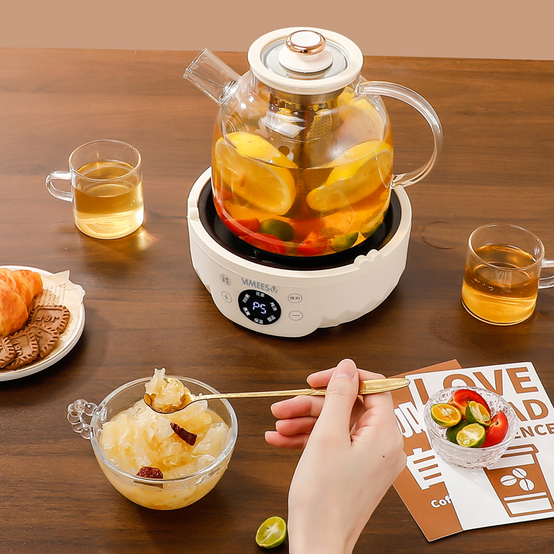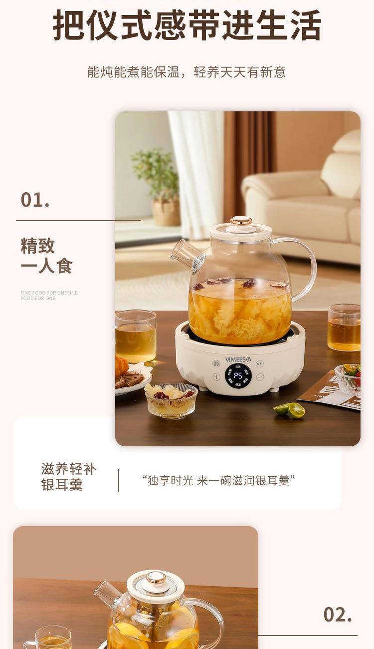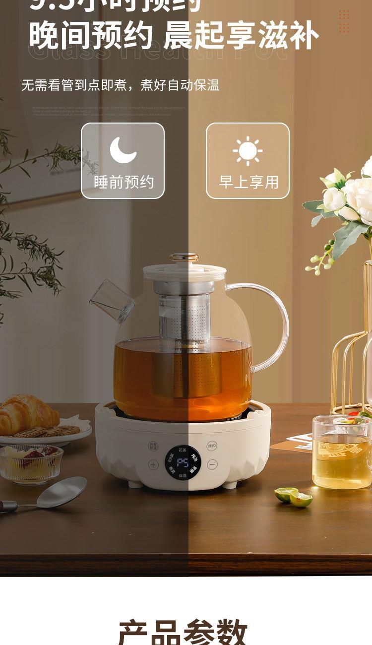产品颜色:米白色 额定功率:700W 产品容量:1.5L 额定电压:220V 额定频率:50HZ 产品尺寸:175*175*175mm 产品材质:高硼硅玻璃 发热方式:全圈发热盘 净重:1.5Kg 1、加厚高硼硅玻璃,冷热交替,不惧破裂; 2、分体式壶身设计,提壶即享,不受线束; 3、双重茶漏过滤,入口0渣感; 4、8小时长效55℃保温,烹煮完成后自动保温; 5、1.5L大容量,润养美饮,不停续杯; 6、大屏智能触控面板,解锁轻颜炖煮; 7、9.5小时预约,无需看管,到点即煮