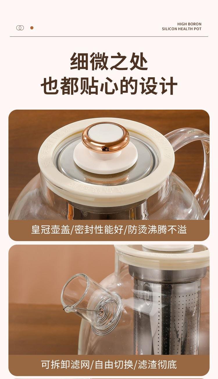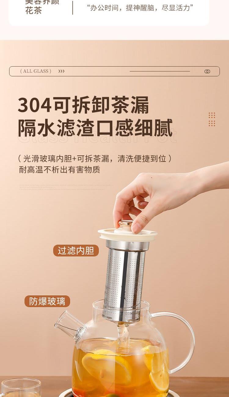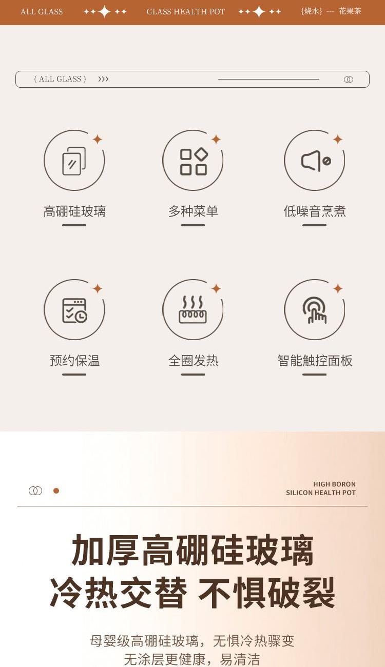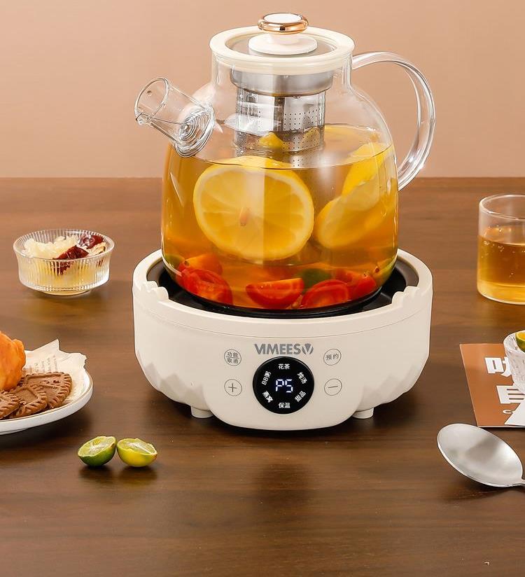产品颜色:米白色 额定功率:700W 产品容量:1.5L 额定电压:220V 额定频率:50HZ 产品尺寸:175*175*175mm 产品材质:高硼硅玻璃 发热方式:全圈发热盘 净重:1.5Kg 1、加厚高硼硅玻璃,冷热交替,不惧破裂; 2、分体式壶身设计,提壶即享,不受线束; 3、双重茶漏过滤,入口0渣感; 4、8小时长效55℃保温,烹煮完成后自动保温; 5、1.5L大容量,润养美饮,不停续杯; 6、大屏智能触控面板,解锁轻颜炖煮; 7、9.5小时预约,无需看管,到点即煮