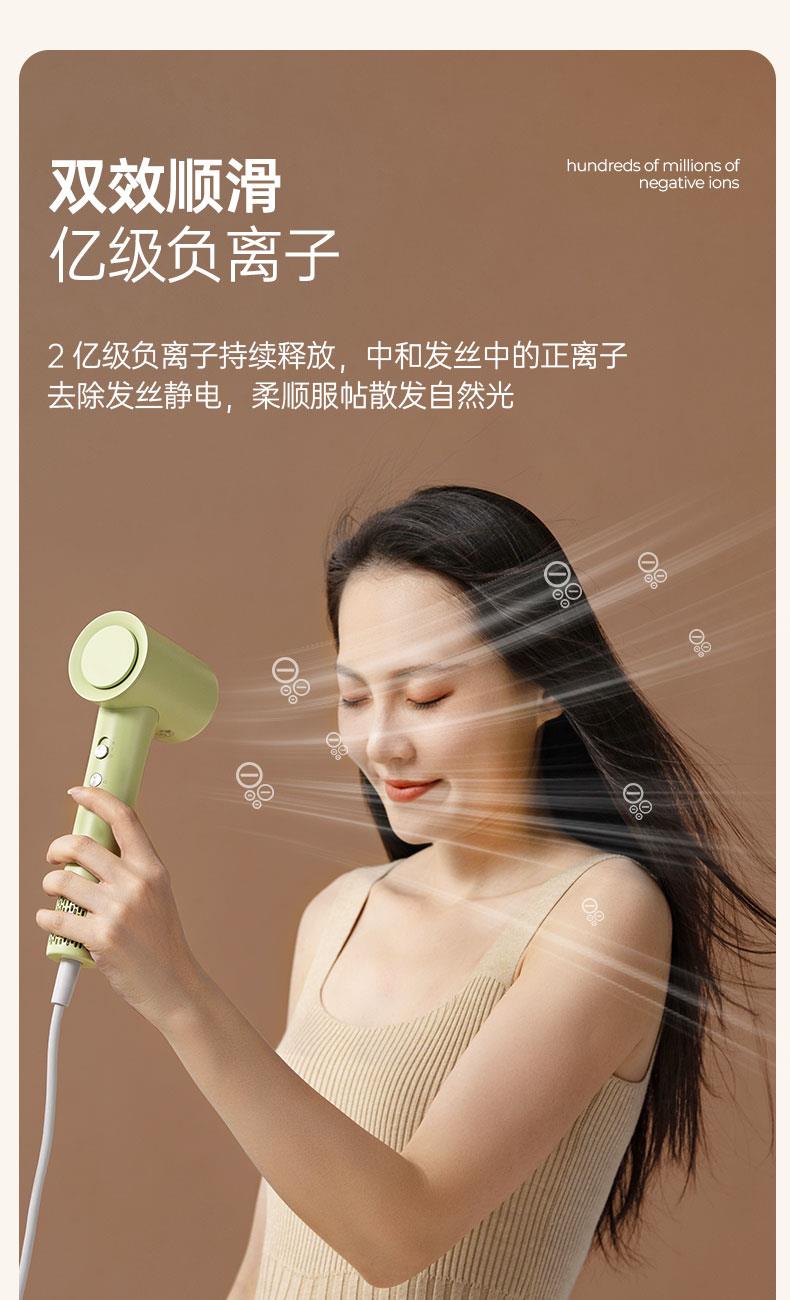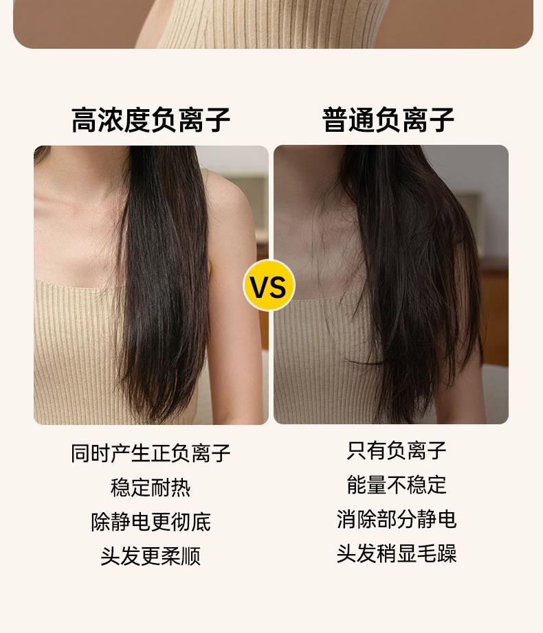 • 双效顺滑,2亿级高浓度负离子,持续释放,中和发丝中的正离子,去除发丝静电,柔顺服帖散发自然光