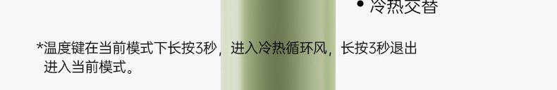 • 三色灯环,冷风(蓝光)/温风(绿光)/热风(红光),温度看得见
