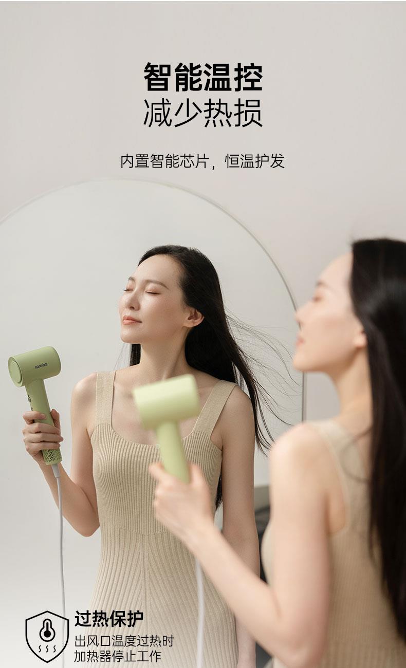 • 内置智能控温芯片,恒温护发,减少热损;过热保护,出风口温度过热时加热器停止工作