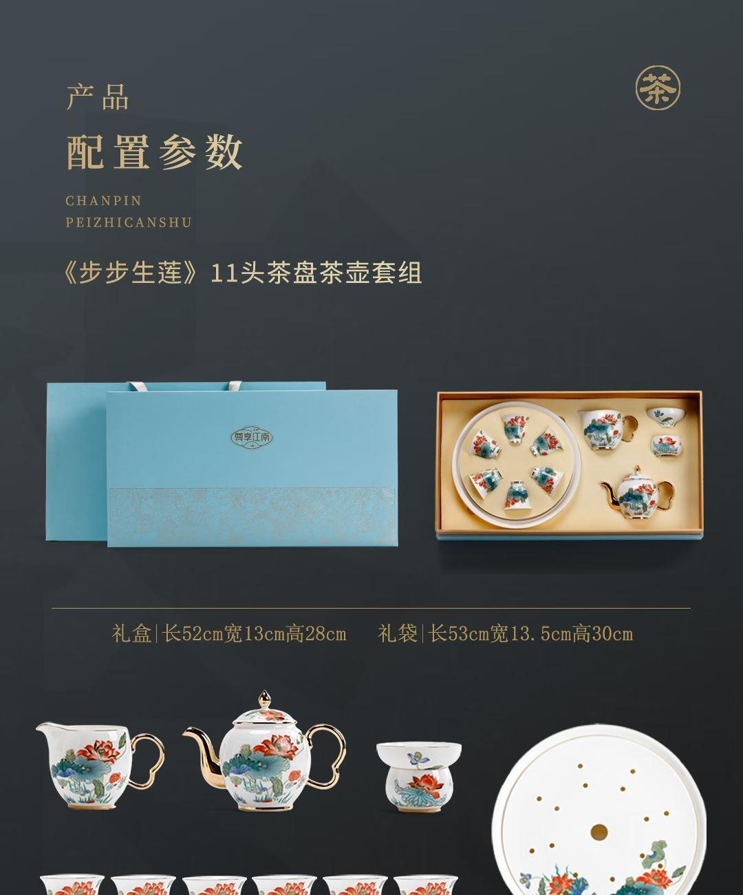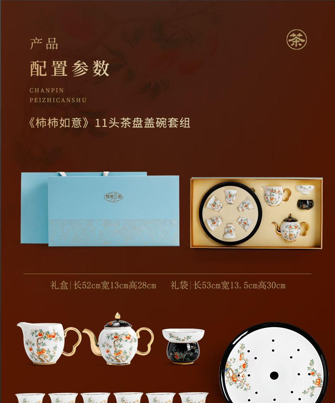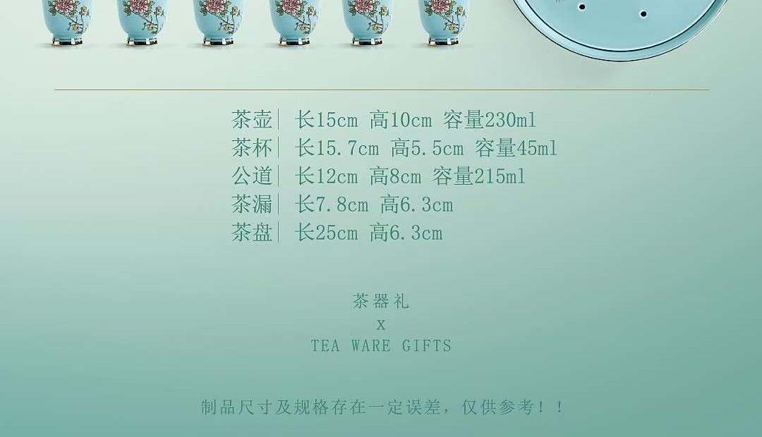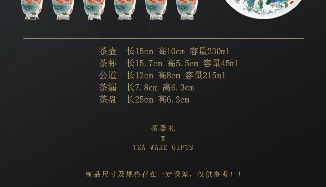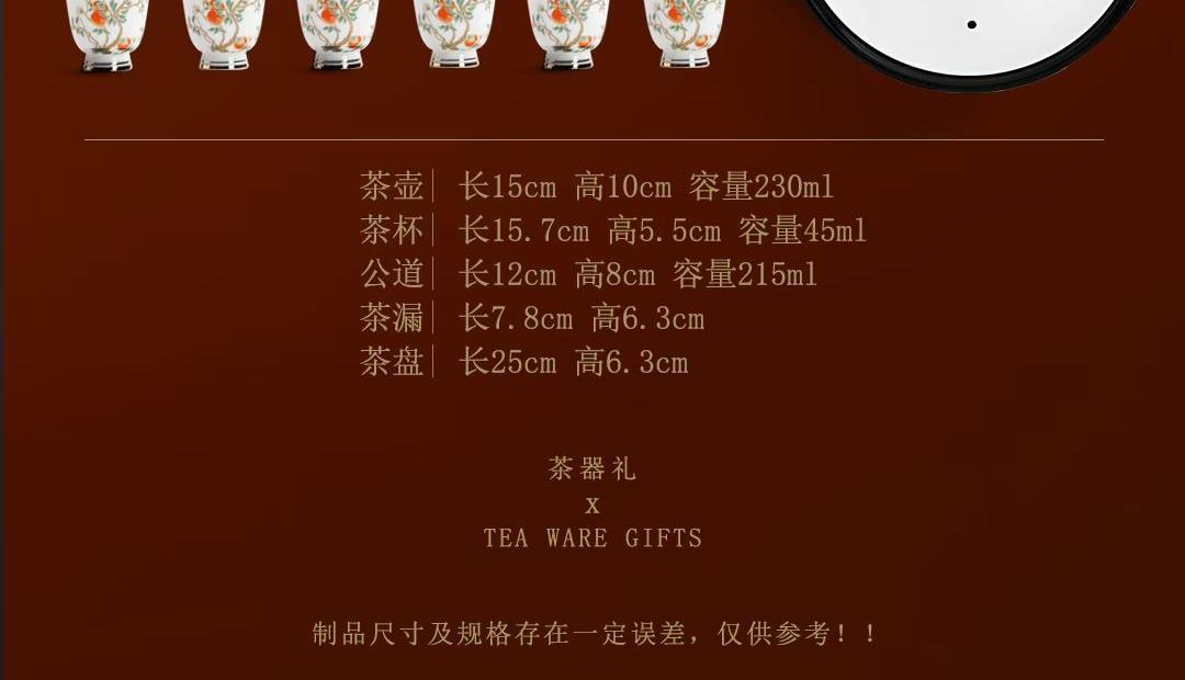 尺寸:茶壶长15cm高10cm 容量230ml, 茶杯长5.7cm高5.5cm容量45ml, 公道长12cm高8cm容量215ml, 茶漏长7.8cm高6.3cm, 茶盘长25cm 高6.3cm。 礼盒:长52cm宽13cm高28cm, 礼袋:长53cm宽13.5cm高30cm。 款式:锦绣芳华/柿柿如意/步步生莲。
