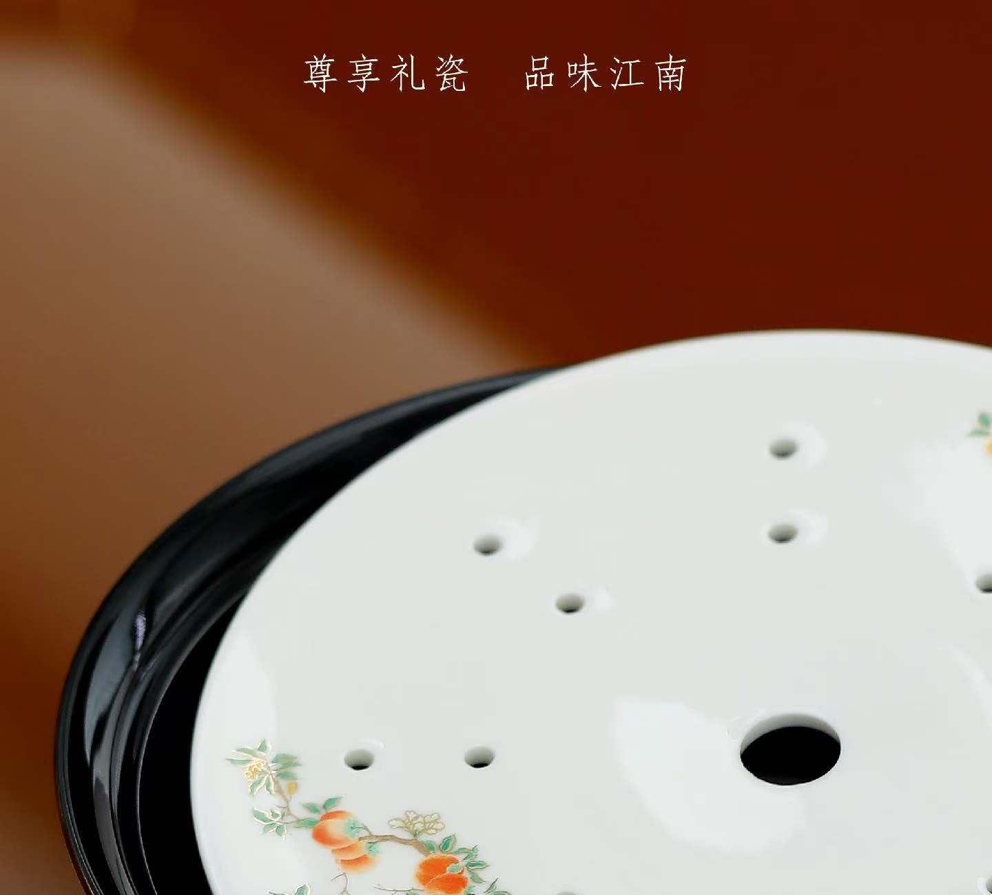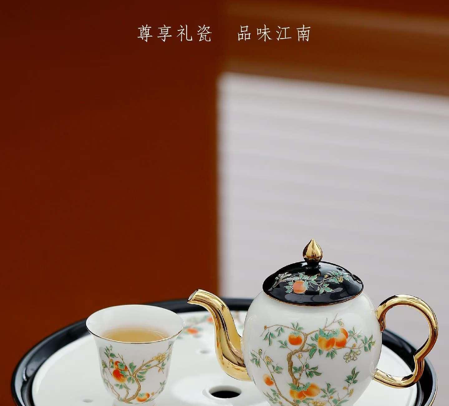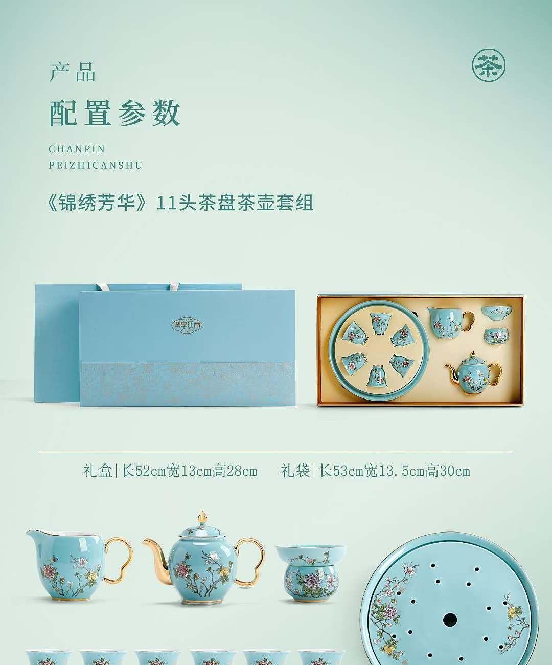 尺寸:茶壶长15cm高10cm 容量230ml, 茶杯长5.7cm高5.5cm容量45ml, 公道长12cm高8cm容量215ml, 茶漏长7.8cm高6.3cm, 茶盘长25cm 高6.3cm。 礼盒:长52cm宽13cm高28cm, 礼袋:长53cm宽13.5cm高30cm。 款式:锦绣芳华/柿柿如意/步步生莲。