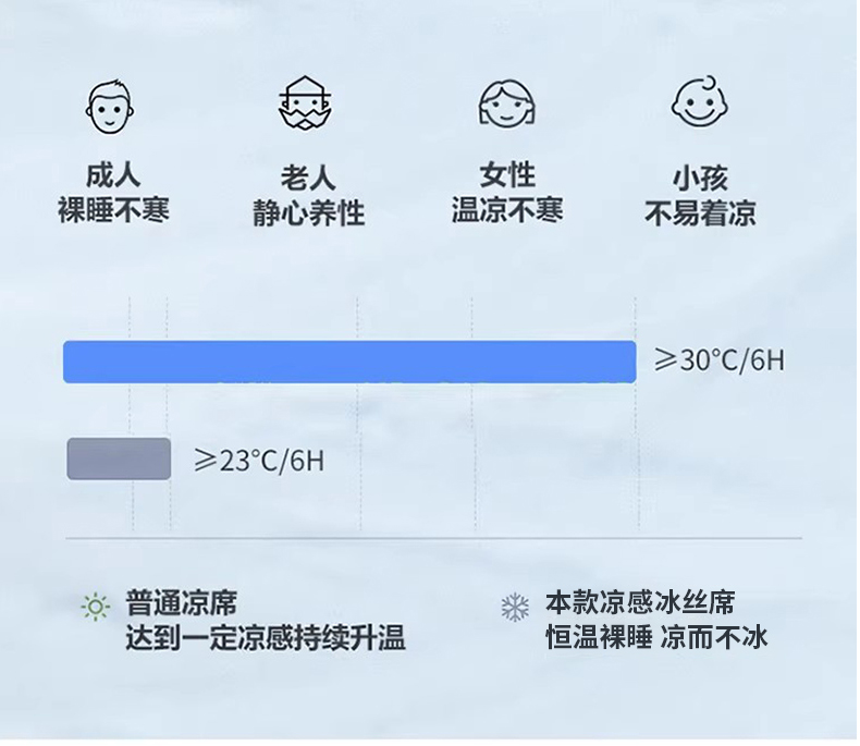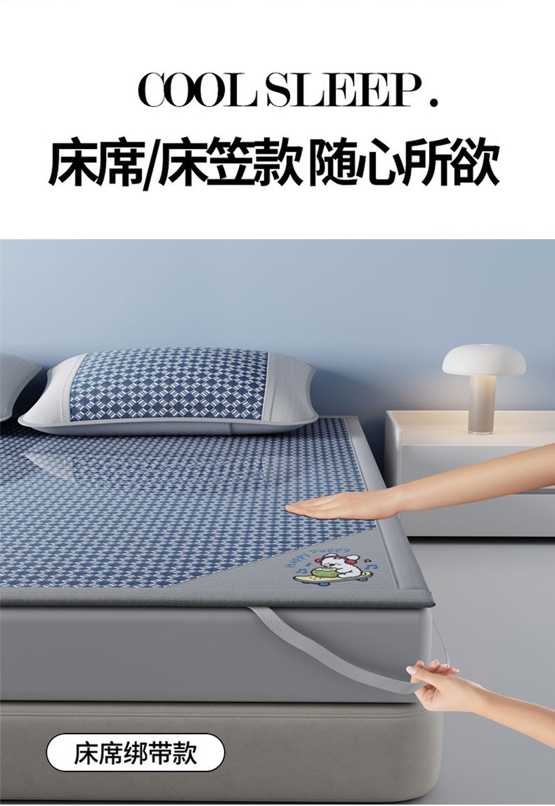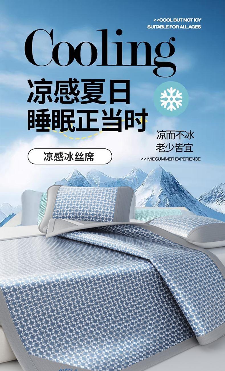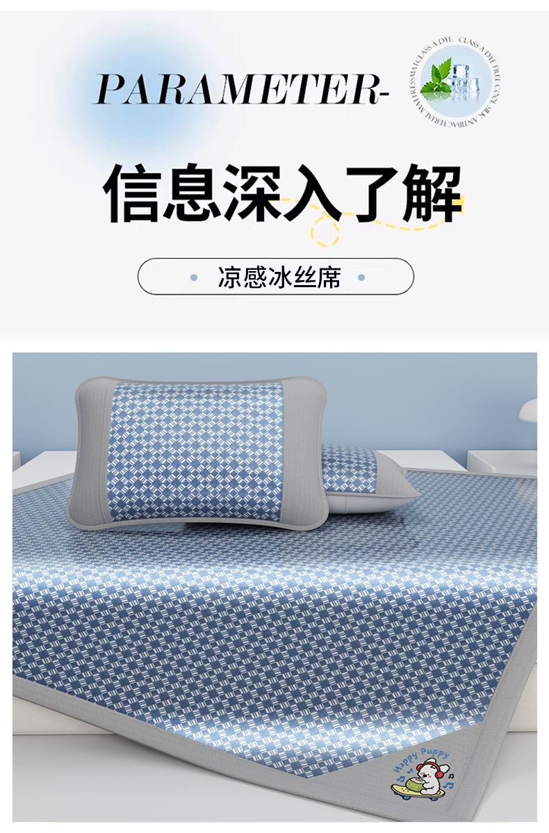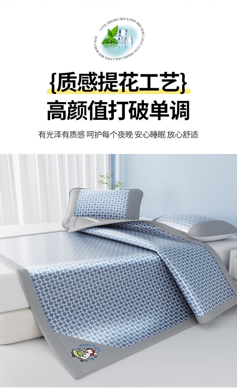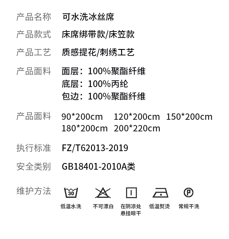1:凉感夏日睡眠正当时 凉而不冰老少皆宜: 凉感冰丝席 2:{舒爽透气消散夏日粘腻暑气 无纺布透气底排湿透气不闷热席子也能“畅快呼吸” 尺寸:180x200cm单凉席+枕套一对 面料:云锻纤维 包装:彩盒
