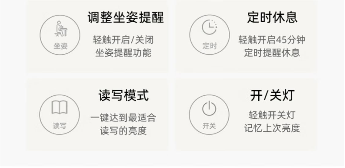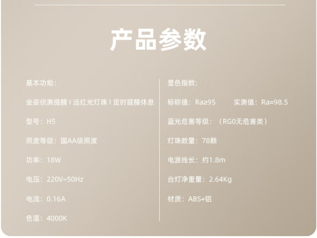 显色指数:Ra96-98(含) 供电方式:插座 开关方式:按钮开关 固定方式:底座 是否可充电:不可充电 光源类型:LED 护眼功能:全光谱 瓦数:15-20W(含) 是否防蓝光:防蓝光 防蓝光指数:RG0(豁免伤害): 灯身材质:ABS 铝 智能功能:席感应 智能调光,智能感光、番茄计时、补光灯