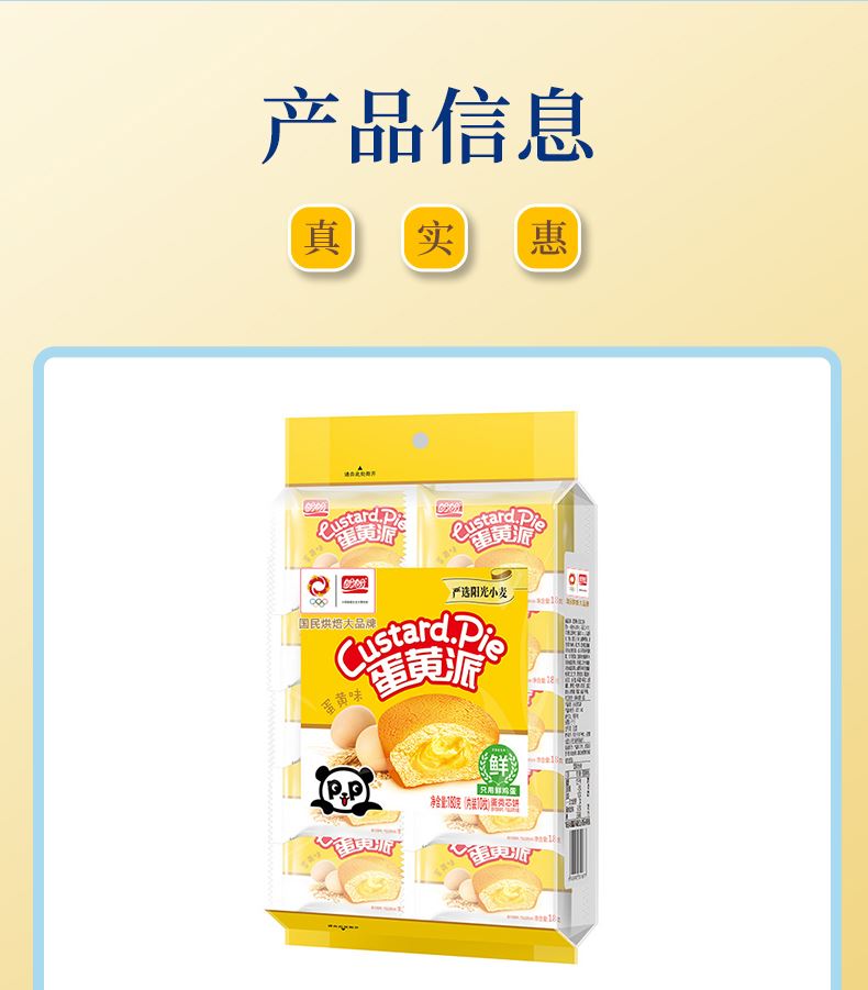 盼盼蛋黄派,是盼盼食品集团旗下的经典糕点。 它采用烘烤工艺制作,松软的蛋糕包裹着细腻的蛋黄注心,口感香甜。产品主要为独立小包装,方便携带与分享,是广受欢迎的休闲零食。 经典注心:蛋黄风味注心,口感香甜。 便捷独立包装:每枚独立包装,卫生便携,适用于早餐、办公、下午茶等多种场景。 老牌品质有保障。