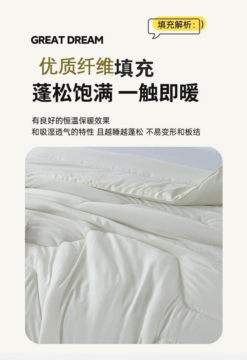 规格:200*230cm 面料:亲肤棉 填充:速热纤维 重量:2000g 执行标准:GB/T22796-2021 安全类别:GB18401-2010 B类 1.精选速热纤维填充,接触肌肤瞬间触发温暖效应,告别被窝冰凉感。 2.立体蓬松结构,既能牢牢锁住身体散发的热量,又能保持空气流通,温暖干爽不闷汗。 3.亲肤棉面料温柔包裹,肌肤仿佛沉浸于云端,带来一整夜的安适与放松。