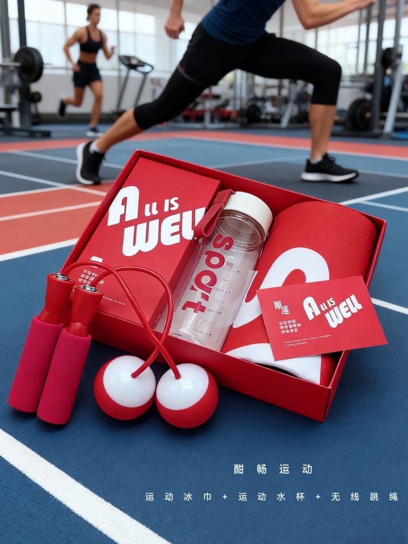 型号: A14B4T2 产品内容 1、七彩运动巾×1 克重48克 30*100CM 2、无线居家跳绳×1 大球6.1CM 直径 软胶球面设计 3、PC运动水杯×1 新款加大容量650ML 直径:7CM 外盒:29.5×21×7.4cm 天地盖+拎袋 居家无线跳绳 采用大号球体 软胶设计 模拟真实跳绳感受 红色主题运动冰巾设计融入祝福语言 期待美好即将发生 红色PC主题运动杯 设计简约 材质优异 给秋冬带去活力无限