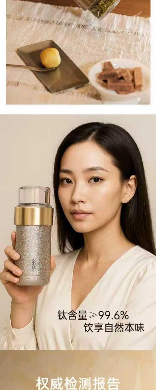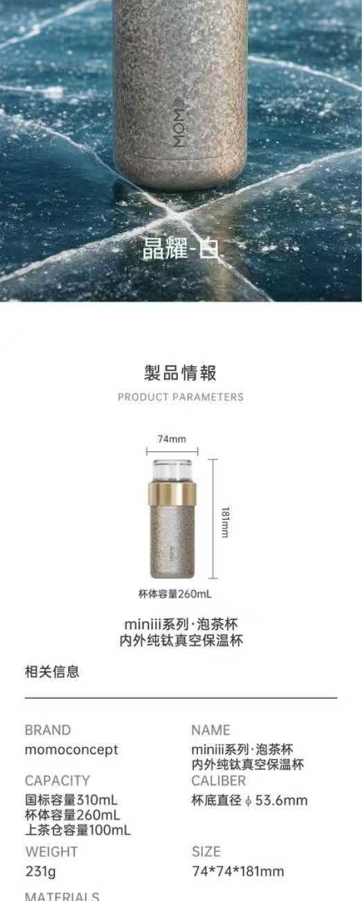 产品材质:纯钛(含钛99%以上)杯体内胆-钛TA1杯体外壳-钛TA1中盖金属圈-奥体304不锈钢中盖茶隔-钛TA1中盖盖体-食品接触用PP上盖茶仓-Tritan(改性PCT) 容 量:国标容量310mL /杯体容量260mL /上茶仓容量100mL 口 径:53.6mm 颜 色:晶耀-白 产品尺寸:74*74*181mm 产品净重量:231g 整箱数:12只/箱 产品卖点:泡茶新体验茶水分离 纯钛茶隔 过滤茶渣 无重金属析出 泡茶更安心 生活伴侣 健康茶生活 便携差旅 办公茶饮 车载随行 礼赠贵人