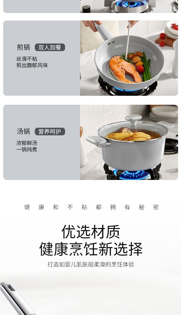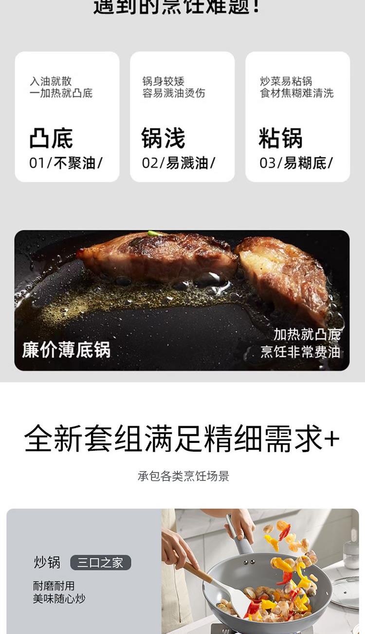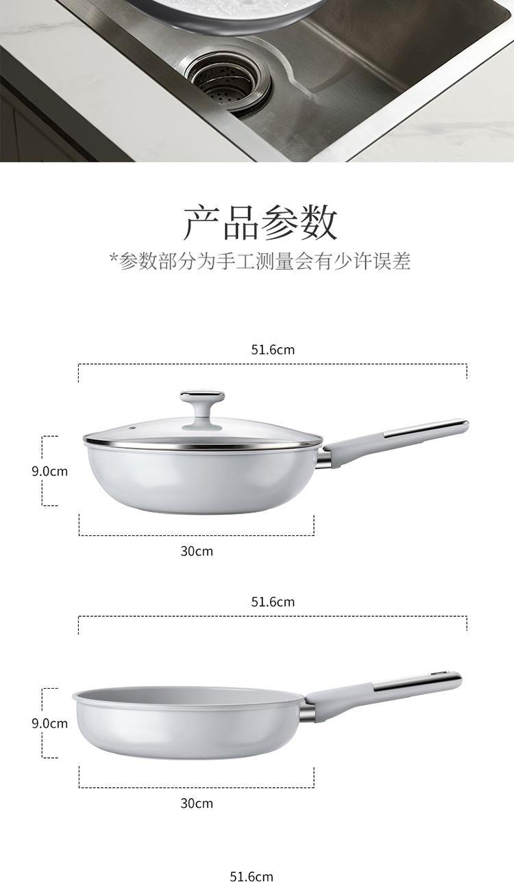 产品配置:30cm炒锅、24cm汤锅、24cm煎锅 产品材质:精铁YT0 产品涂层:聚四氟乙烯(食品接触用) 包装方式:彩盒+外箱 1、符合卫生标准的不粘工艺,健康安全,可放心使用; 2、人性化高强度钢化玻璃盖,持久耐用,烹饪美味一目了然; 3、锅沿防滴漏设计,可将汤汁轻松倒出,使用方便; 4、精铁材质制造,传热更快,受热均匀; 5、锅身外壁陶瓷源于天然无机物,耐高温耐腐蚀 ,易清洗久用如新; 6、隔热防烫手柄,符合人体工程学,使用舒适自然。