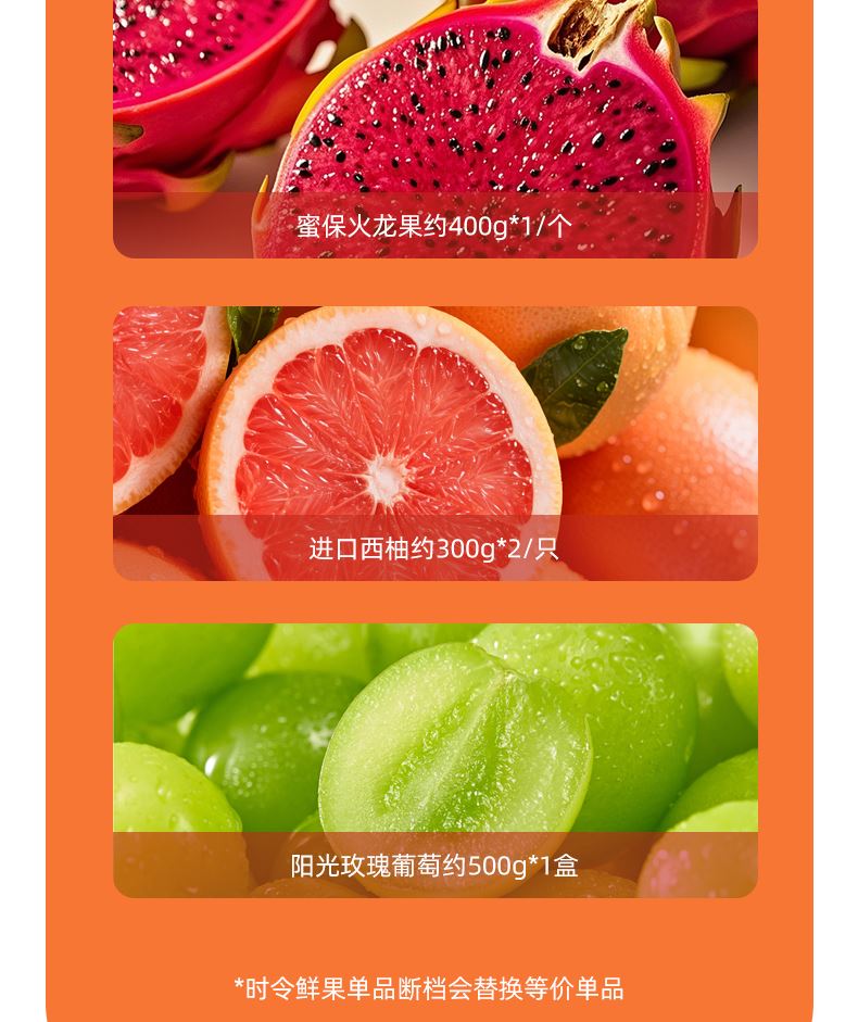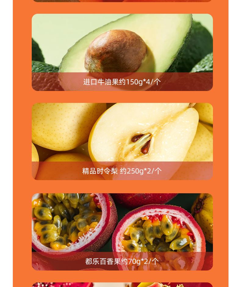 "都乐菲律宾进口菠萝约1200g*1/个 都乐网纹瓜约1000g*1/只 新西兰红玫瑰苹果180g*4/个 新奇士进口脐橙 约220g*2/个 进口牛油果约150g*4/个 精品时令梨 约250g*2/个 都乐百香果约70g*2/个 蜜保火龙果约400g*1/个 进口西柚约300g*2/只 阳光玫瑰葡萄约500g*1盒 ( 时令鲜果单品断档会替换等价单品)"