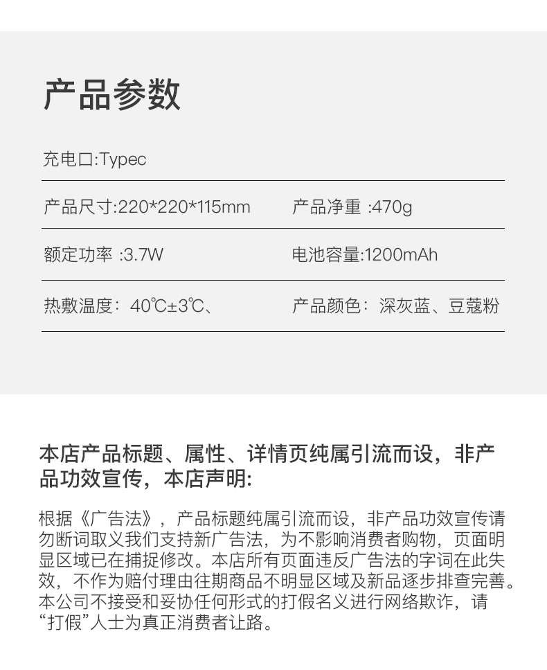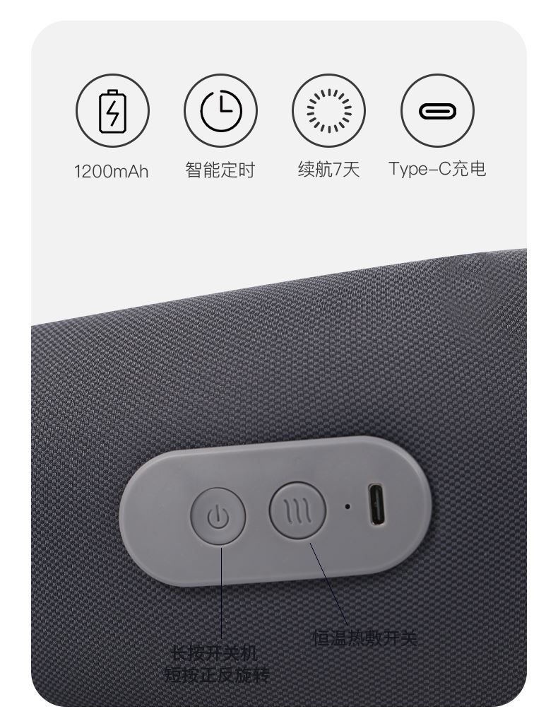 材质:瑜伽布料,回弹记忆棉,PU材质 充电口:TypeC 产品尺寸:220*220*115mm 产品净重:500g 额定功率:3.7W 电池容量:1200mAh • 仿真人双头按摩手感 强电机高配 • 360°环颈支撑 高密度回弹记忆棉 • C口便携可充电 智能定时15分钟模式, • 恒温热敷功能可选 质保一年 只换不修