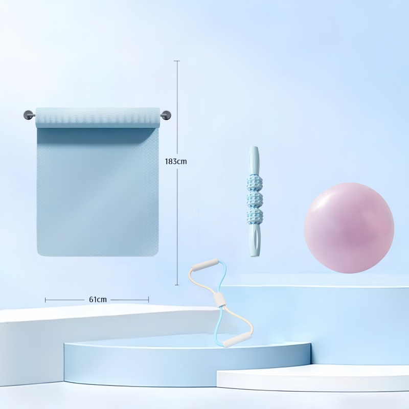 材质:瑜伽垫:TPE 按摩棒:ABS 瑜伽球:PVC 25CM 拉力绳:PE 30磅 规格:瑜伽垫:183*61*6cm 按摩棒:33cm 组合形式:(瑜伽垫按摩棒瑜伽球拉力绳)