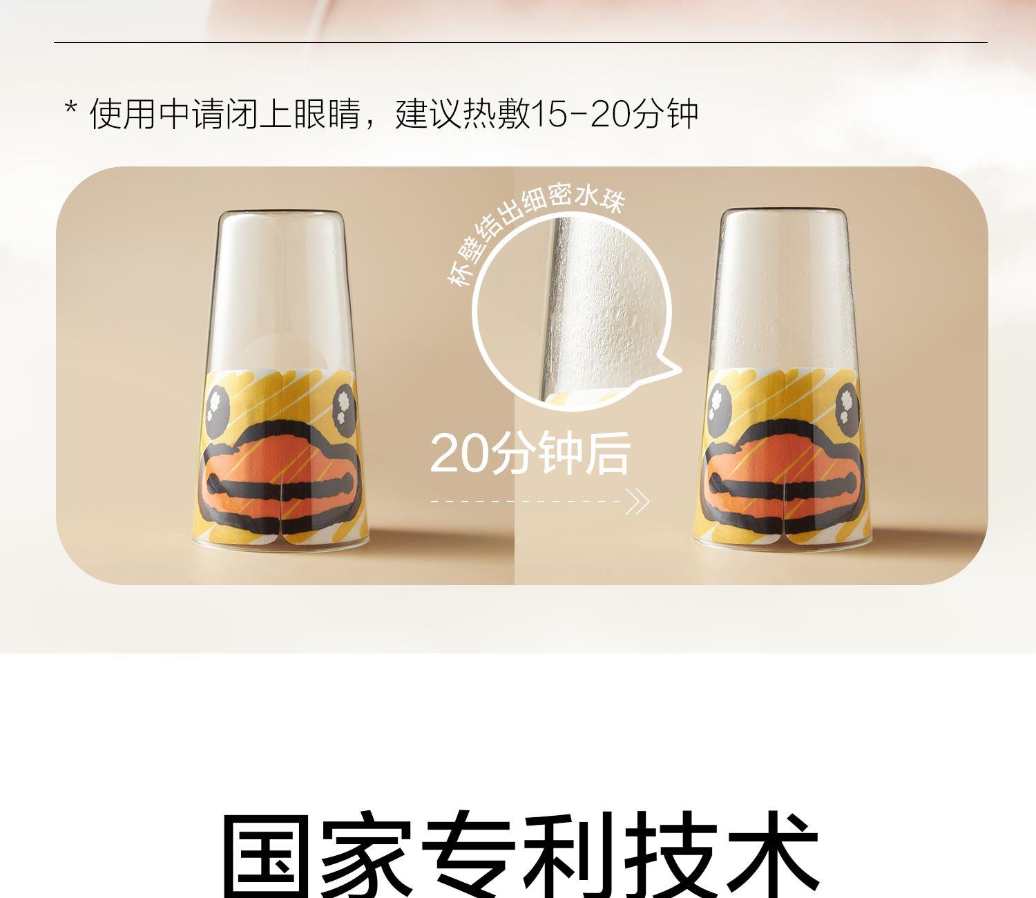 规格:1片/袋 10袋/盒 香型:小黄鸭小艺术家系列 洋甘菊 保质质:3年 1.可感蒸汽,温润眼周,持久发热,给眼部来一场沉浸式桑拿体验。 2.洋甘菊、薰衣草精油添加,选择喜爱的香味入眠。 3.小云朵面料,呵护眼周脆弱肌肤;弱弹力耳挂,弹力适中,适合大小脸型;贴合工艺,静享眼部SPA。