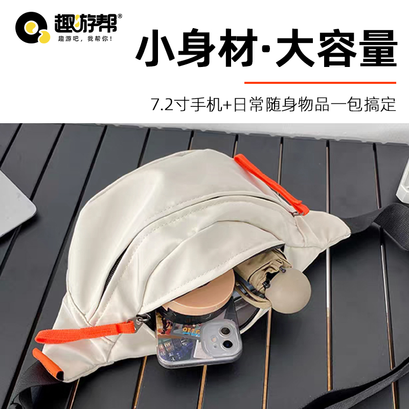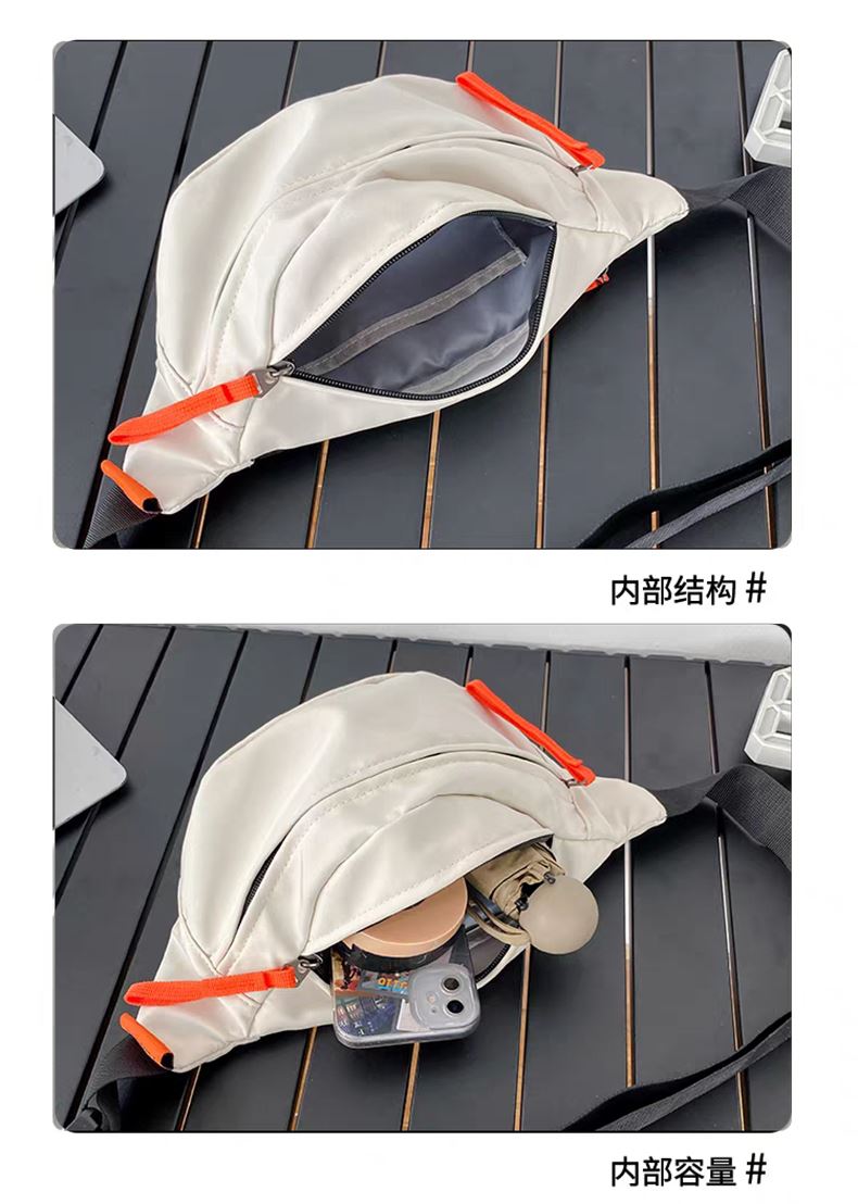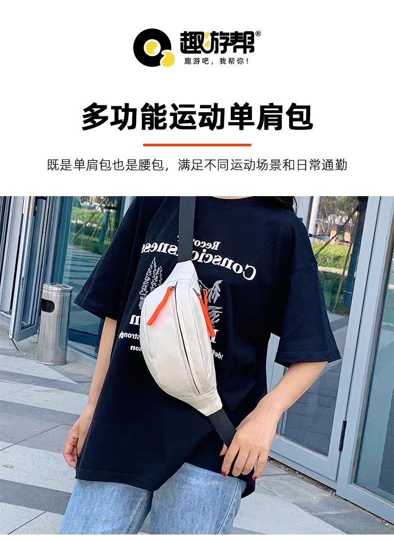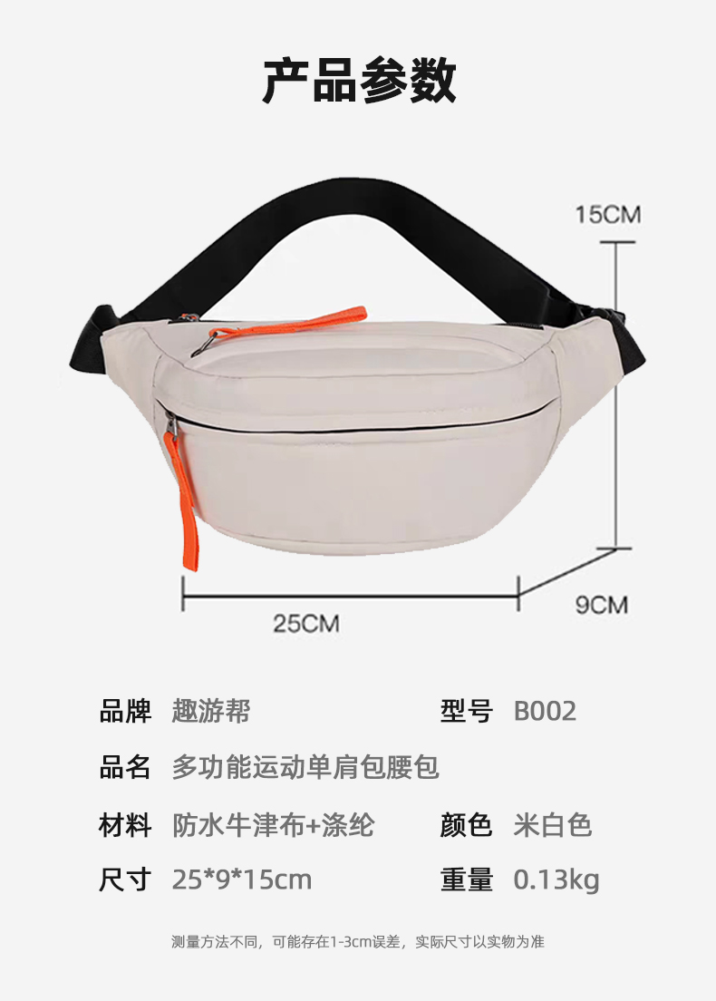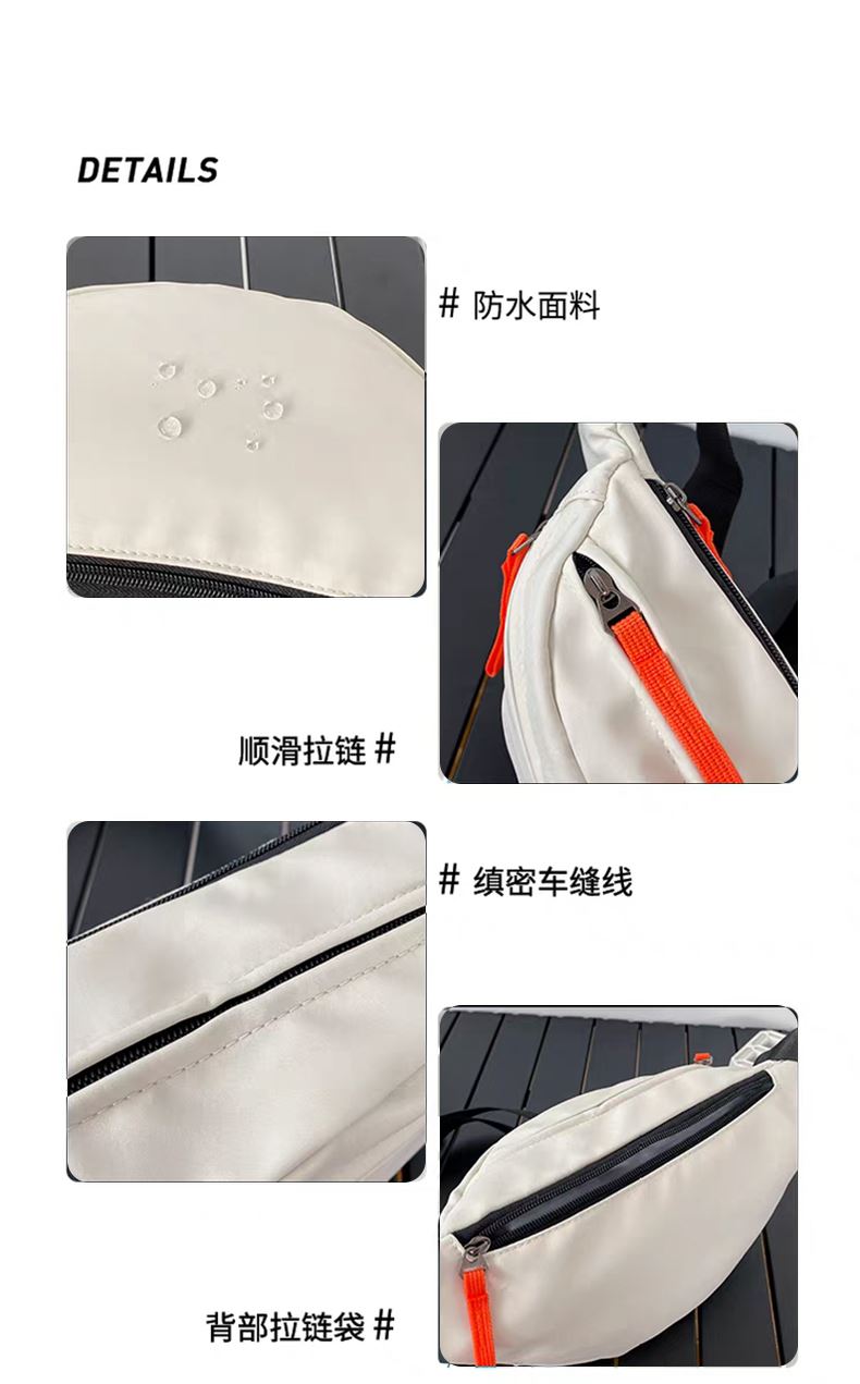 材质 防水牛津布+涤纶 颜色 米白色 尺寸 25*9*15cm (测量方法不同,可能存在1-3cm误差,实际尺寸以实物为准) 重量 0.13kg 一包两用,自由切换, 既是单肩包也是腰包,满足不同运动场景和日常通勤、出行的需求,使用灵活度高 高效分区收纳,方便物品分类存放,快速取用常用小物,避免翻找 轻便耐用,轻量化、高耐磨、抗撕裂和易打理,适合 运动环境