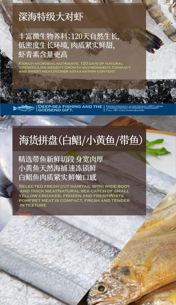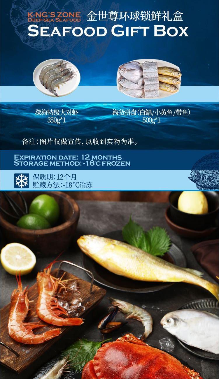 深海特级大对虾(盒装)350g*1盒 海货拼盘(白鲳/小黄鱼/带鱼等)500g*1包 保温箱+保温措施*1 宅配到家,宅配包装为泡沫盒塑封不含彩盒