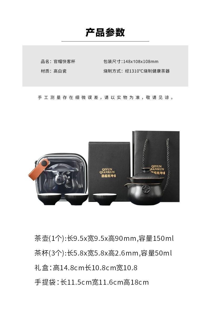 包装规格:10.8*10.8*14.8cm 定制:产品包装均可定制logo 组件:一壶三杯+旅行包 材质:高白瓷 颜色:黑/白