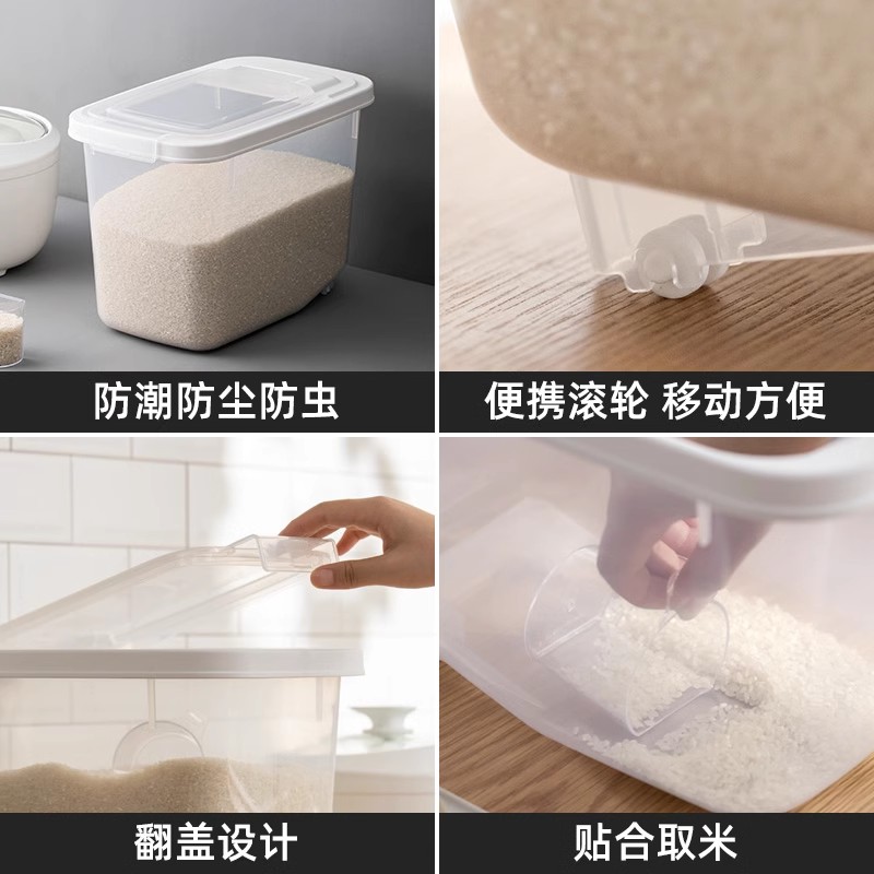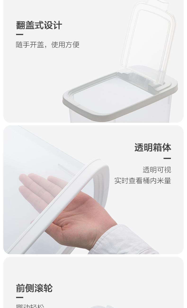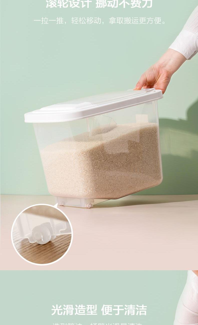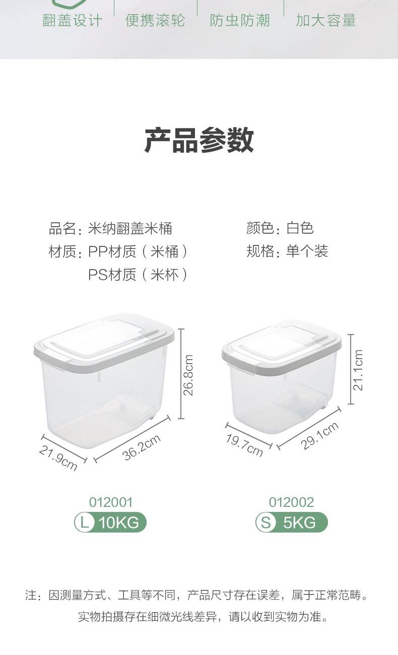 产品货号:012002 产品尺寸:29.1*19.7*21.1CM 产品容量:5KG 产品克重:472.2g 外箱尺寸:60*30.5*53.5CM 包装方式:1PC/OPP BAG 产品颜色:白色 防尘侵入,安心储藏 滚轮设计,一抬一拉,挪动不费劲 光滑流线造型,便于清洁