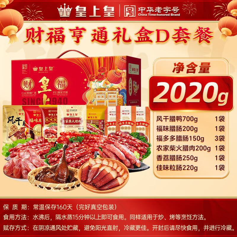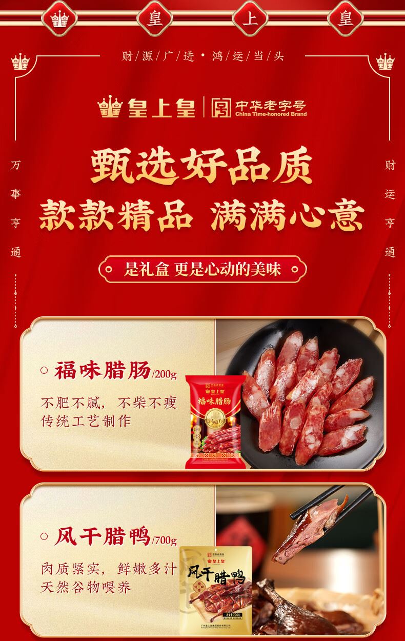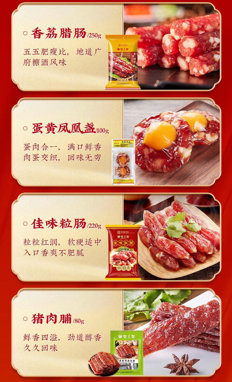 风干腊鸭700g*1 福味腊肠200g*1 猪肉铺80克*1 福多多腊肠150g*2 农家柴火腊肉200g*1 香荔腊肠250g*1 蛋黄凤凰盏100g*1 佳味粒肠220g*1