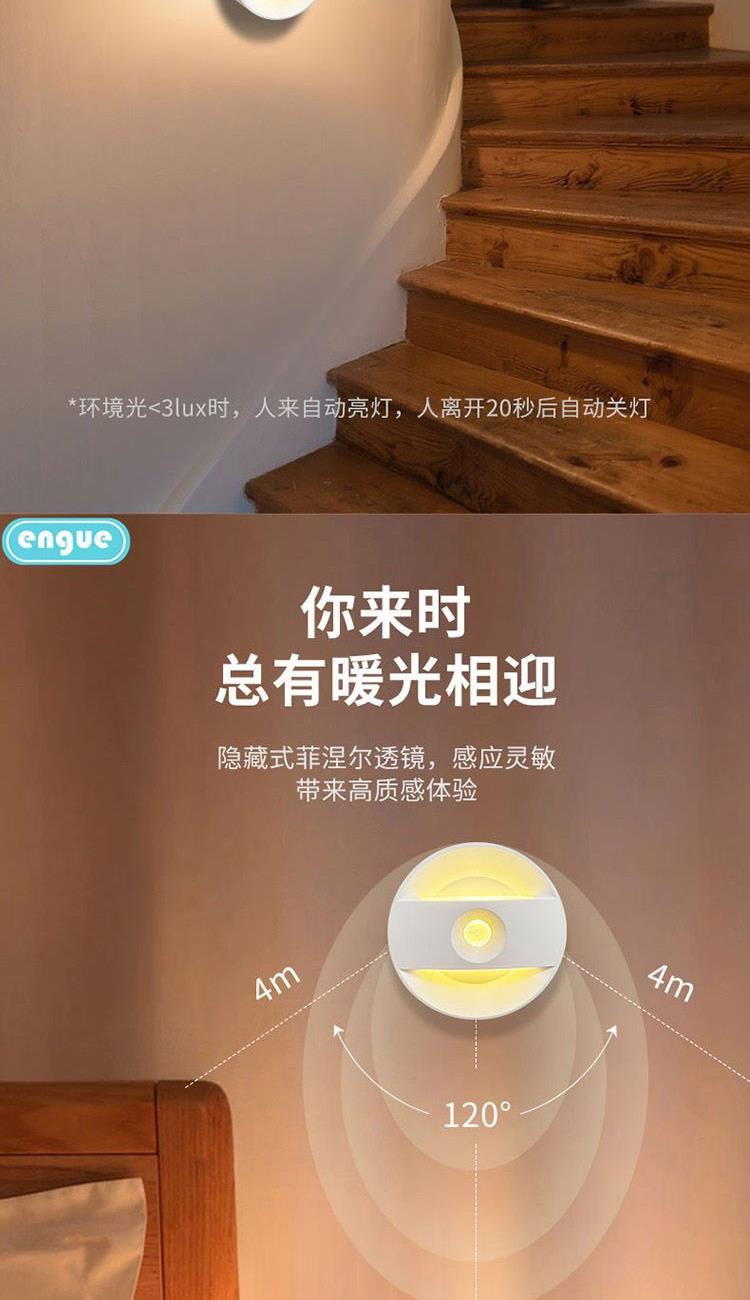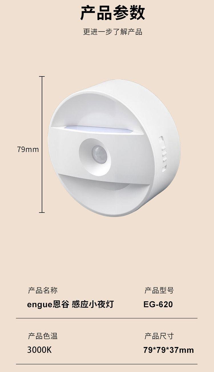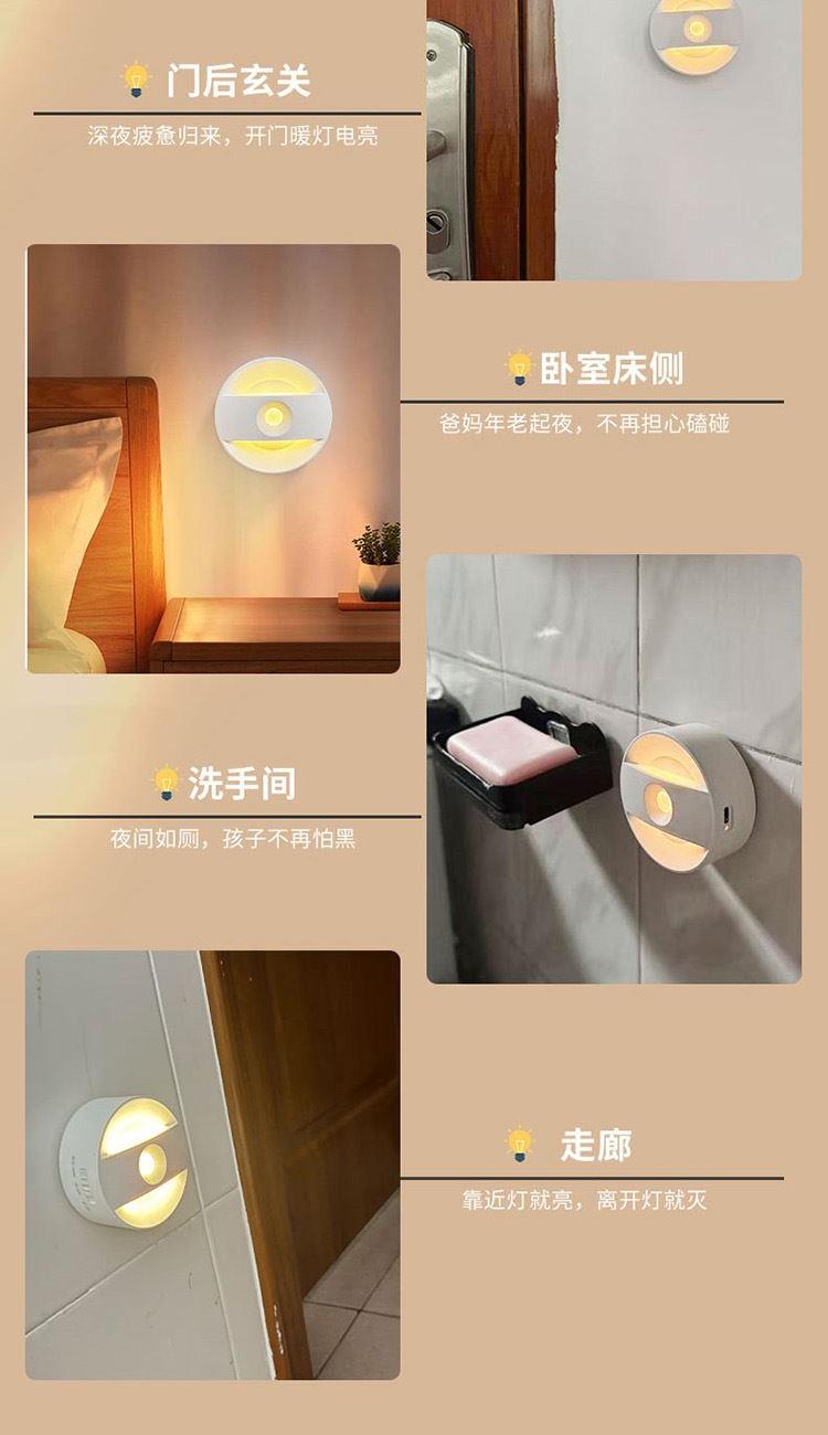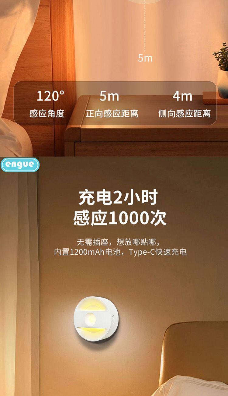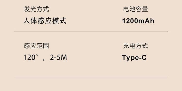 LED功率:1.2W,12颗LED 材质:PVC 色温:3000K(暖白光) 电池容量:1200mAh 充电时间:3小时 续航时间:4小时 充电方式:Type-C 净 重:80g 开 关:拨动开关 尺 寸: 79*79*37mm 防水等级:IPX-5生活性防水 感光范围:120°,2-5米 持续时间:20S