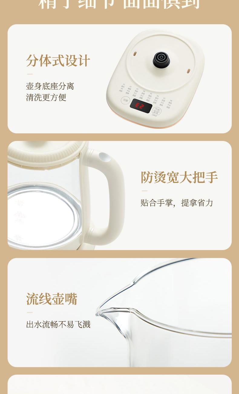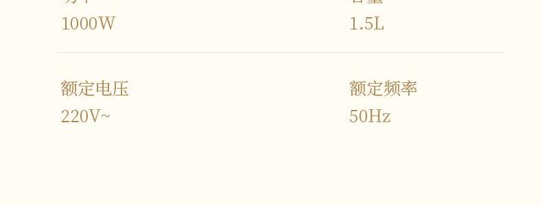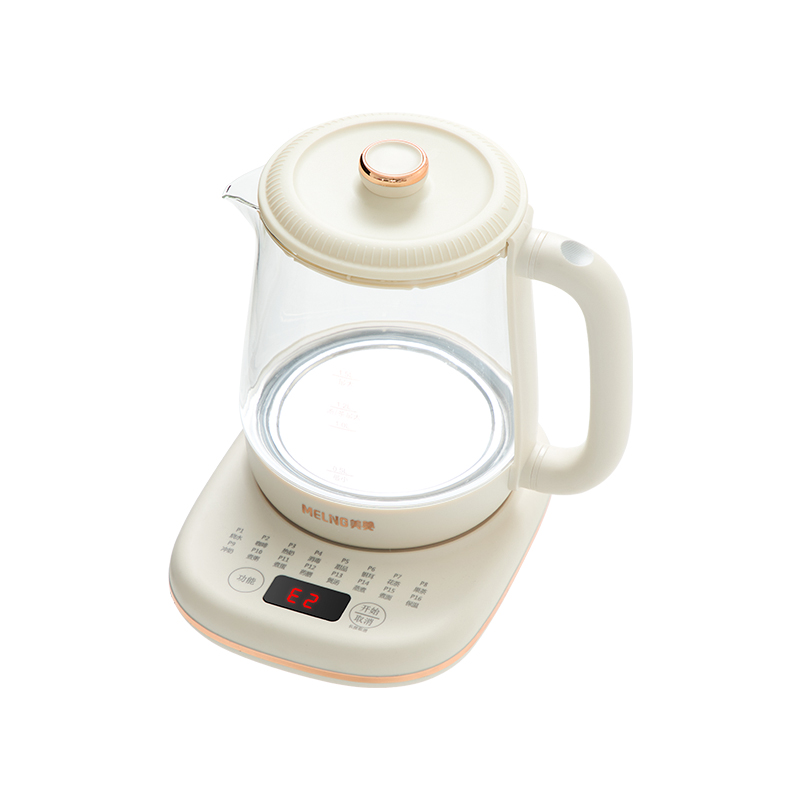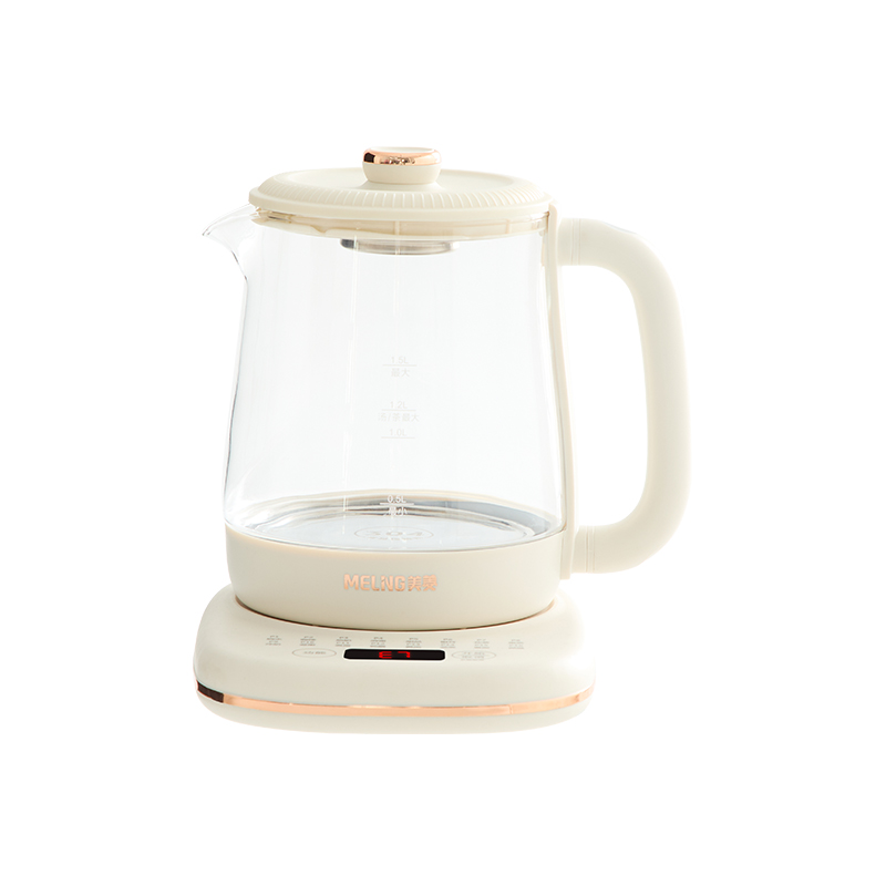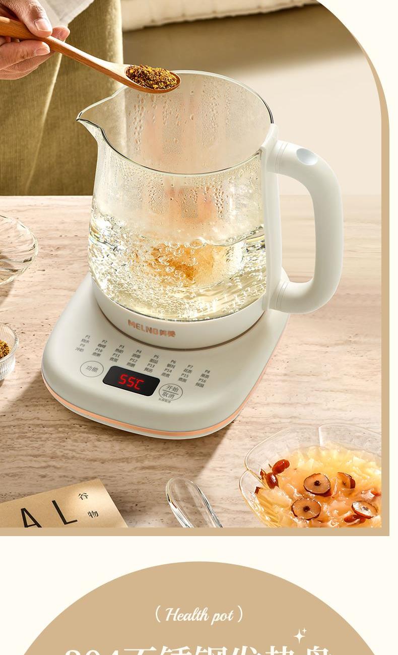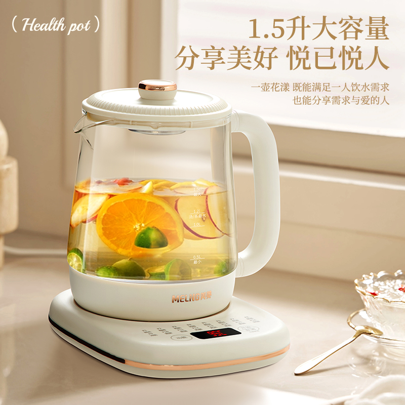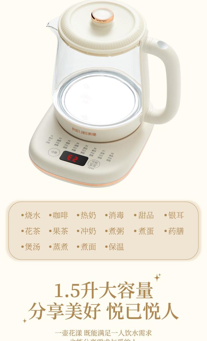 参数: 额定功率:1000W 额定容量:1.5L 材质:高硼硅玻璃、304不锈钢 彩盒尺寸:243*251*235mm 卖点: 1,触摸式感应按键,数码屏显示 2,采用高硼硅玻璃+不锈钢304茶网,壶身耐高 温,骤冷骤热不爆裂。 3,时尚外观,防干烧设计,24小时时间预约。 4,食品级304不锈钢发热盘。 5,交叉形铝管加热