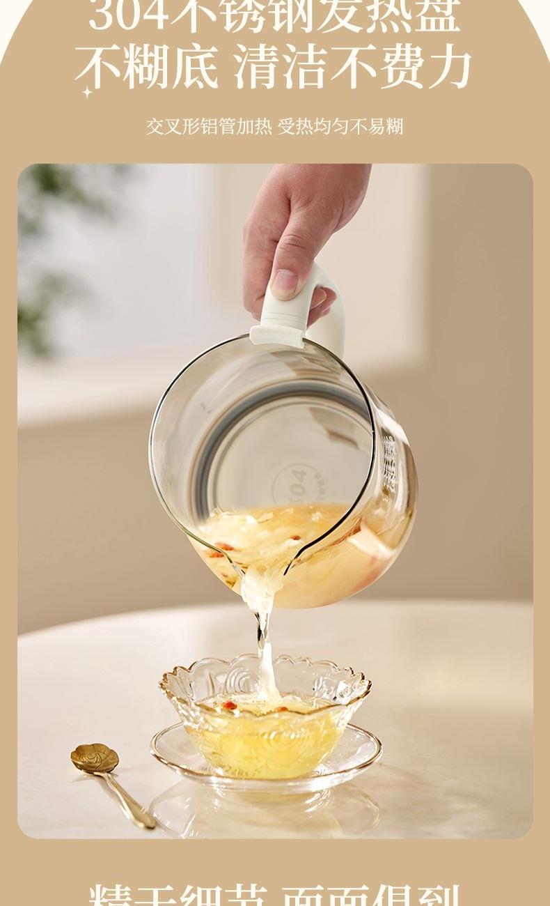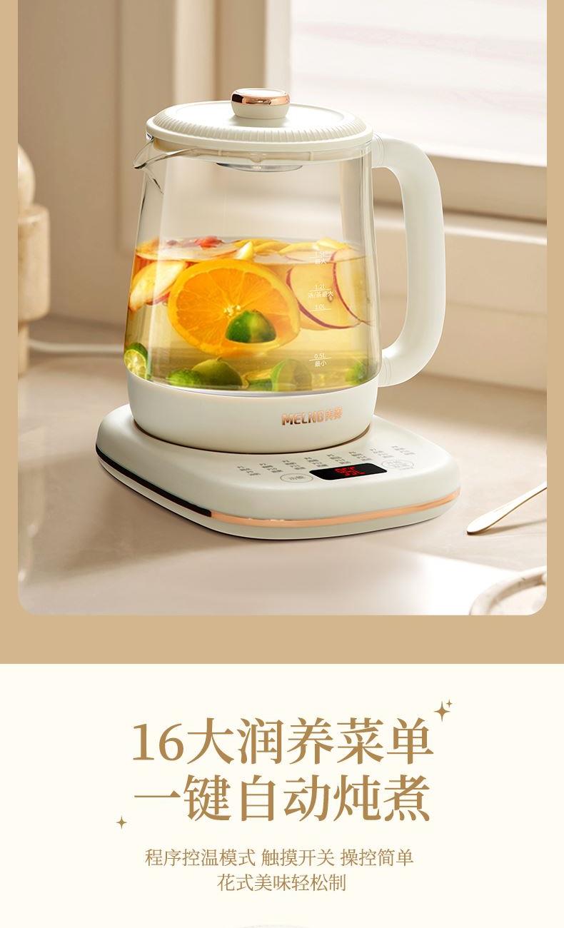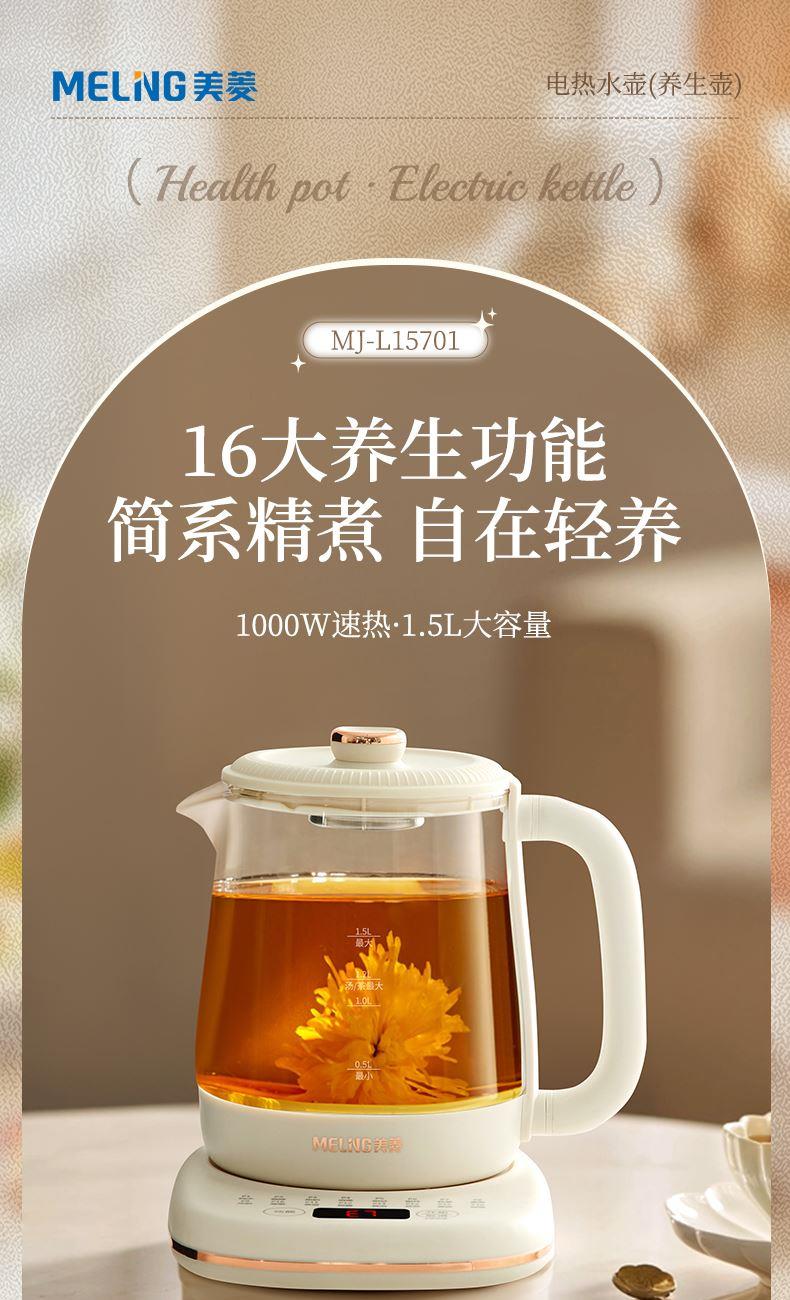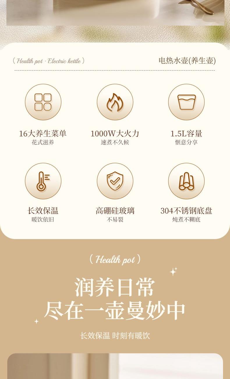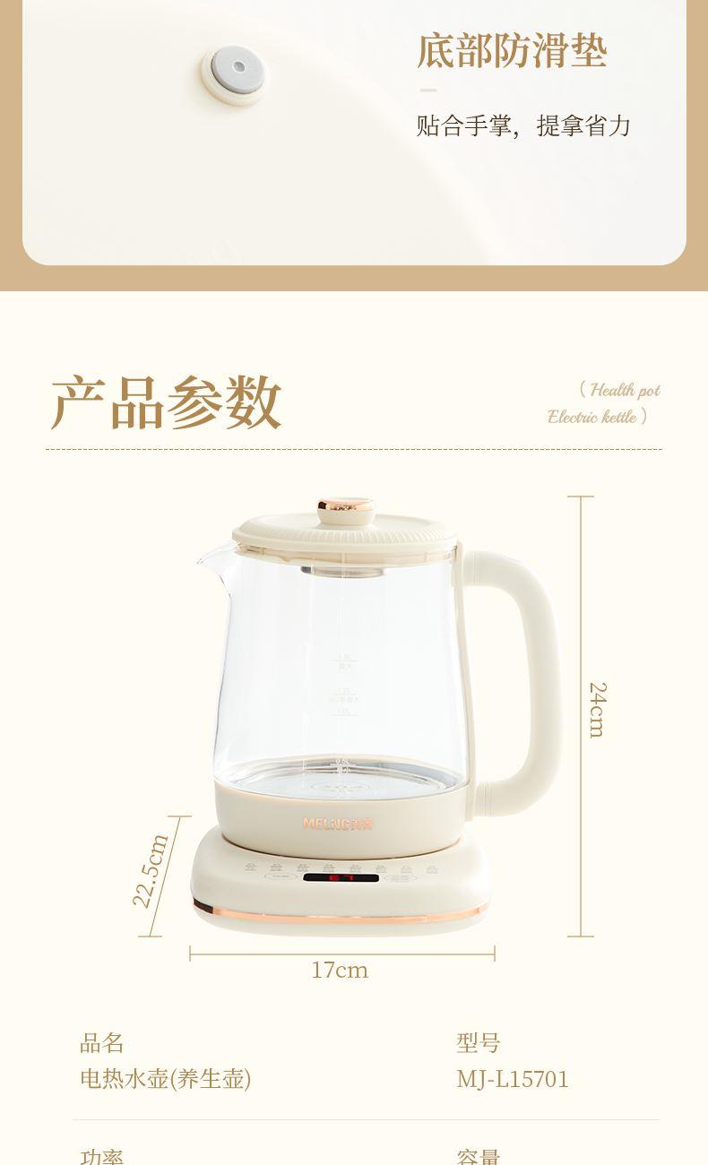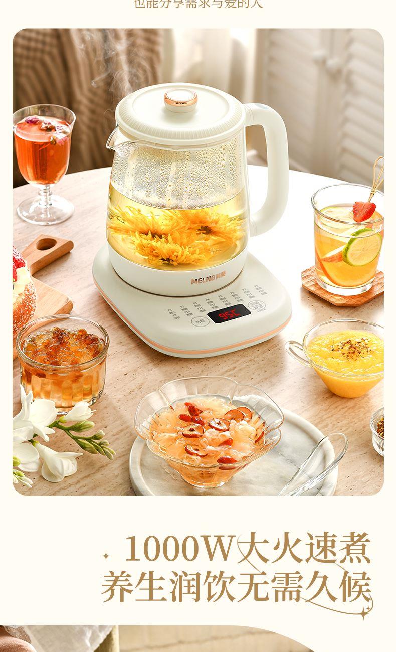 参数: 额定功率:1000W 额定容量:1.5L 材质:高硼硅玻璃、304不锈钢 彩盒尺寸:243*251*235mm 卖点: 1,触摸式感应按键,数码屏显示 2,采用高硼硅玻璃+不锈钢304茶网,壶身耐高 温,骤冷骤热不爆裂。 3,时尚外观,防干烧设计,24小时时间预约。 4,食品级304不锈钢发热盘。 5,交叉形铝管加热