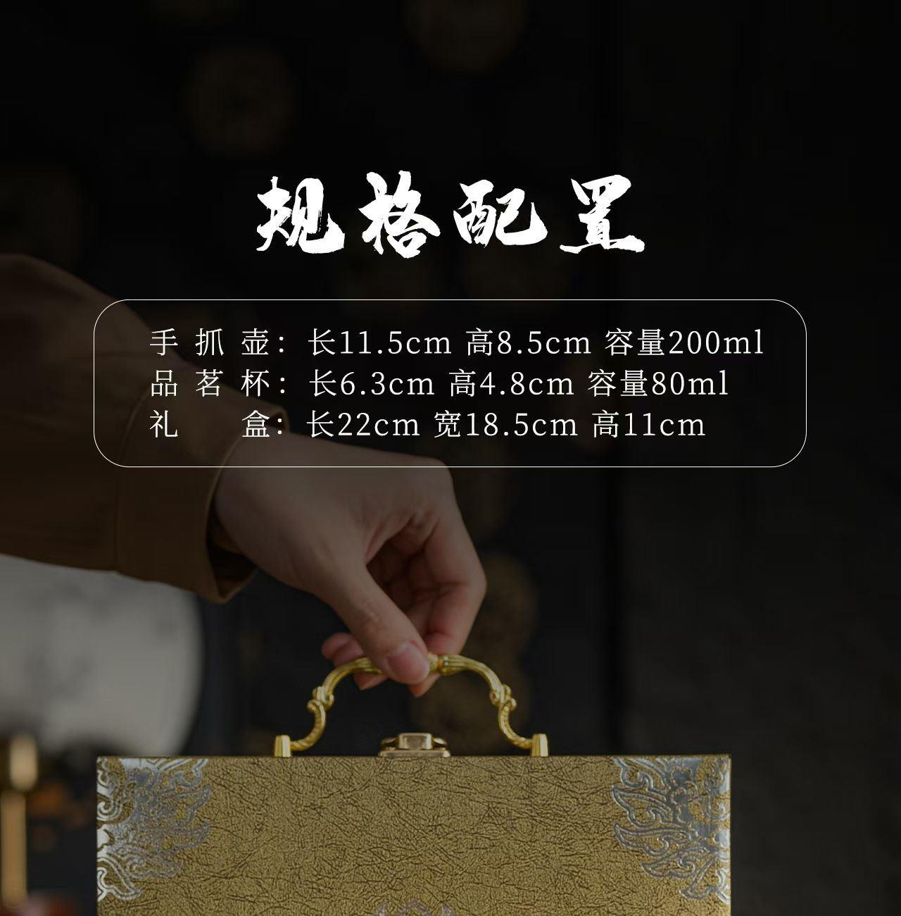 配置:茶壶*1,茶杯*2. 尺寸:手抓壶:长11.5cm高8.5cm容量200ml, 品茗杯:长6.3cm高4.8cm容量80ml, 礼盒:长22cm 宽11cm 高18.5cm。