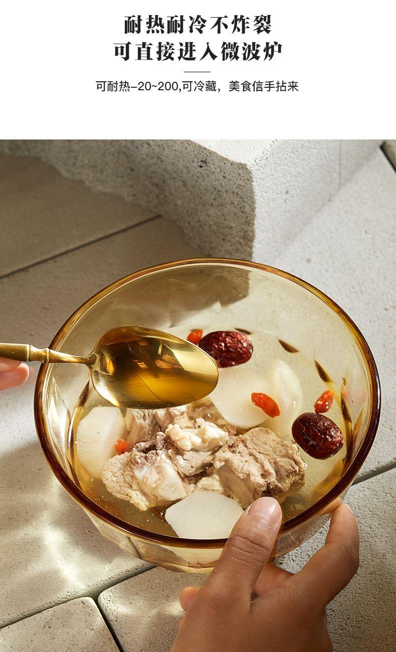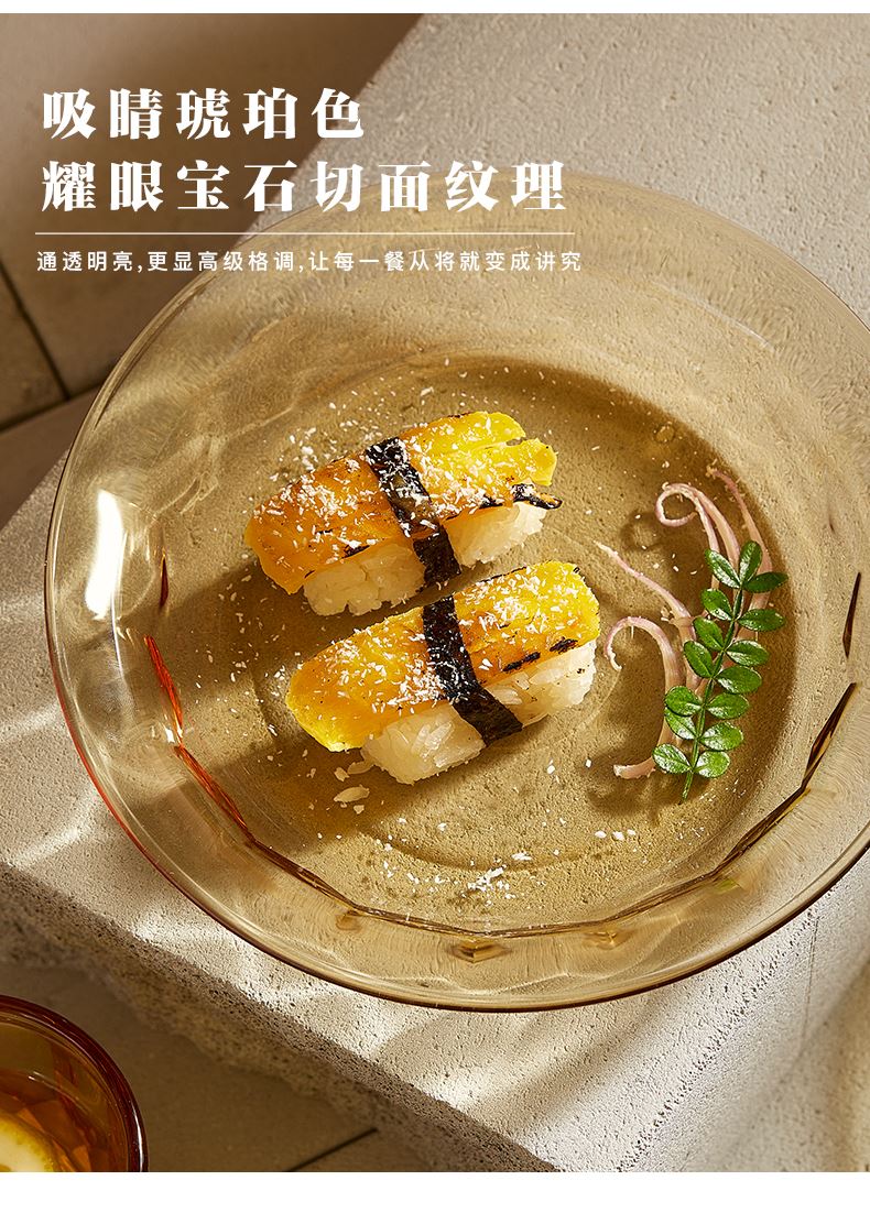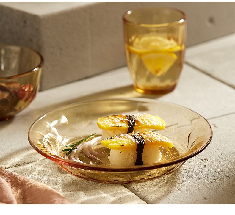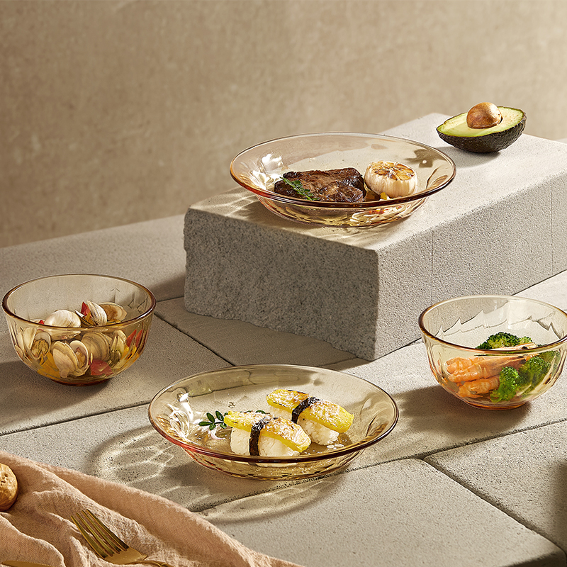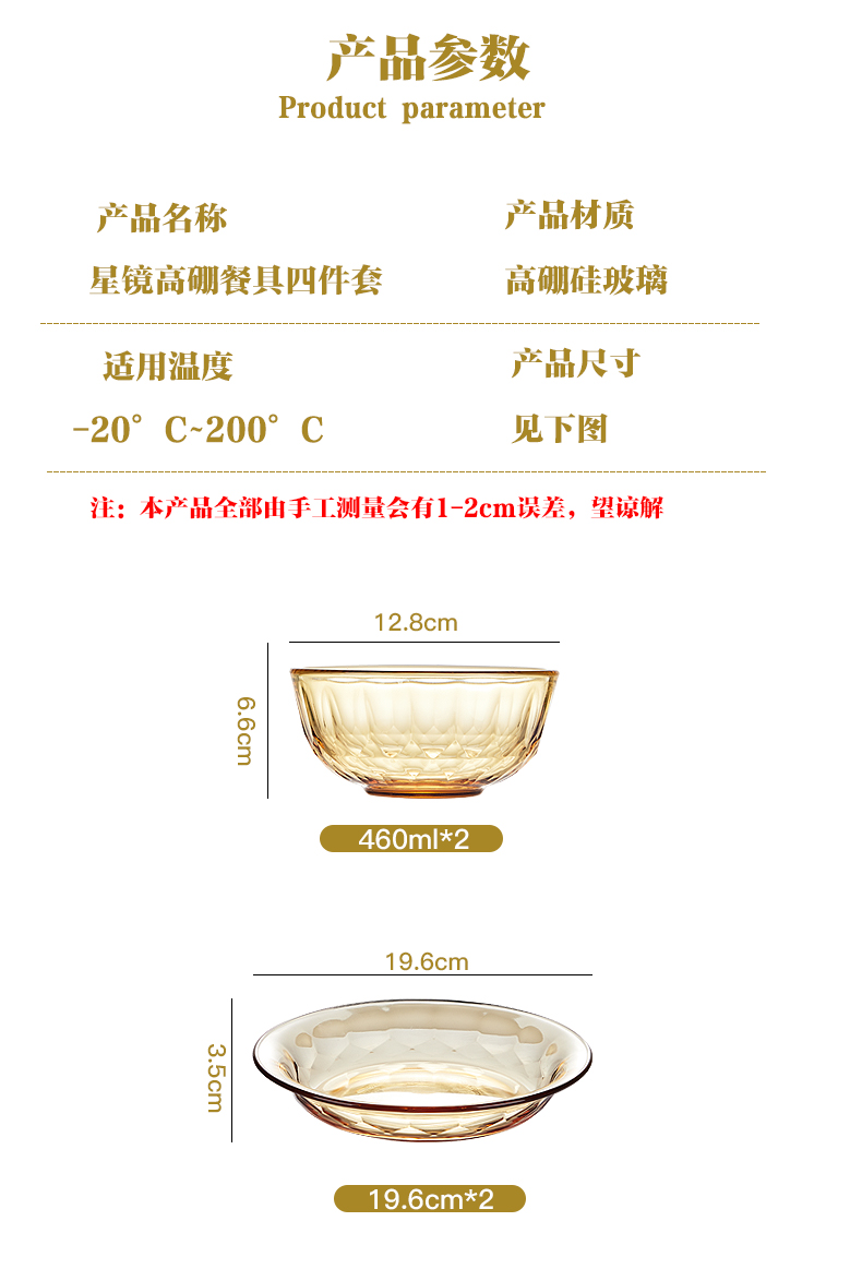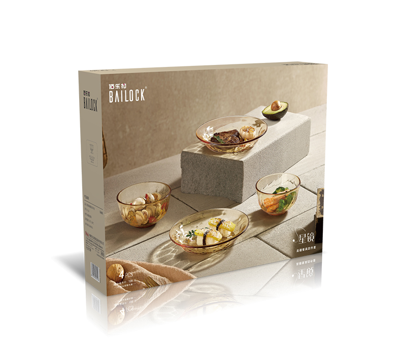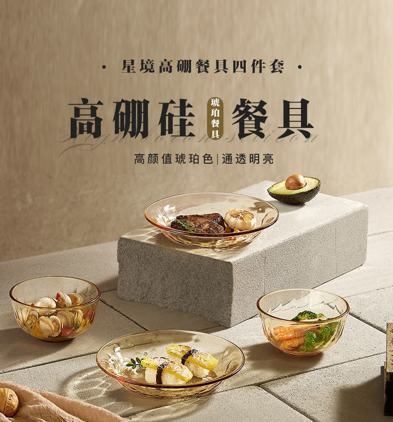 适用温度:-20°C-200°C 材 质:高硼硅玻璃 产品参数:小碗460ml*2、 盘196mm*2 彩盒尺寸:342*82*259mm 外箱尺寸:43.5*35.4*53.7cm 产品卖点:1.产品采用高硼色料玻璃材质,颜色与生俱来,永不退色。烤箱、微波炉、冰箱冷冻放心使用。 2.星境高硼餐具设计理念,用线条勾勒几何切面,以面为境折射时光、徜徉星空。 3.触感温润,质感光滑,为您的餐桌增添一抹高雅。