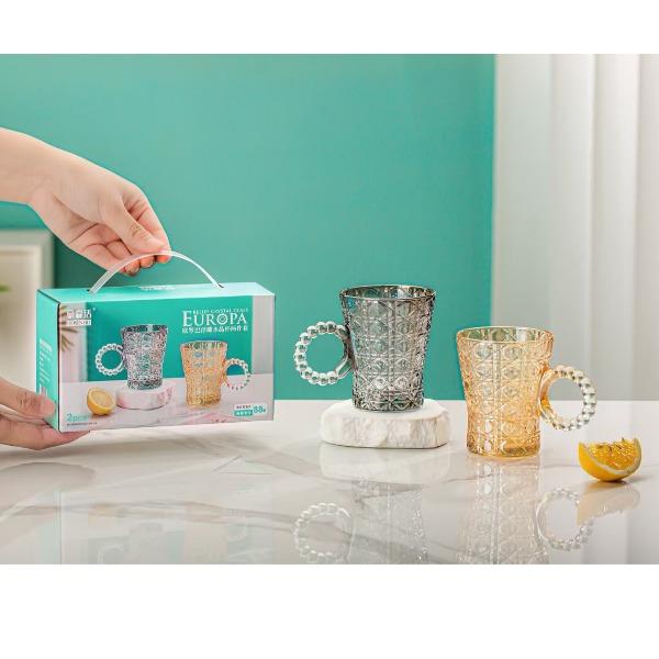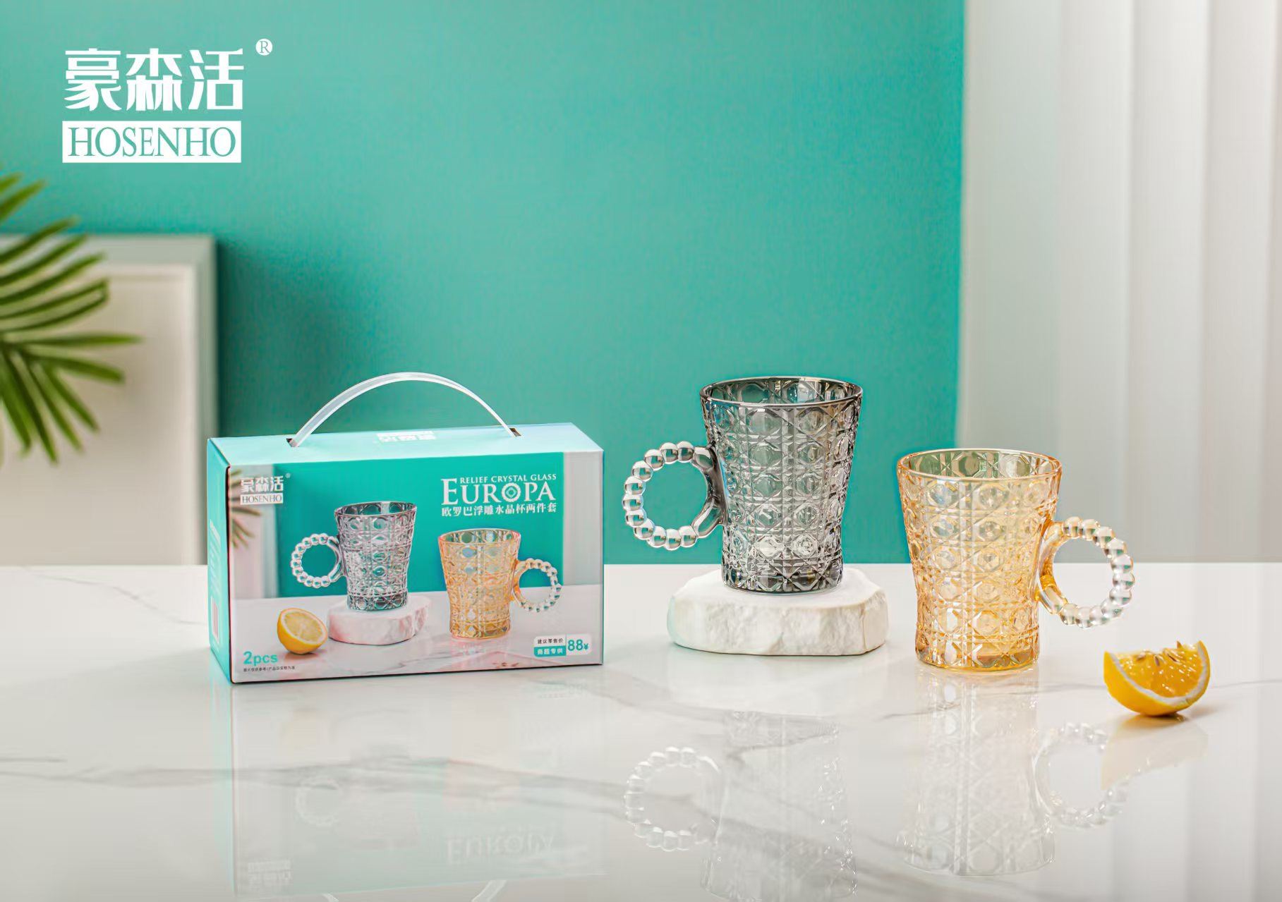 货号:OLB-L2 规格:1*36套 容量:杯:240ml*2 彩盒尺寸:17.2*8.2*10.5cm 外箱尺寸:50.4*27.6*41.6cm 条 码:6976254570559 产品卖点 欧式棱格高透质感,杯身外壁浮雕效果,尽享高贵加厚环保材质,防潮,不变色无异味。细致打磨圆润杯口如珍珠般触感,尽享舒适体验创意珍珠链手柄,拿握更舒适。一杯多用满足各种需求。实用方便,是促销、商务、会议和福利礼品之优选。