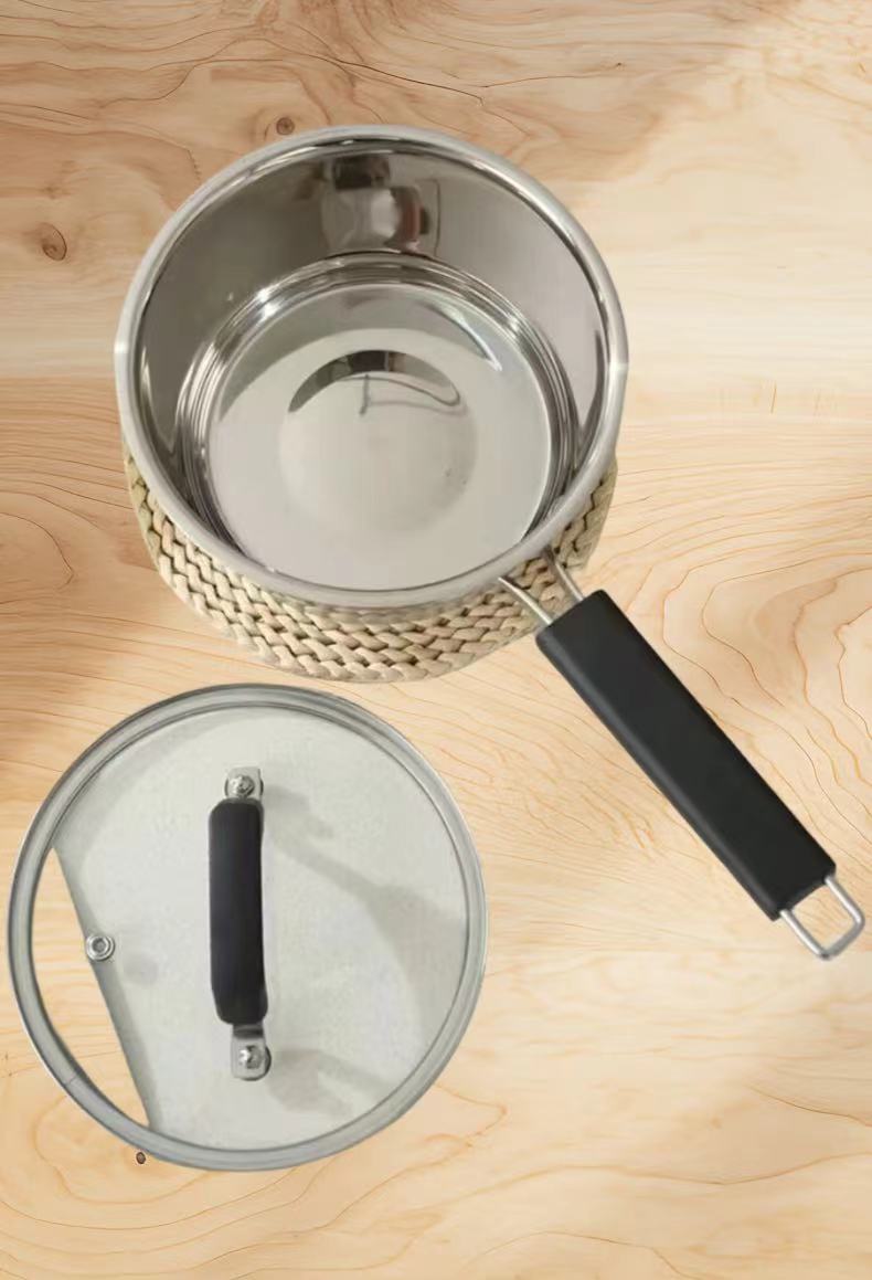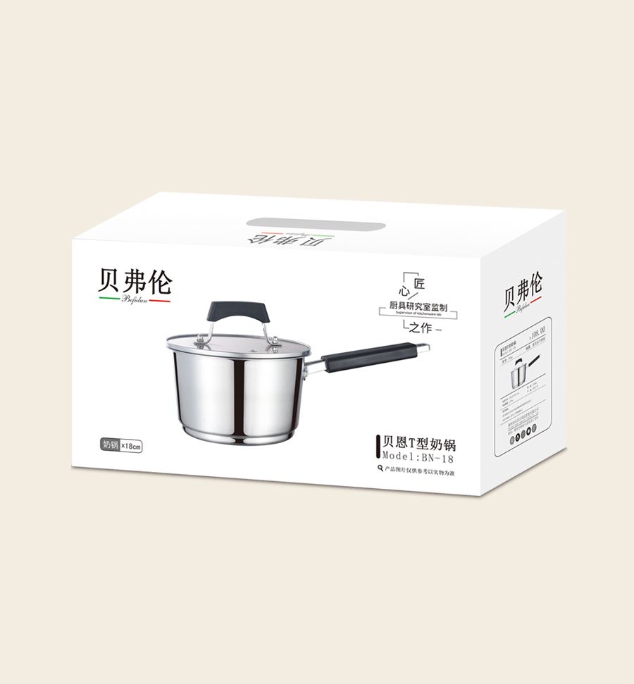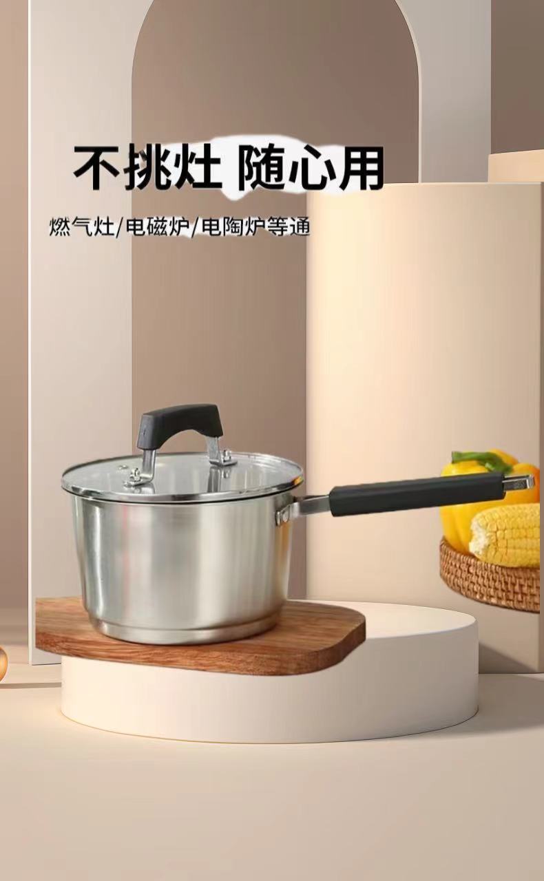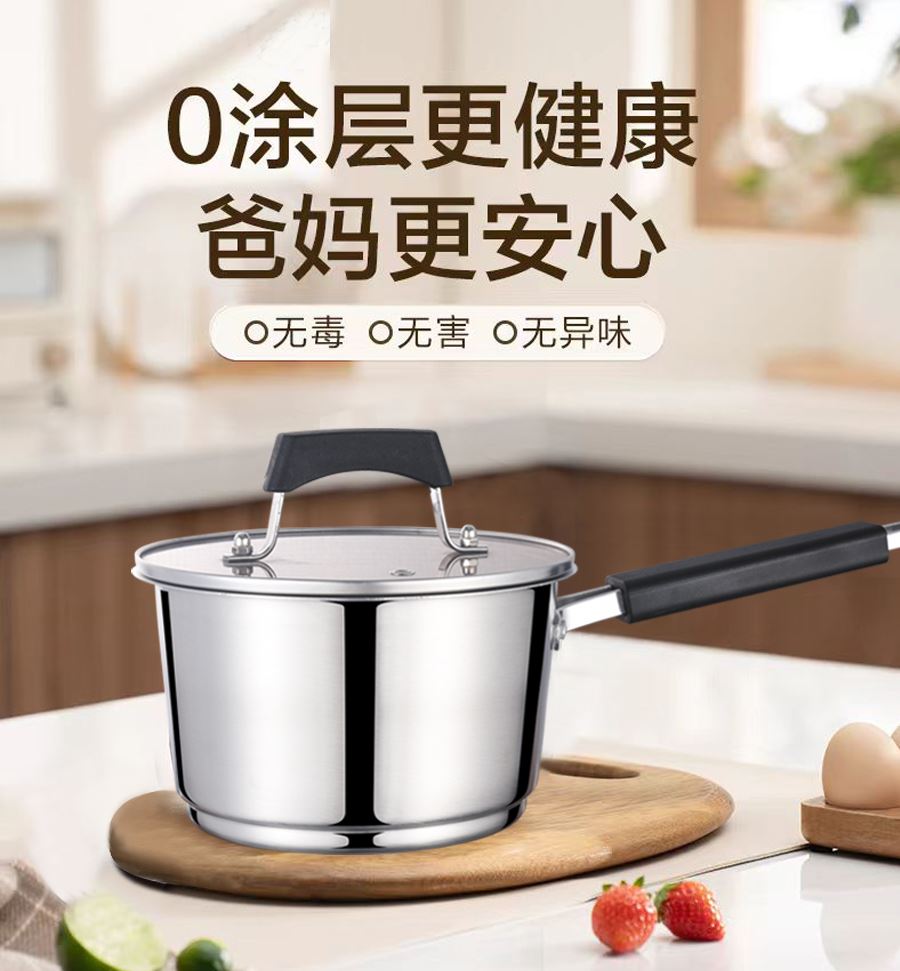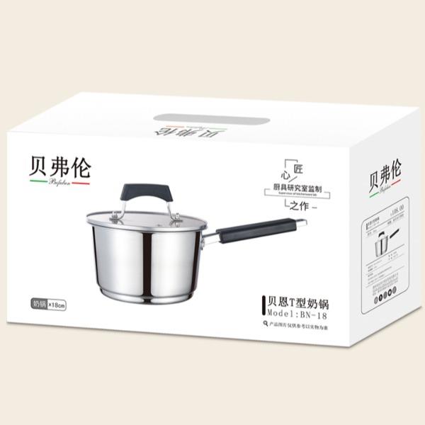 尺寸:18cm 材质:奥氏体不锈钢(201) 包装尺寸:35*12.6*19.5cm 包装重量:1.05kg 优质不锈钢锅体,精细砂光,美观耐用 T型锅底,迅速加热 新型电木防烫手柄,握感舒适,更易取放 奶锅满足家庭简单所需
