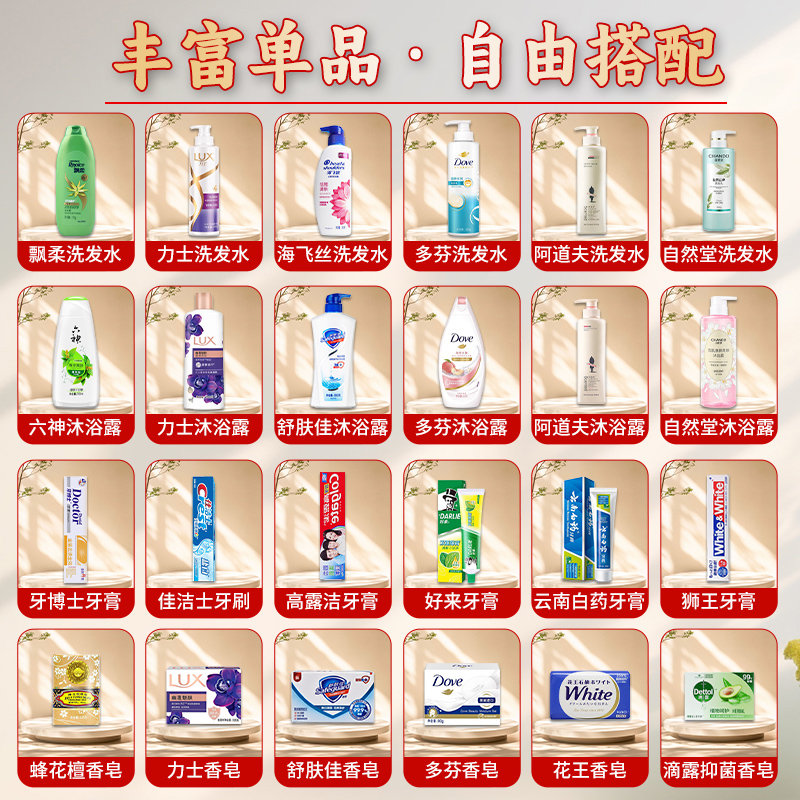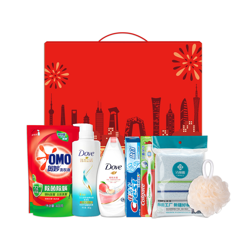 礼盒尺寸:32*8.5*24.5cm 包装尺寸:66*46.5*51CM 产品配置:(香型随机) 多芬洗发水380ml 多芬沐浴露300ml 奥妙洗衣液400g 佳洁士牙膏90g 洁丽雅毛巾69*33cm 高露洁牙刷三重深洁 沐浴球