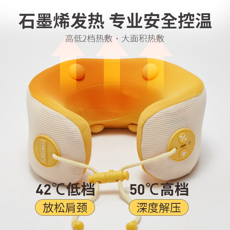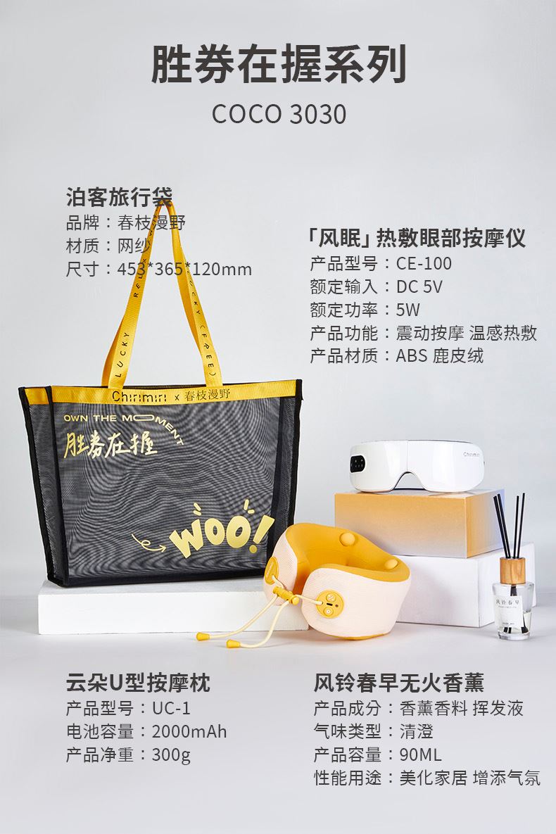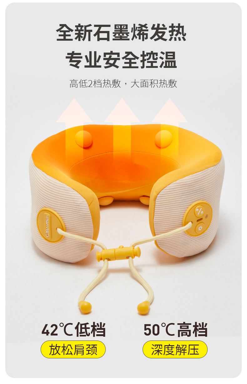 ① 云朵U型按摩枕 产品型号:UC-1 电池容量:2000mAh 产品净重:300g ② 「风眠」热敷眼部按摩仪 型号:CE-100 材质:ABS 鹿皮绒 颜色:浅云白、桃夭粉 ③ 风铃春早无火香薰 产品成分:香薰香料 挥发液 气味类型:清澄 产品容量:90ml 轻盈绵柔X环颈暖敷 ,随享云朵般舒适。 2档大面积热敷,颈部温柔包裹,每一次依靠都变成舒适的拥抱。 3大模式,振动直击颈部酸胀点,让颈部舒享放松。 4大硅胶按摩头,还原指尖触感,soft微振高低有序。360°曲面环颈承托,轻享颈部按摩,释放「颈」张情绪。 温感热敷,轻柔呵护眼周 180°折叠,轻巧便携,随享按摩 释放眼部肌肉压力,舒缓放松,快速入眠 鹿皮绒内衬,包裹柔软透气,方便清洁 四挡模式,养眼,挑选你的专属温度。 轻量出行,有颜能装, 用气味牵动情绪~