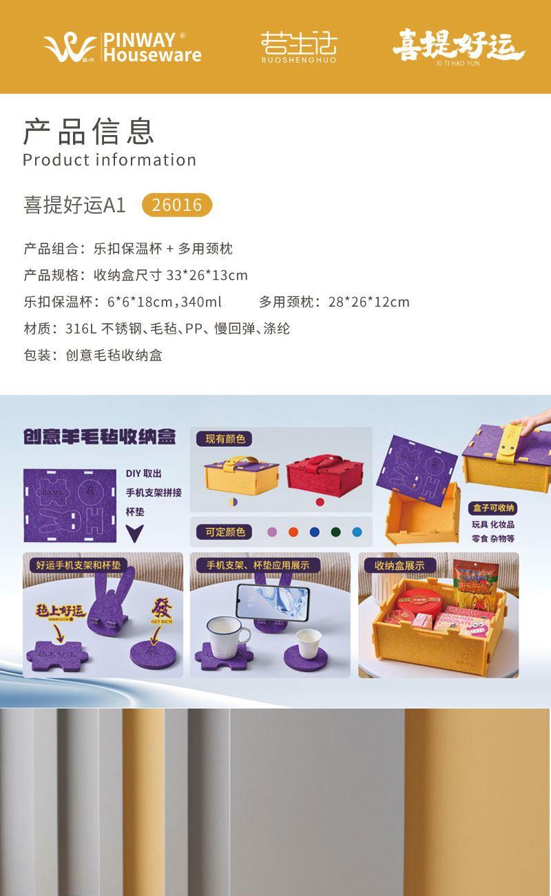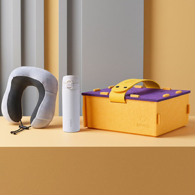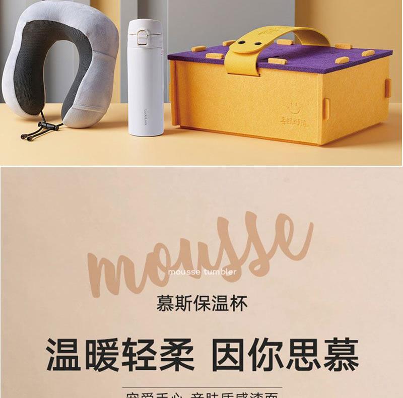 产品组合:乐扣保温杯+多用颈枕 产品规格:收纳盒尺寸33*26*13cm 乐扣保温杯:6*6*18cm,340ml 多用颈枕:28*26*12cm 材质:316L不锈钢、毛毡、PP、 慢回弹、涤纶 包装:创意毛毡收纳盒
