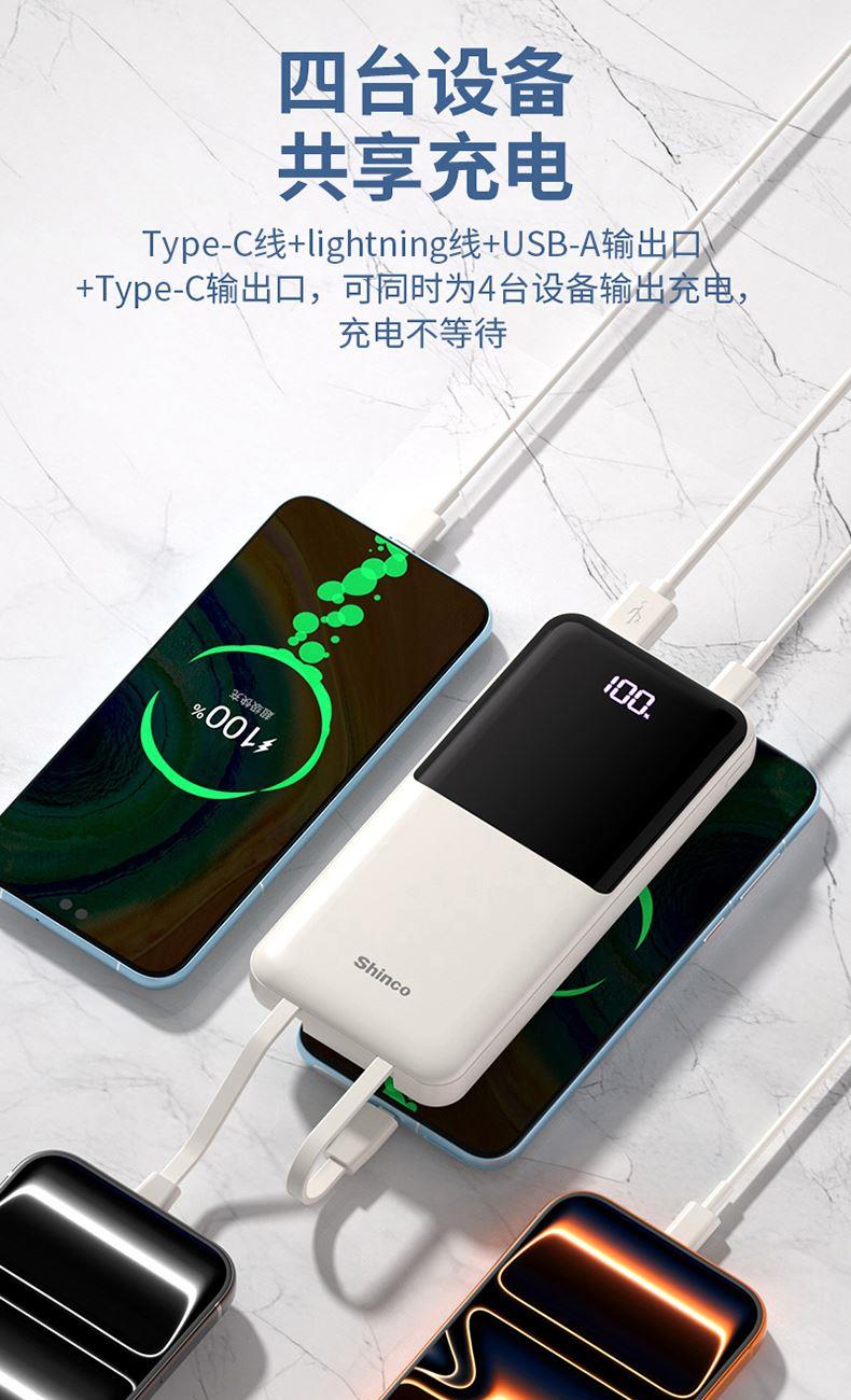 Type-C线+lightning线+USB-A输出口+Type-C输出口,可同时为4台设备输出充电,充电不等待