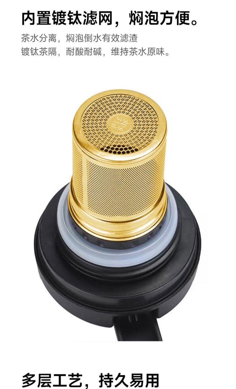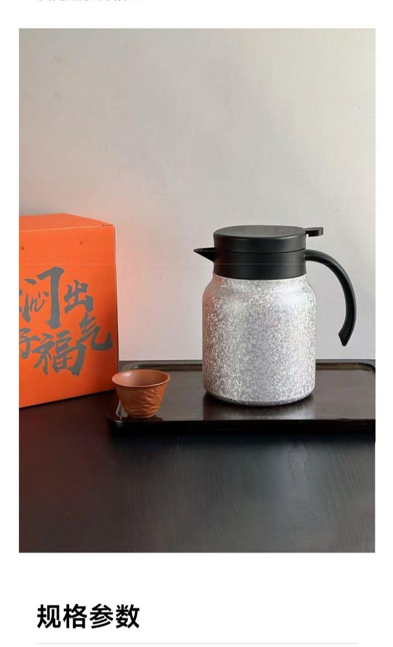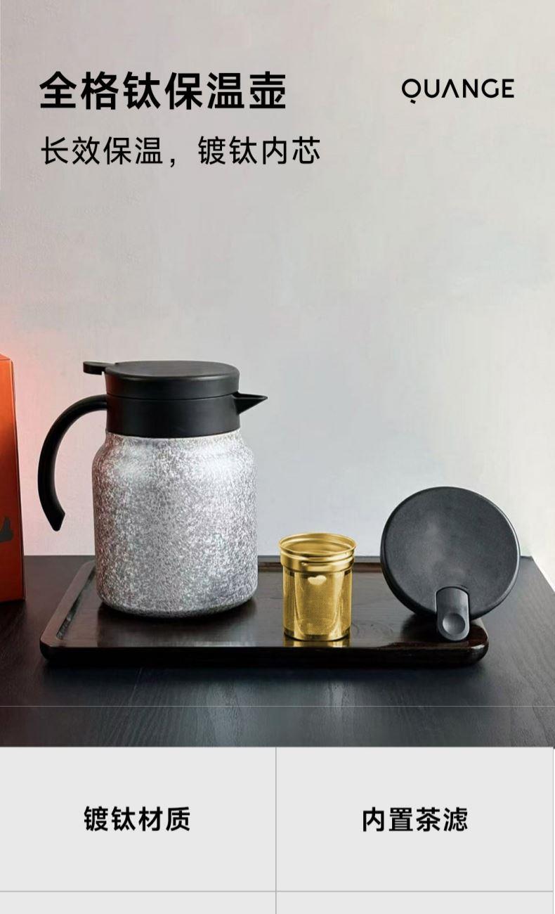颜色:雪花银 容量:1000mL 材质:内胆、茶滤、壶盖内塞:304+TI(镀钛),壶盖:食品级PP、硅胶 功能:按键出水 产品尺寸:φ11.5*16.7cm 彩盒包装,14*14*18.5cm 1.1000ml,离子镀钛内胆 2.内置茶滤,茶水分离,焖泡方便 3.多层工艺,持久易用
