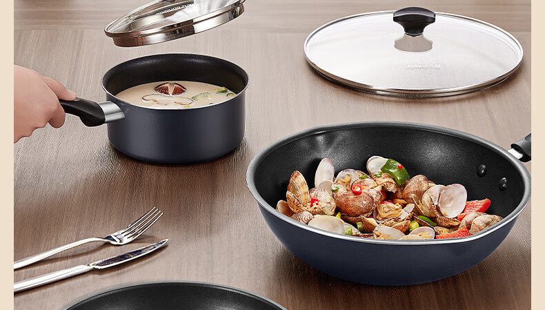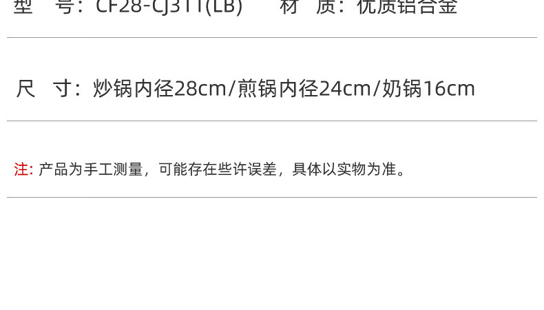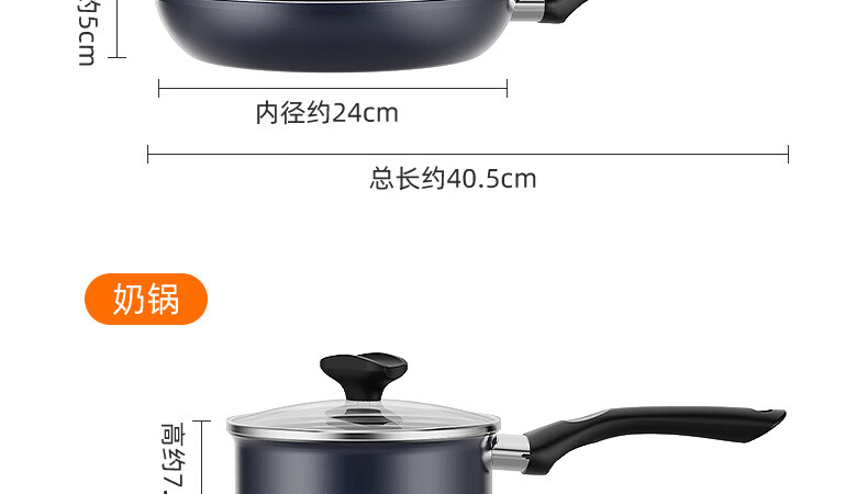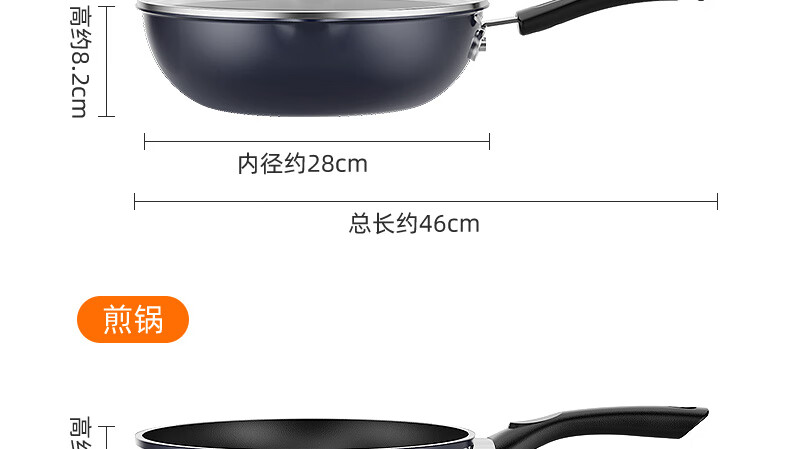 食品级不粘,一冲即净,轻烟少油。 专锅专用,不挑炉灶。 炒锅直径28cm 煎锅直径24cm 奶锅直径16cm