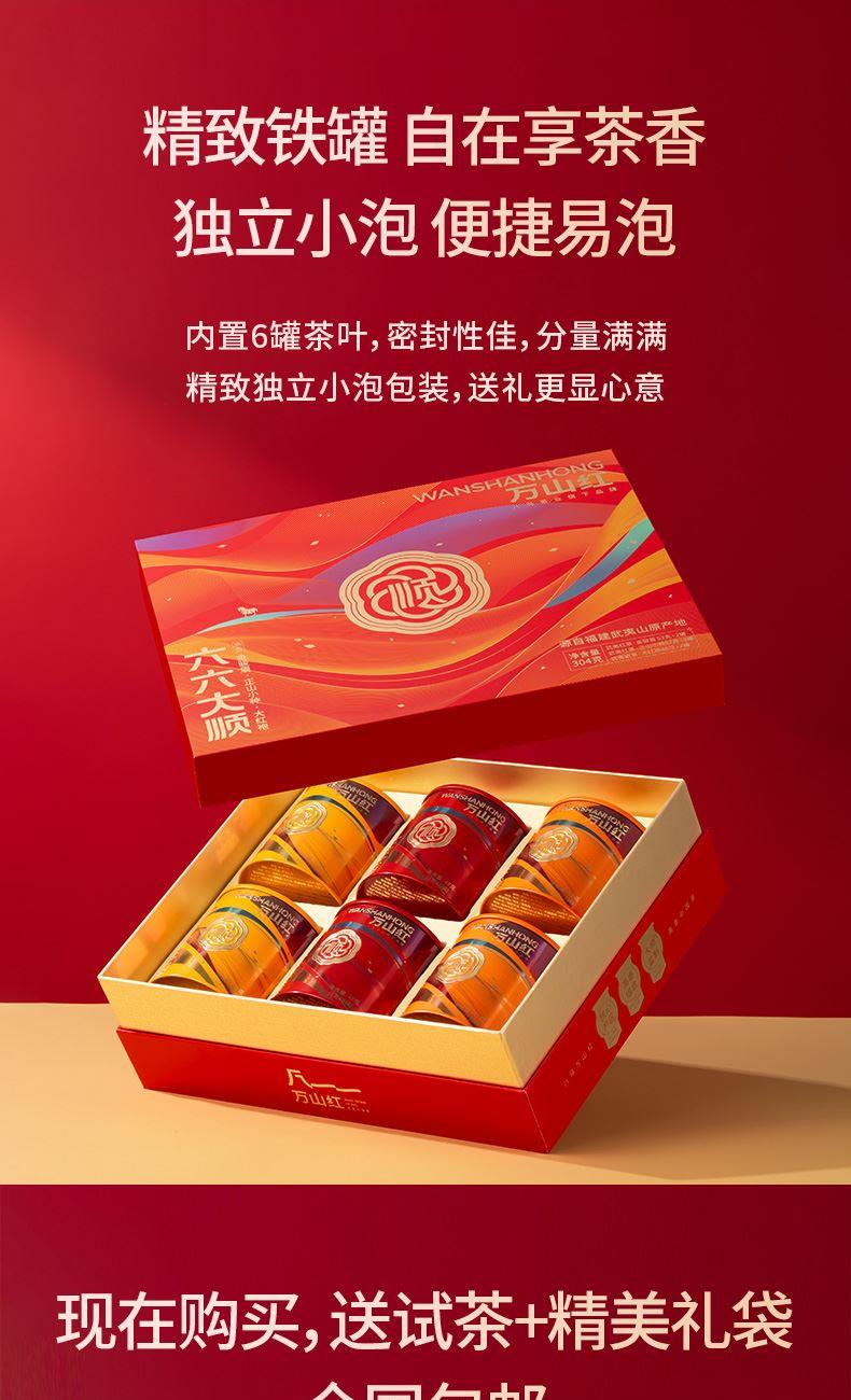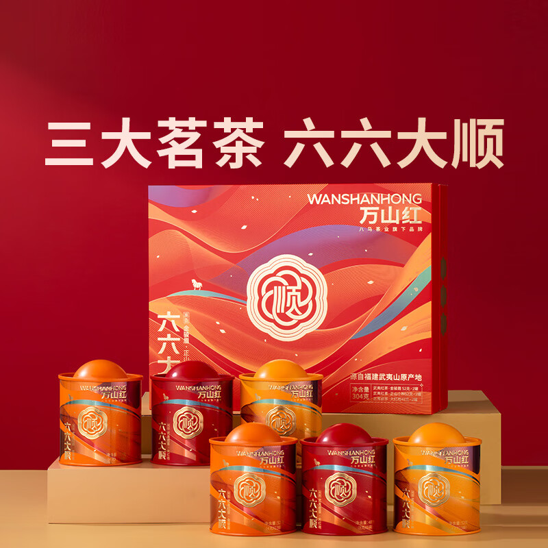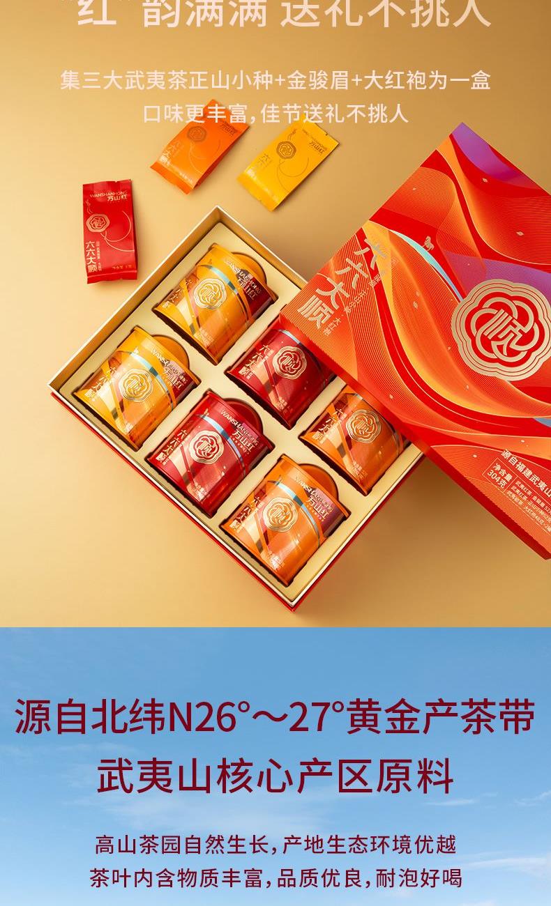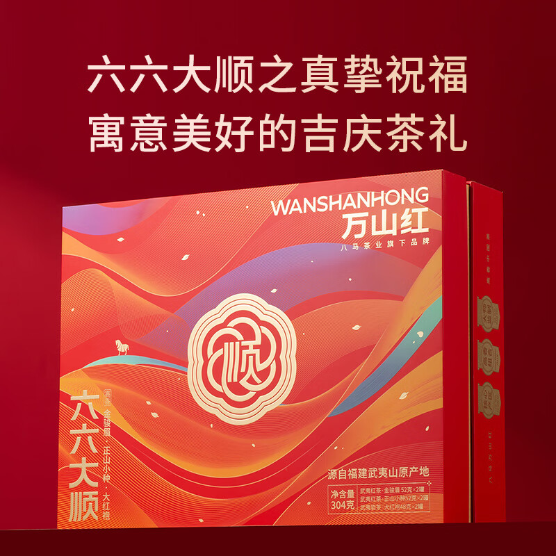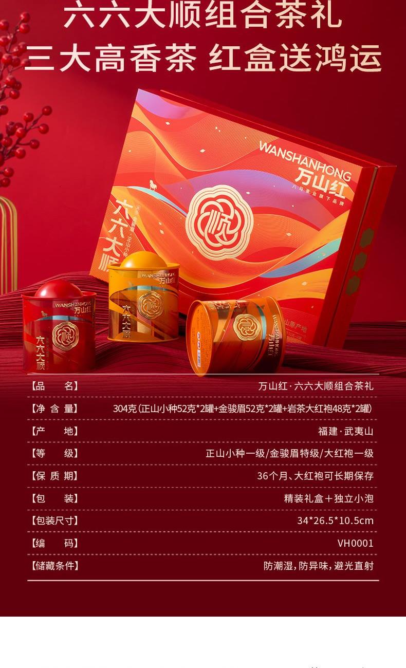 净含量:304克 大红袍48克X2罐; 金骏眉52克X2罐; 正山小种52克X2罐 备注:大红袍在贮藏条件条件下,可长期保存;金骏眉36个月,正山小种36个月