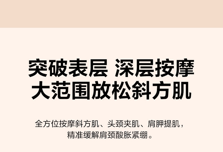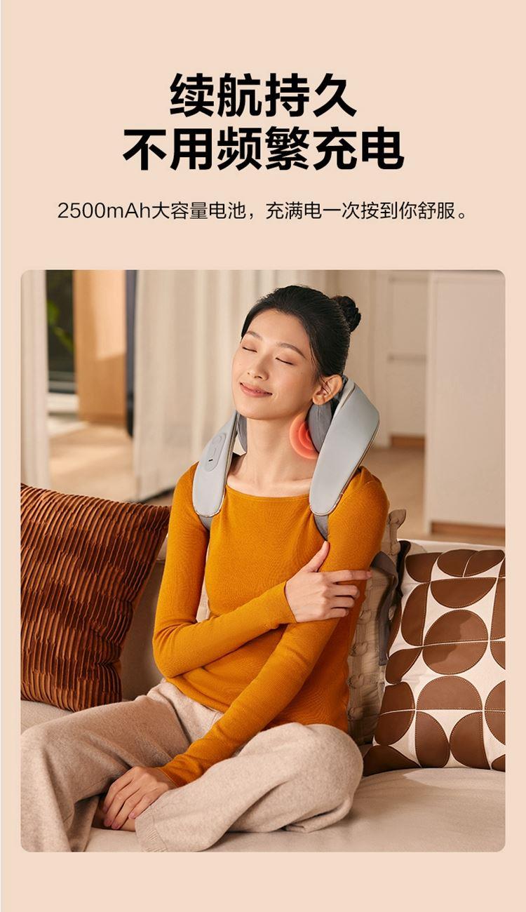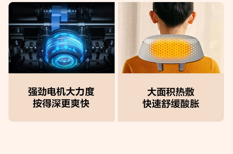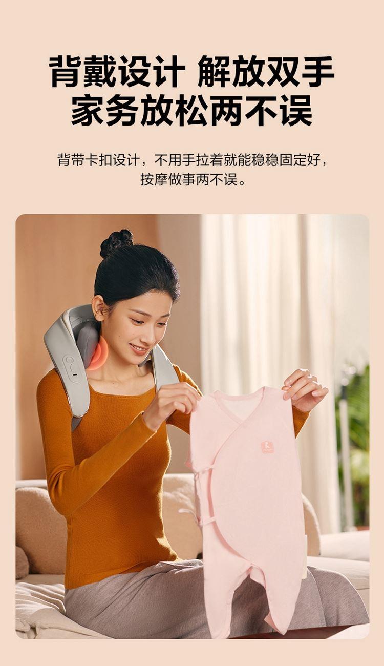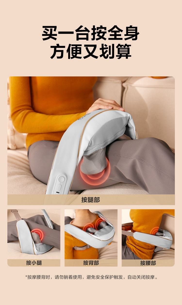 产品描述: 颈椎夹揉,斜方肌推揉 特殊传动机构 肩背式一体化设计 硅胶可回弹按摩头 布套可拆卸水洗 颈、腿、腰全身可用 产品参数: 机身材质:PU皮革 电源电压:5V/10W 充电接口:type-C 控制方式:机身按键 语音播报:无 电池容量:2500mAh锂电池 续航时间:4次(60分钟) 按摩时间:15分钟 按摩模式:3种 热敷档位:2档 温度挡位:41/45 ℃ 单台毛重/净重:1.4/1.15kg 彩箱尺寸:245*178*162mm